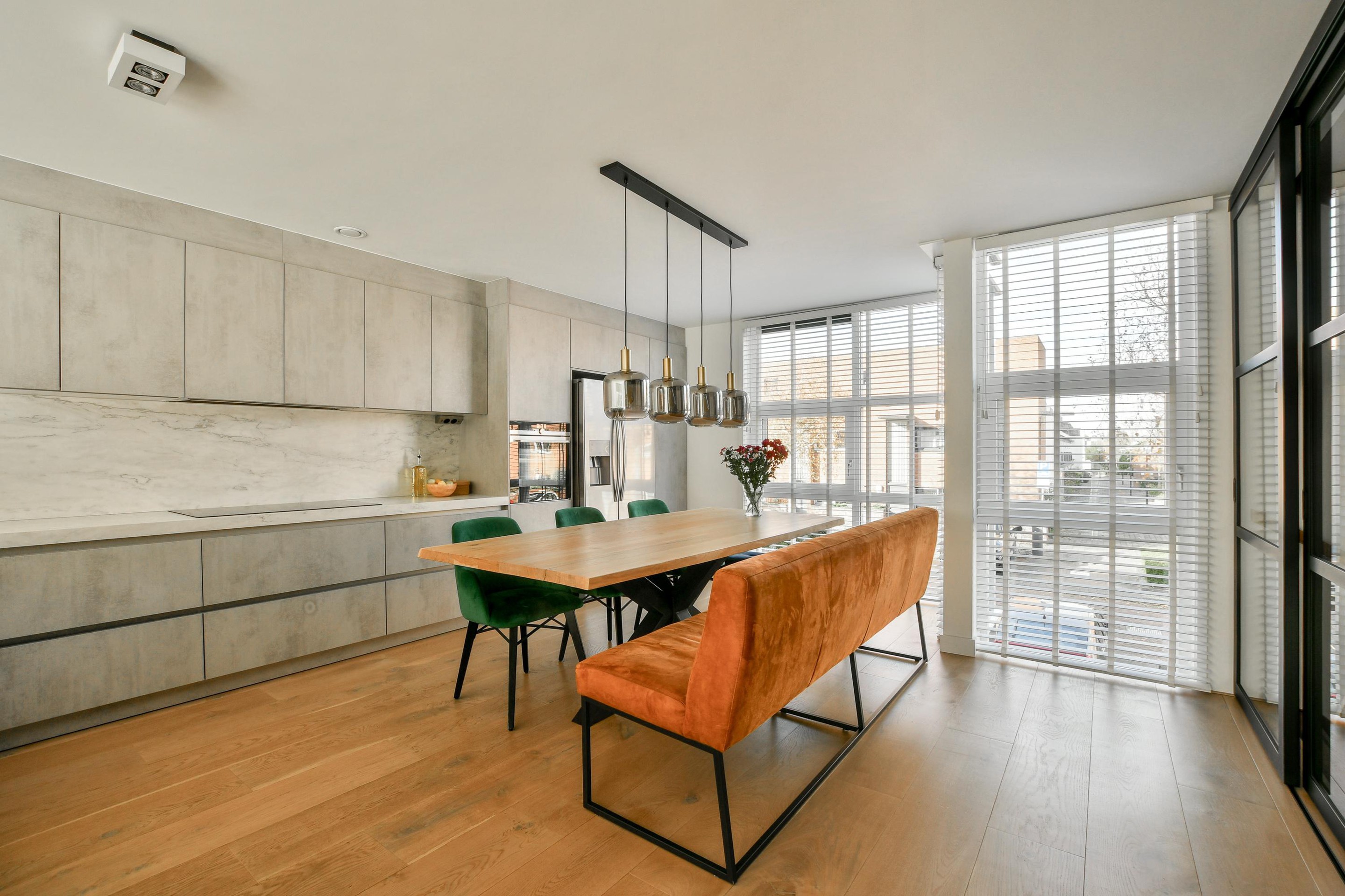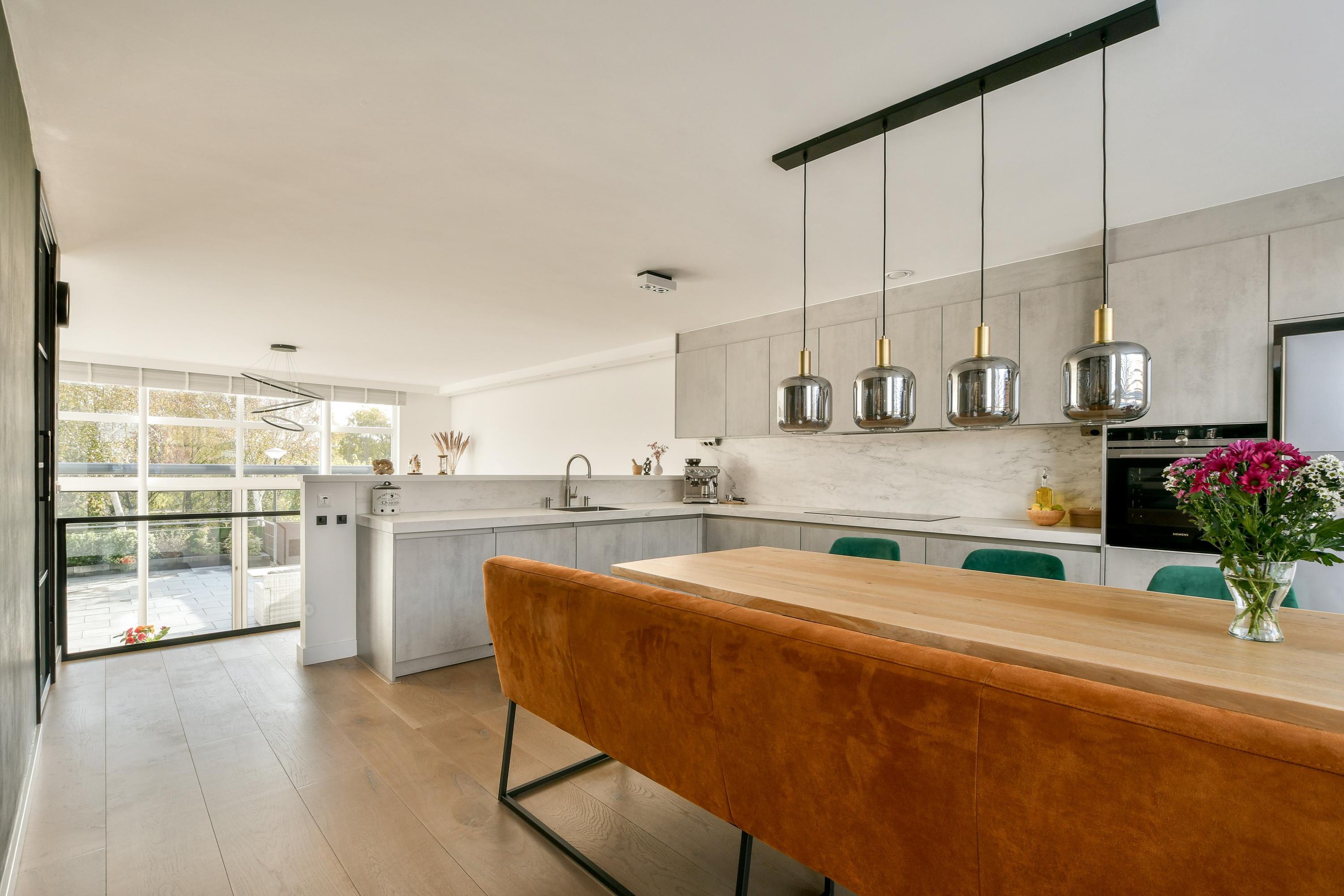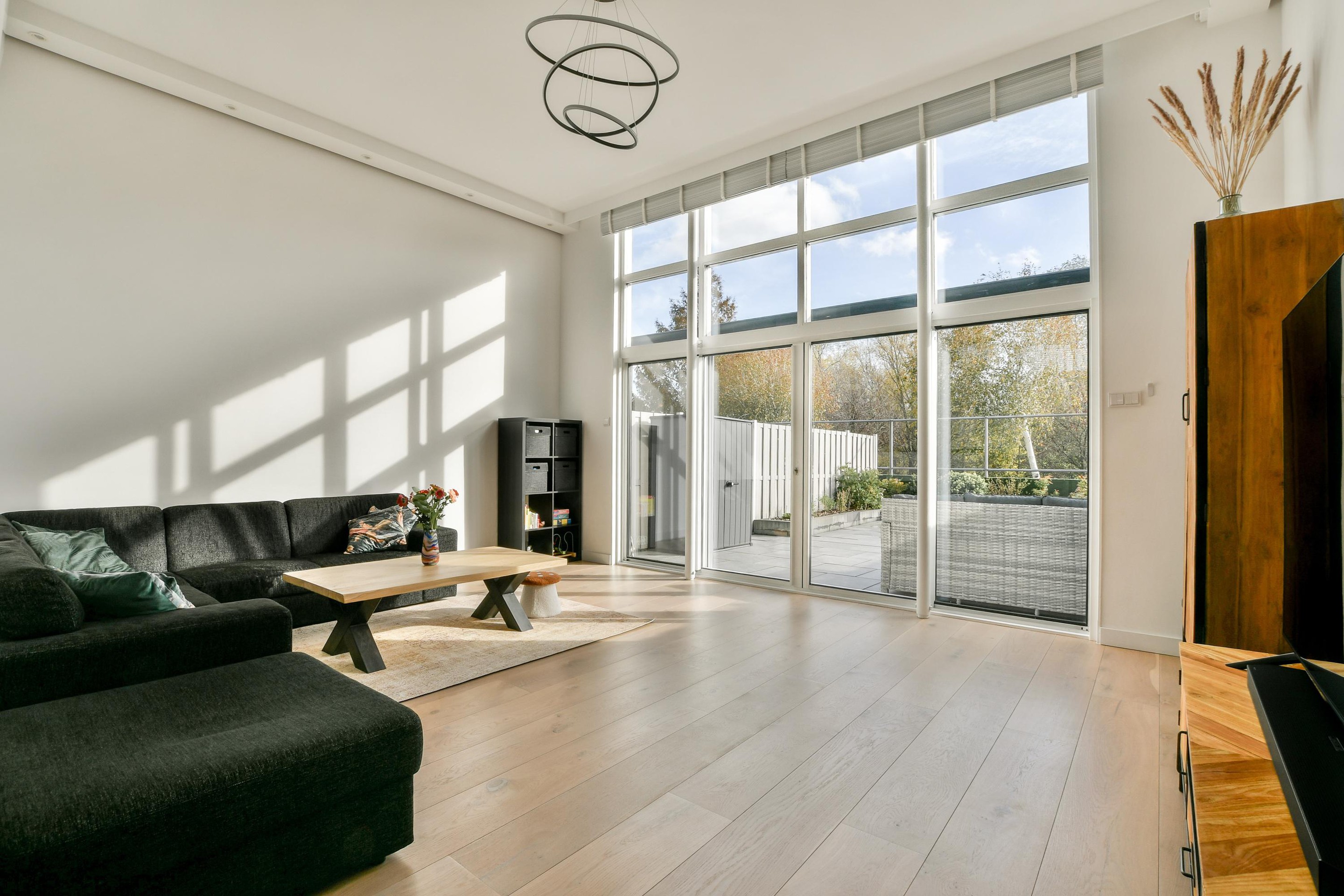 The kitchen and all sanitary facilities were fully renewed in 2021. The kitchen has a modern design and is fitted with high-quality built-in appliances, including a Quooker with a 7-litre boiler. The bathrooms, also installed in 2021, have a luxurious feel with beautiful materials and contemporary finishes. Both the living room and the kitchen feature a beautiful wooden floor. In the living room, steel railings and staircases create a stylish, industrial look, while the steel sliding doors between the kitchen and living area perfectly complement the home’s high-quality finish.