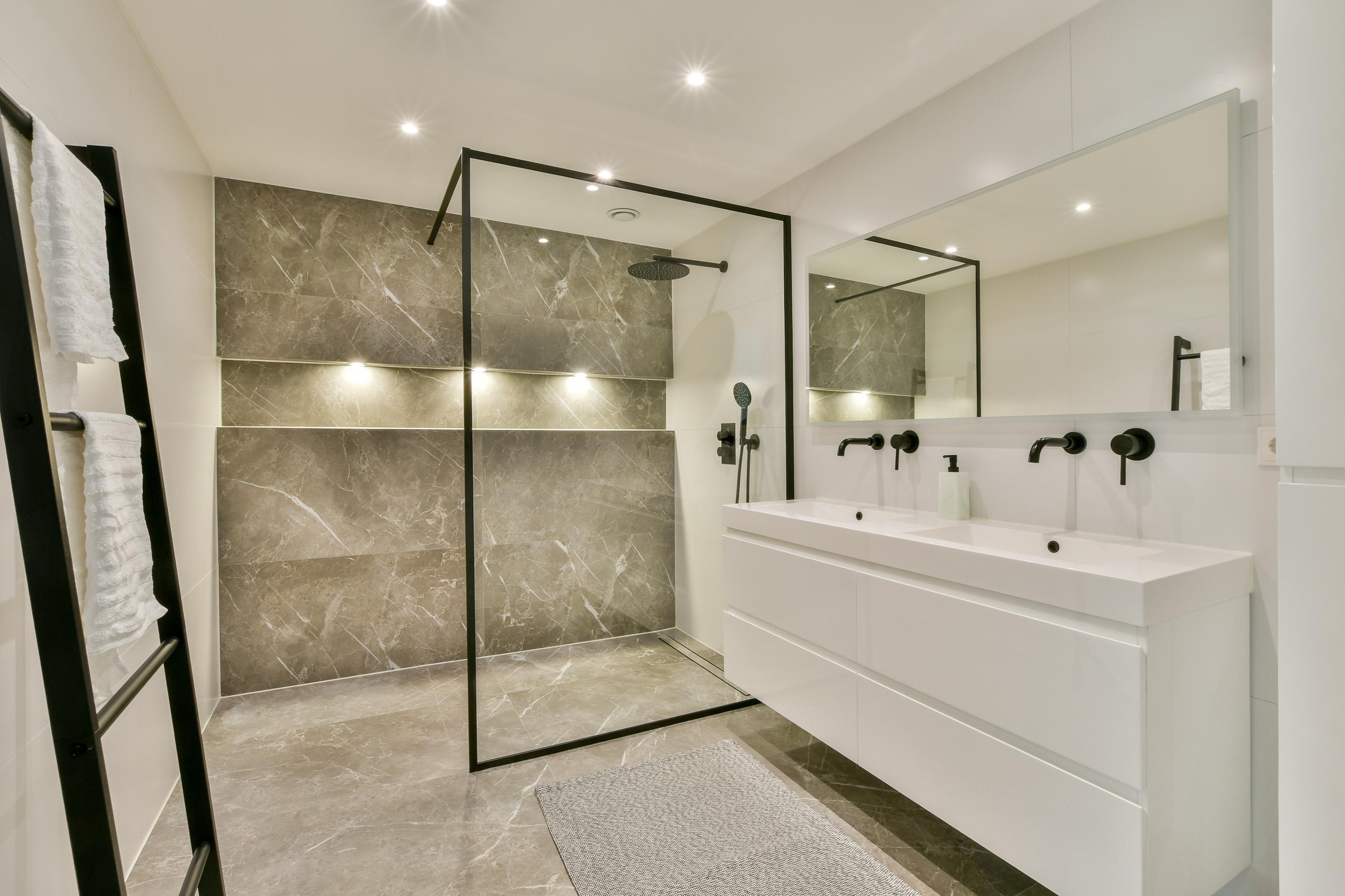 Op de tweede verdieping liggen drie grote slaapkamers, twee aan de tuinzijde en één aan de voorkant van de woning. De centrale badkamer is modern uitgevoerd met een ruime inloopdouche en een elegant wastafelmeubel met dubbele wastafel. Op deze verdieping bevinden zich tevens een separaat toilet en een praktische wasruimte met plek voor een wasmachine en droger.