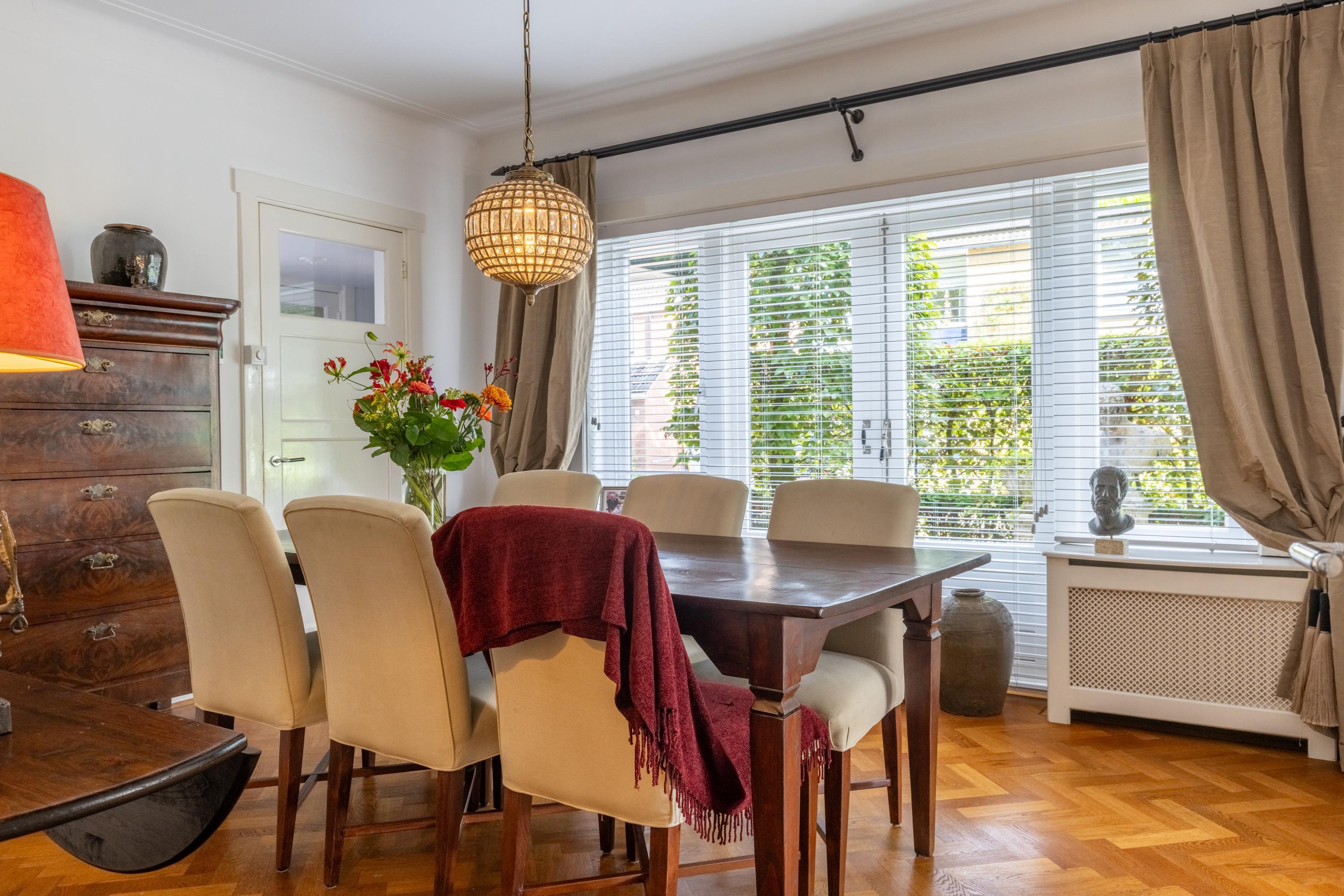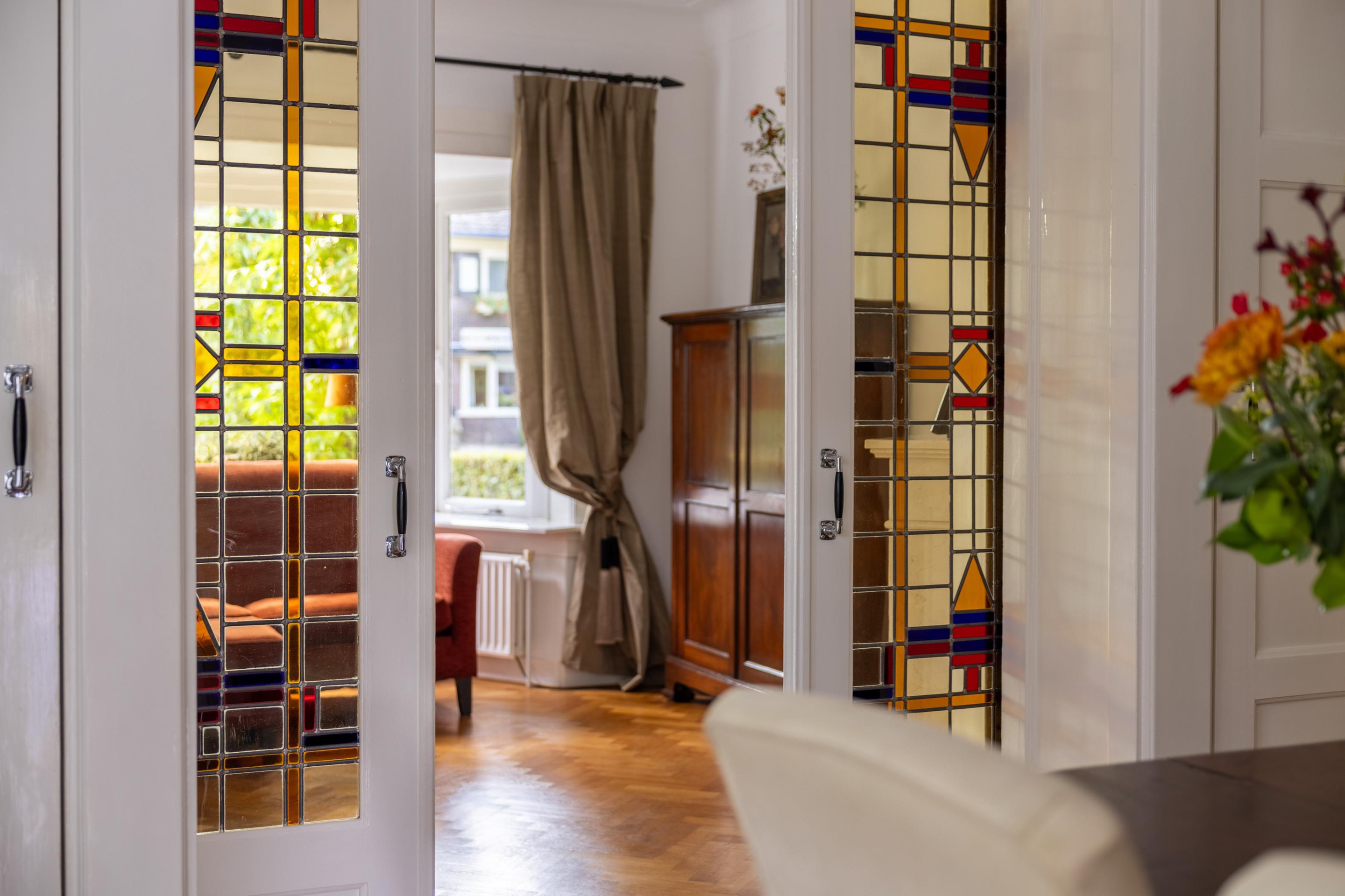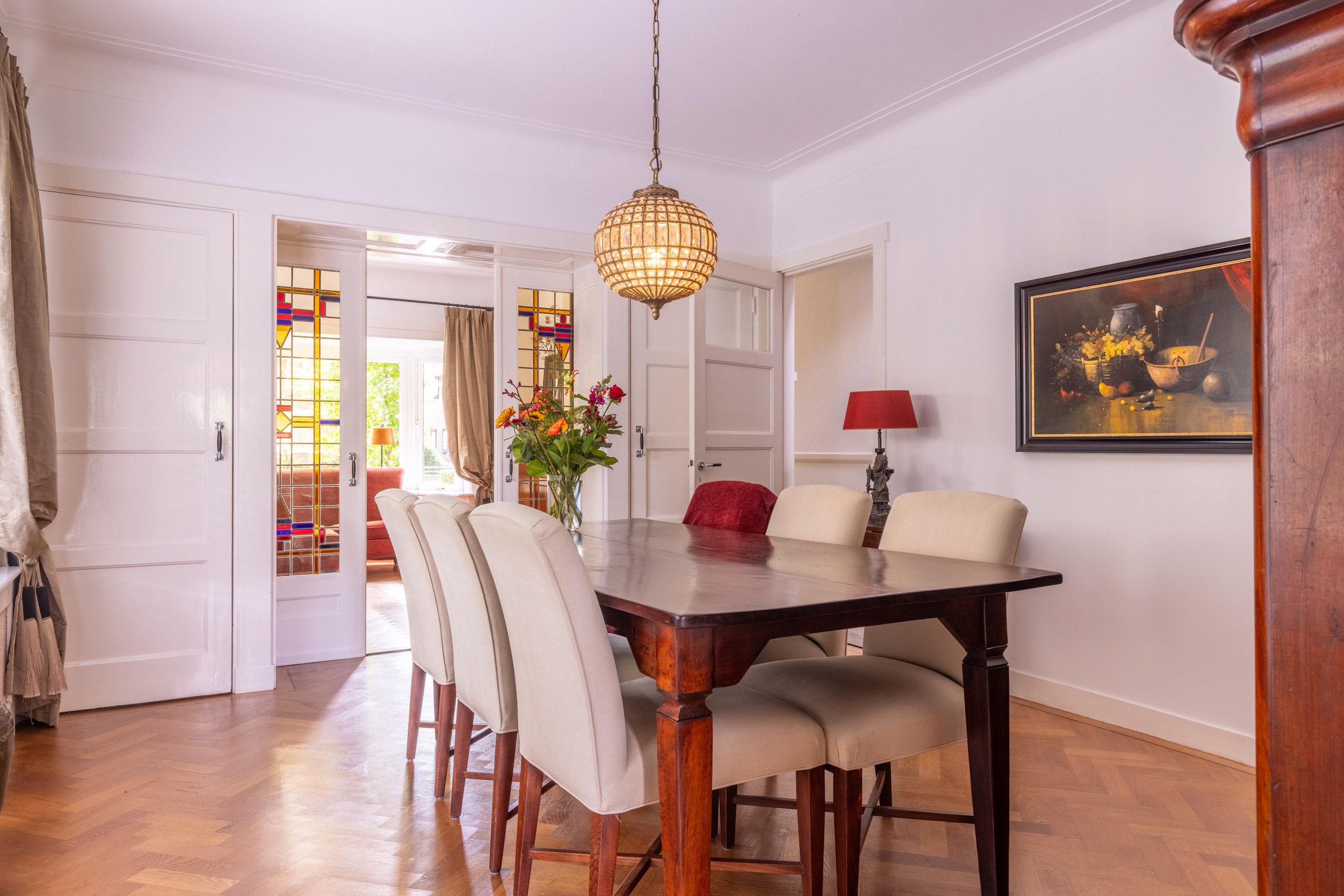 Al bij de eerste aanblik vallen de typische jaren ’30 kenmerken op: het markante overstek, de sfeervolle erker en de glas-in-loodramen. Binnen gaat de charme naadloos verder. In de hal vindt u de prachtige granito vloer en toegang tot de eetkamer met vaste kasten, paneeldeuren en een stijlvolle visgraat parketvloer. De openslaande deuren zorgen voor veel licht en een vloeiende verbinding met de tuin.