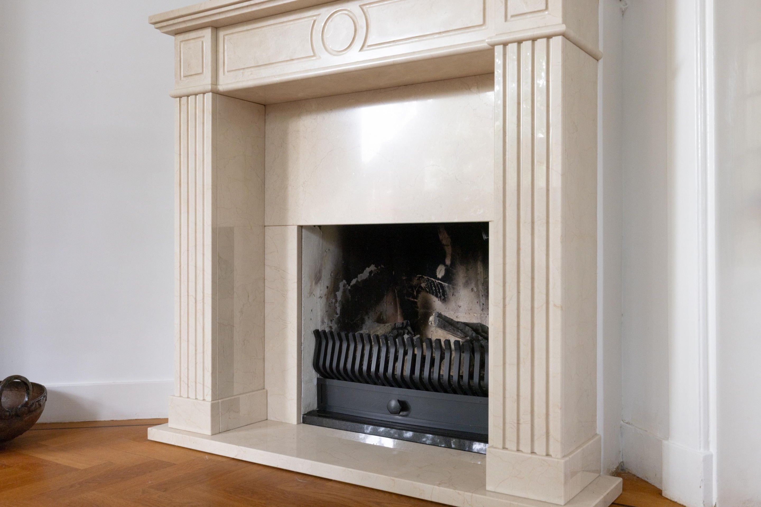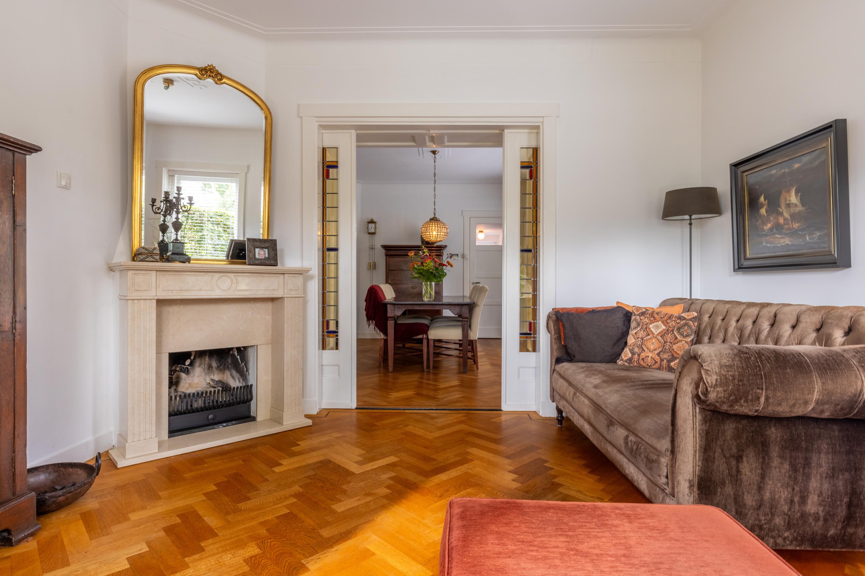 De klassieke kamer en suite met glas-in-lood schuifdeuren verbindt de eetkamer met de woonkamer. Ook hier treft u de visgraatvloer, een sfeervolle open haard en een erker die het daglicht rijkelijk binnenlaat.