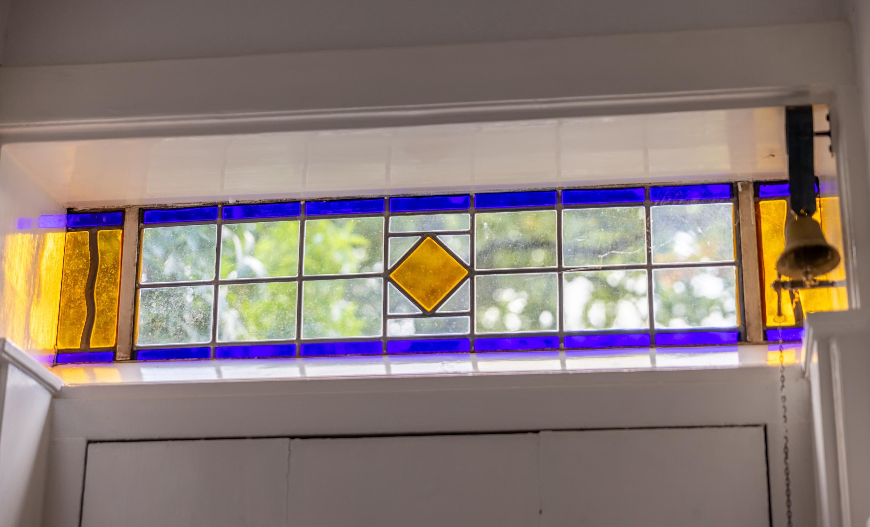 Glas-in-lood, erker en klassieke kamer en suite met schuifdeuren