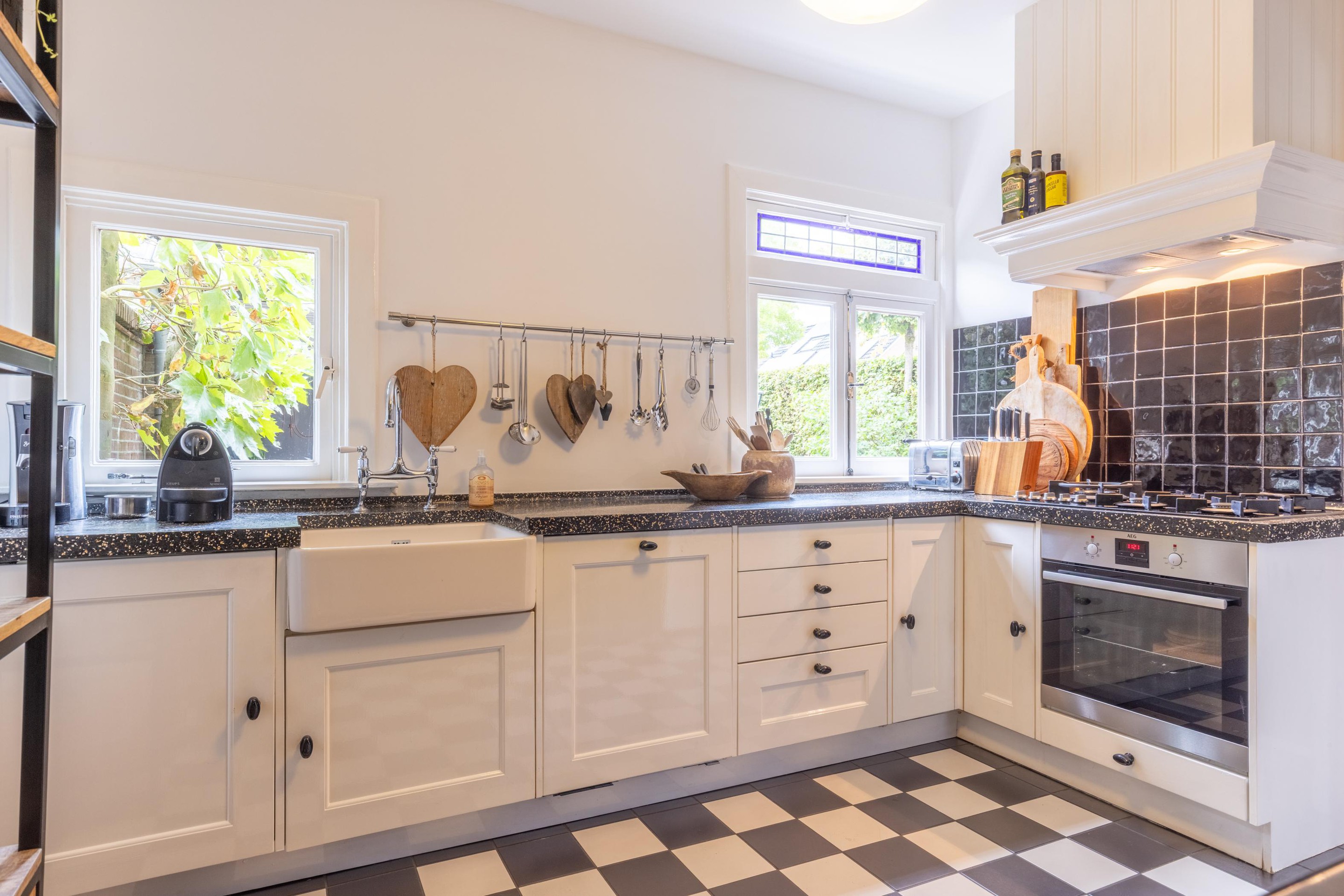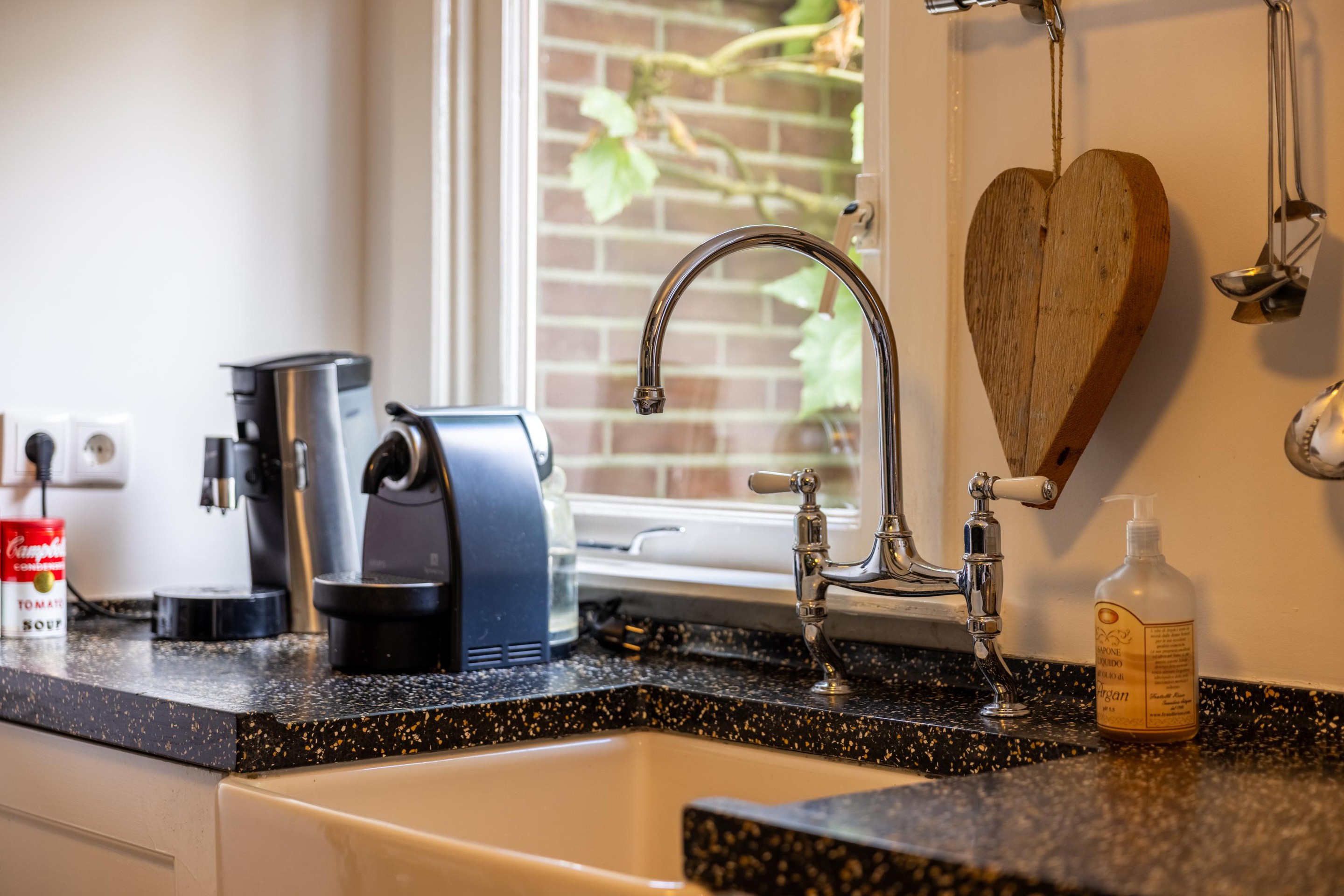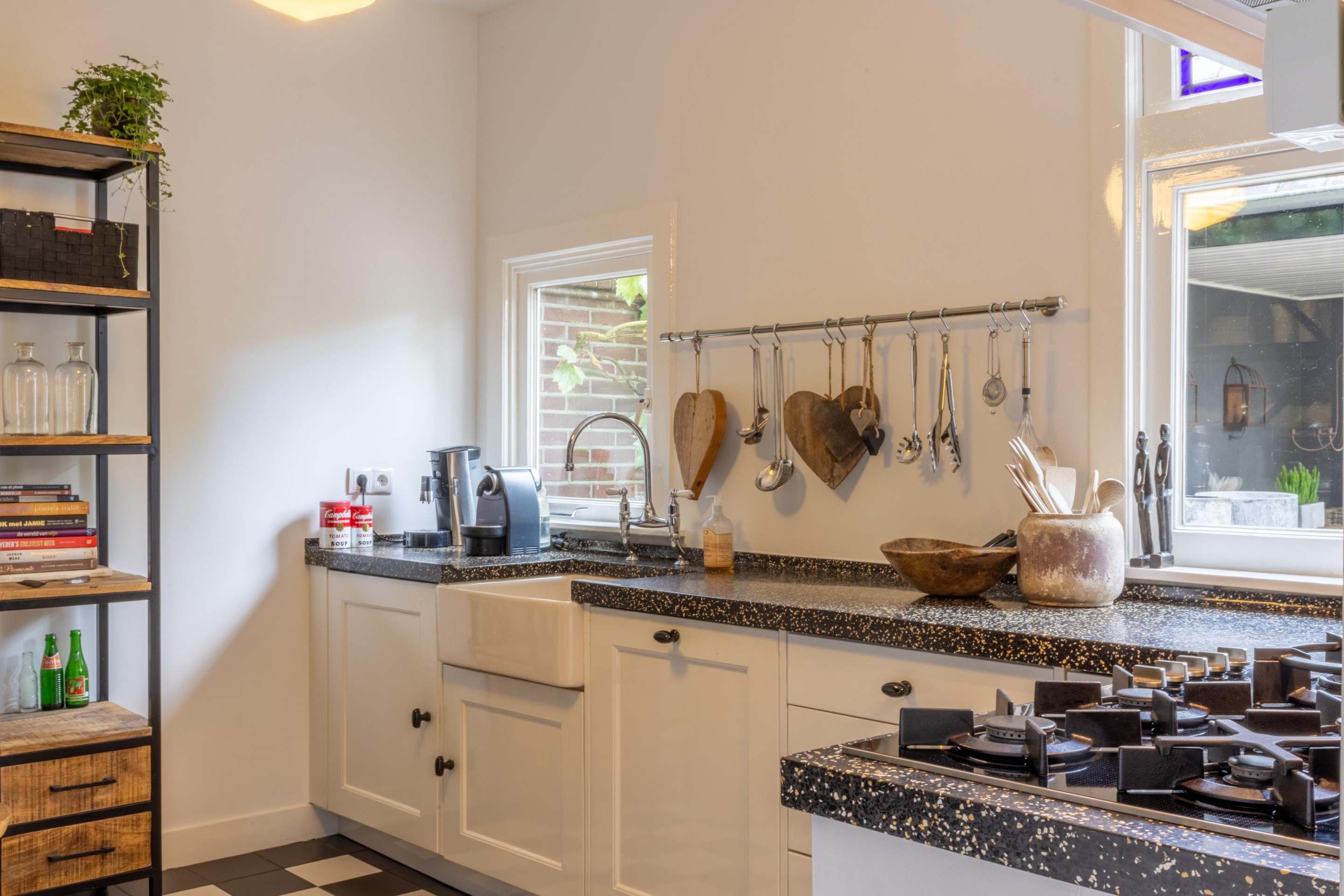 Aan de achterzijde bevindt zich de uitbouw, met een toilet, zij-entree en toegang tot de stijlvolle keuken. Deze is voorzien van een granieten aanrechtblad, diverse inbouwapparatuur en biedt toegang tot de praktische provisiekelder.