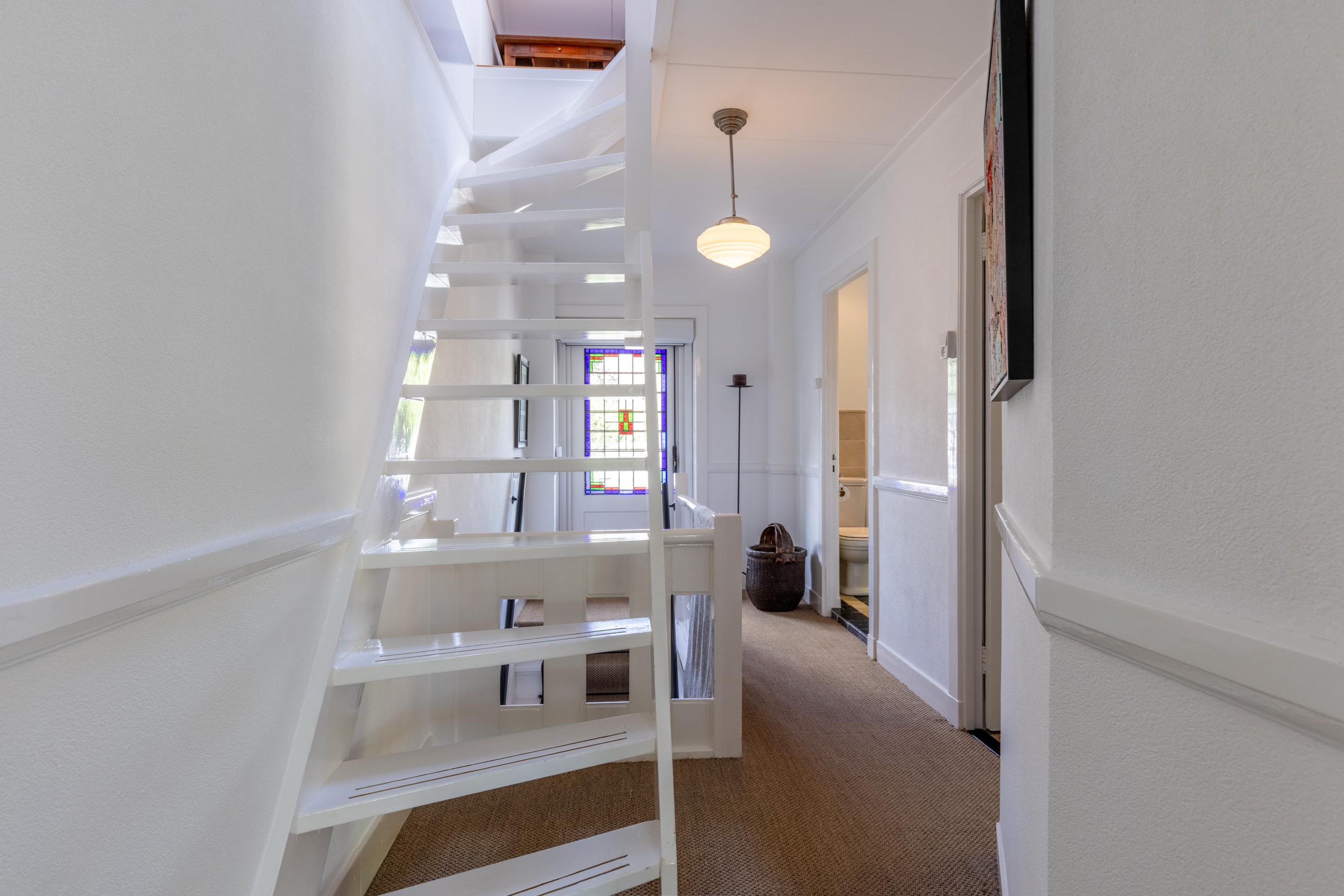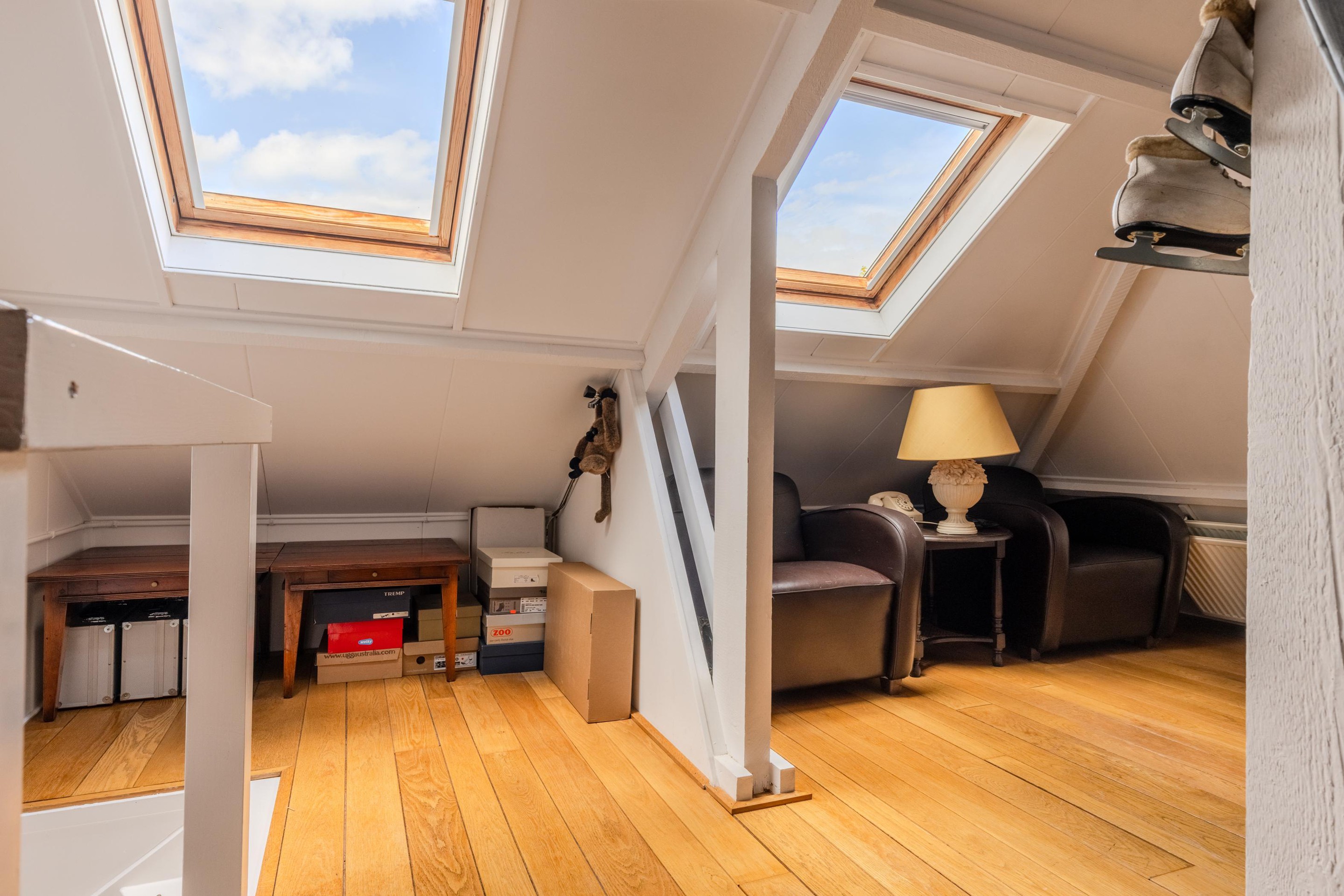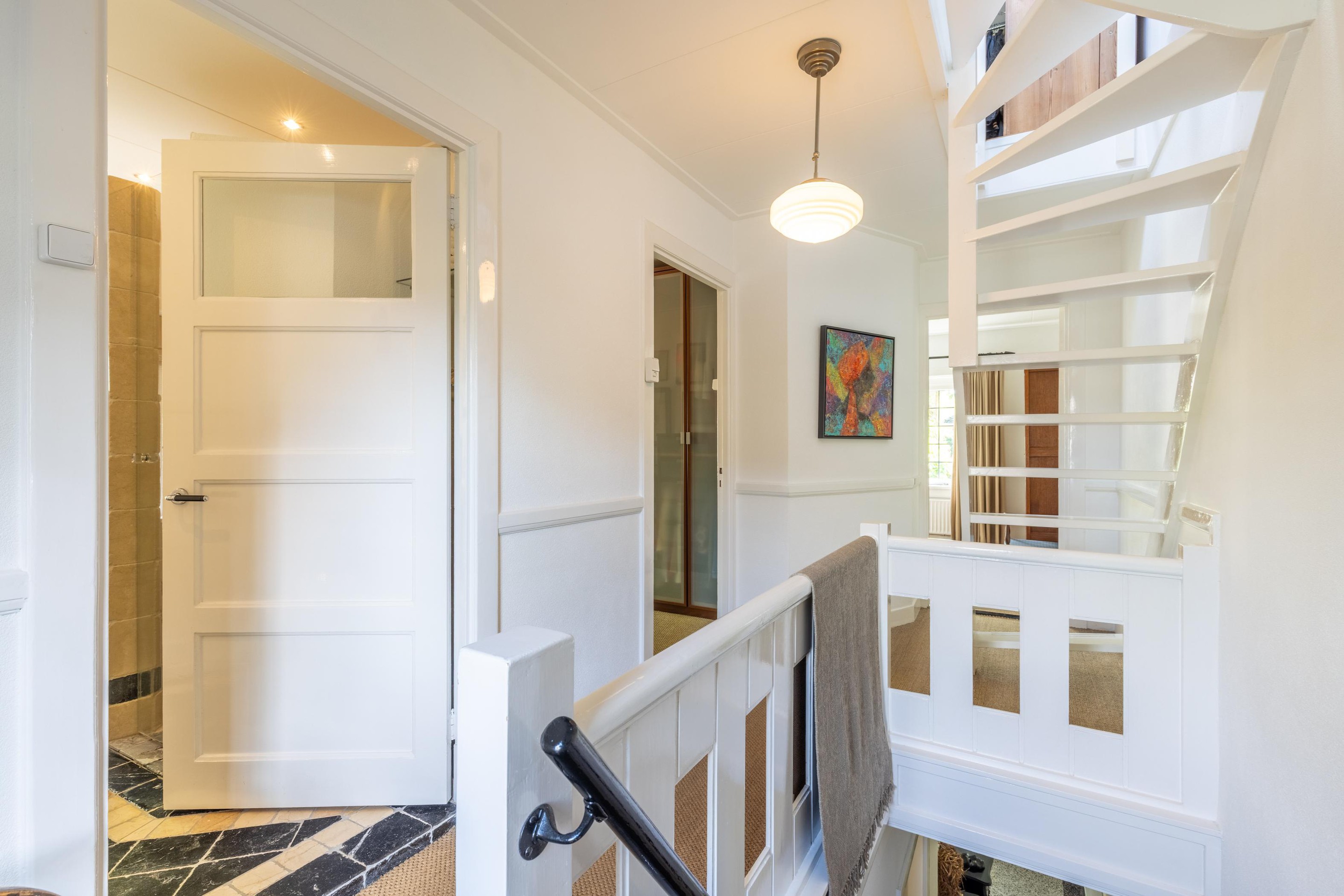 Via de elegante trap bereikt u de eerste verdieping. Op de charmante overloop met glas-in-lood vindt u een fijne kinderkamer, een ruime hoofdslaapkamer en toegang tot het platte dak. Ook is hier een stijlvolle badkamer met tweede toilet, hoekbad, inloopdouche en wastafel. Tevens bereikt u via een luik extra bergruimte. De lichtinval en details benadrukken ook op deze verdieping het karakter van de woning.