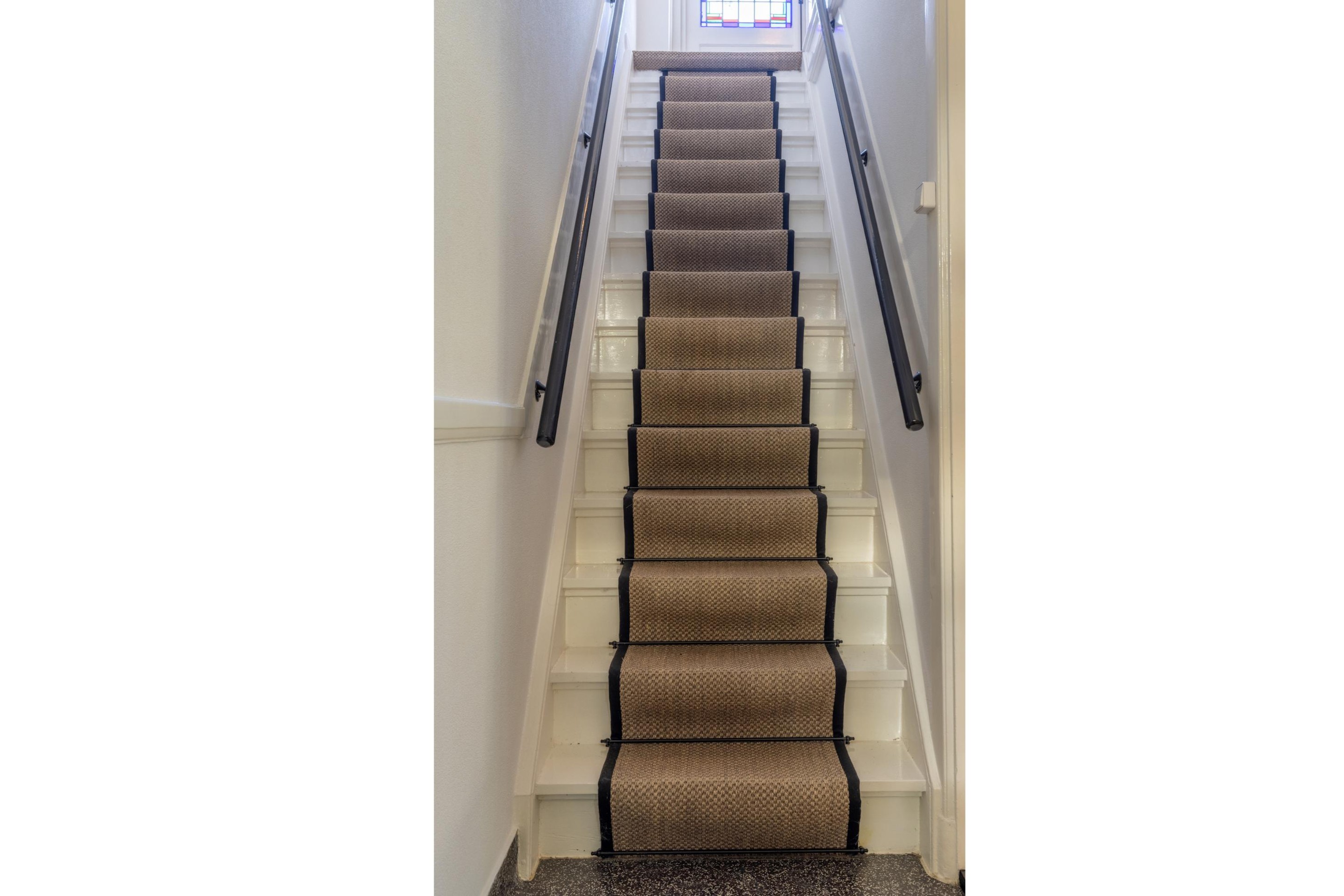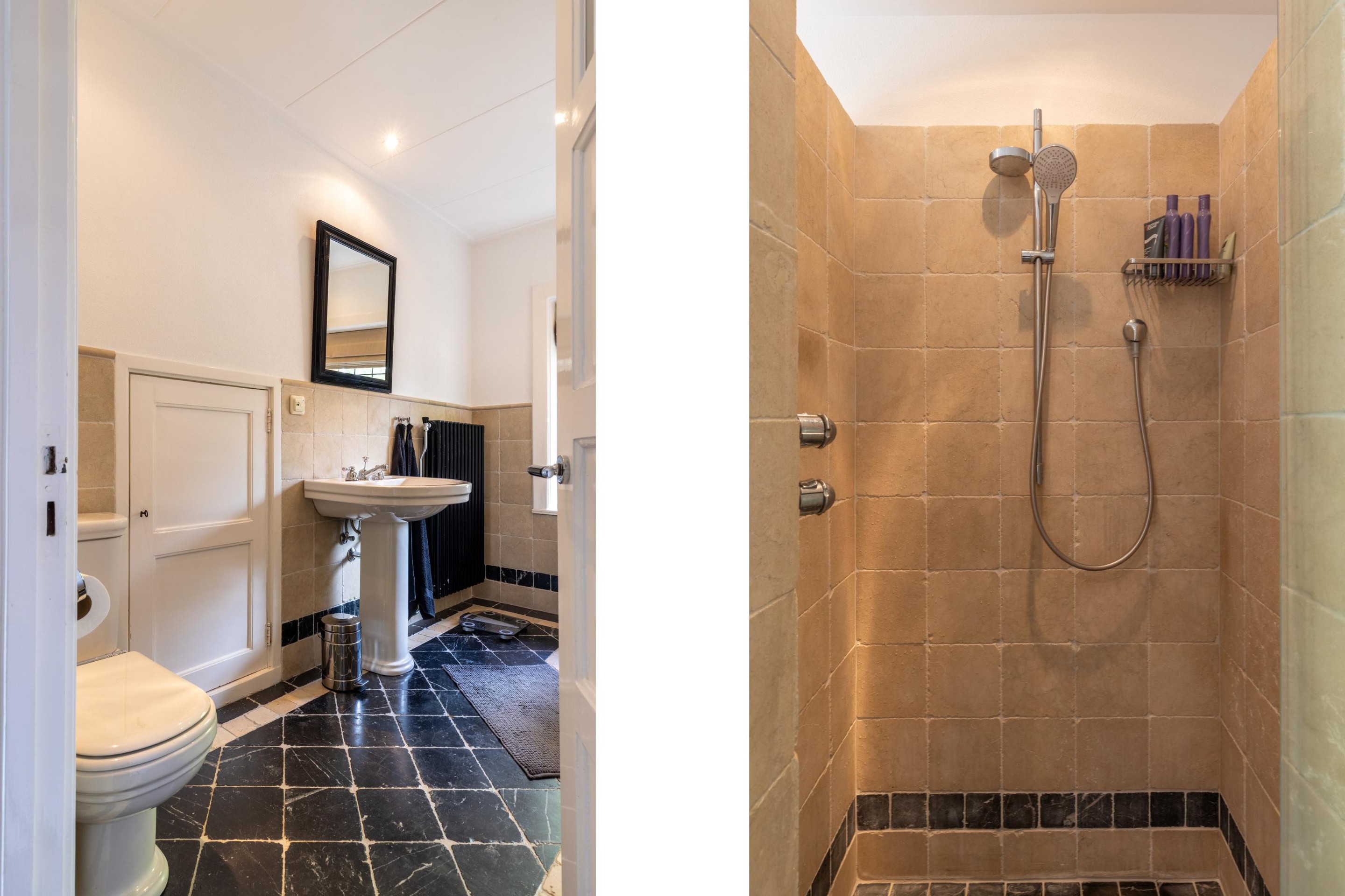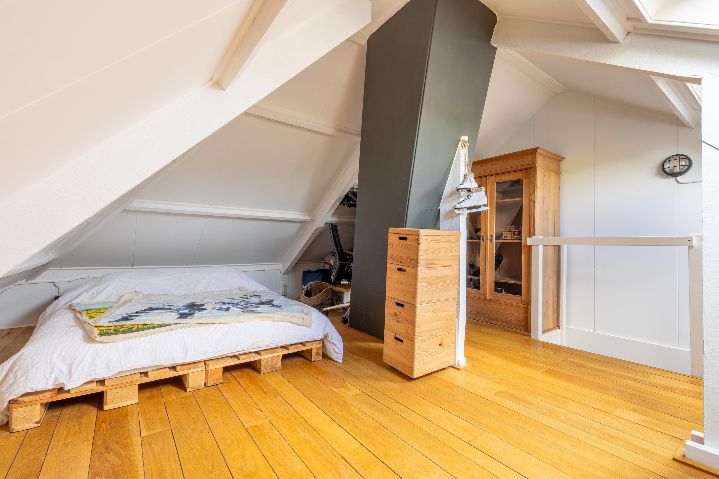Via de elegante trap bereikt u de eerste verdieping. Op de charmante overloop met glas-in-lood vindt u een fijne kinderkamer, een ruime hoofdslaapkamer en toegang tot het platte dak. Ook is hier een stijlvolle badkamer met tweede toilet, hoekbad, inloopdouche en wastafel. Tevens bereikt u via een luik extra bergruimte. De lichtinval en details benadrukken ook op deze verdieping het karakter van de woning.