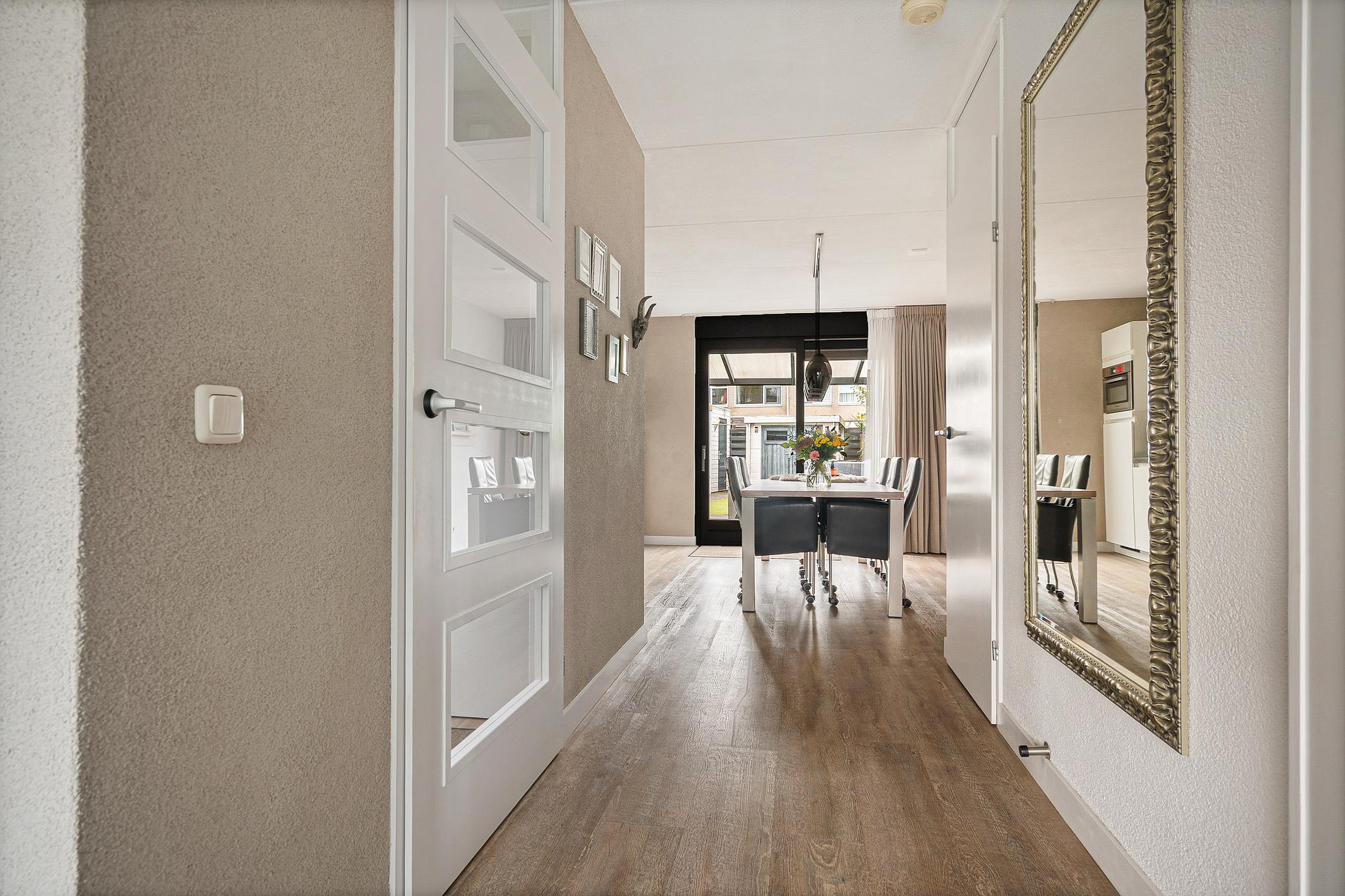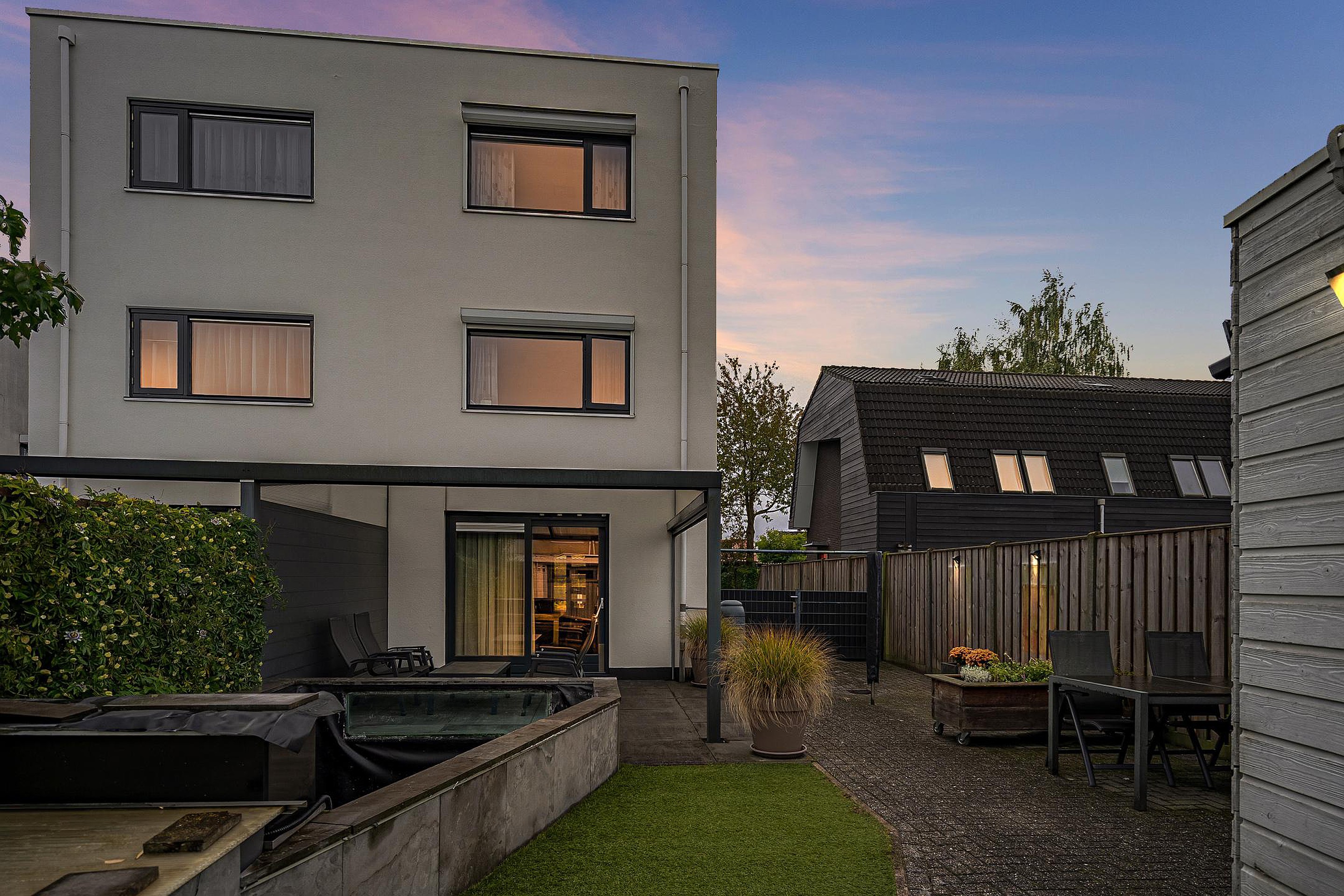 De zonnige achtertuin beschikt over een fijne veranda: een heerlijke plek om te ontspannen, te eten of gezellig te borrelen. Achter in de tuin bevindt zich de praktische garage en berging.