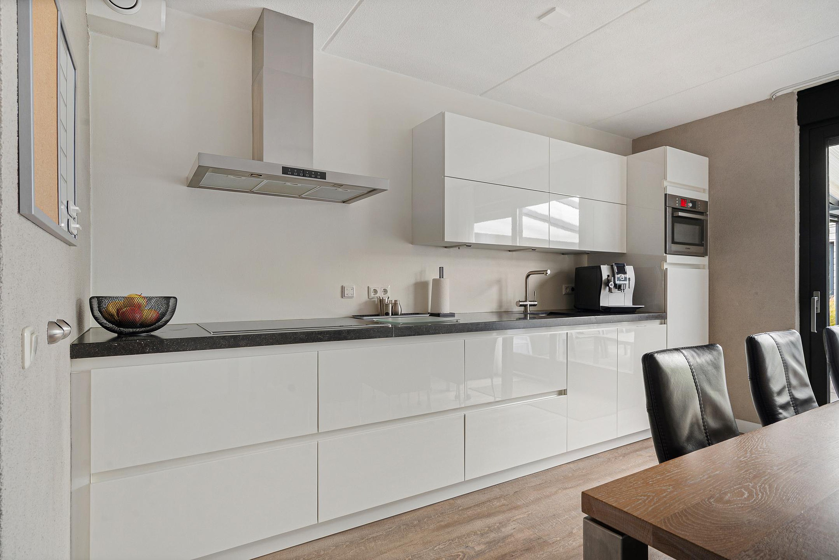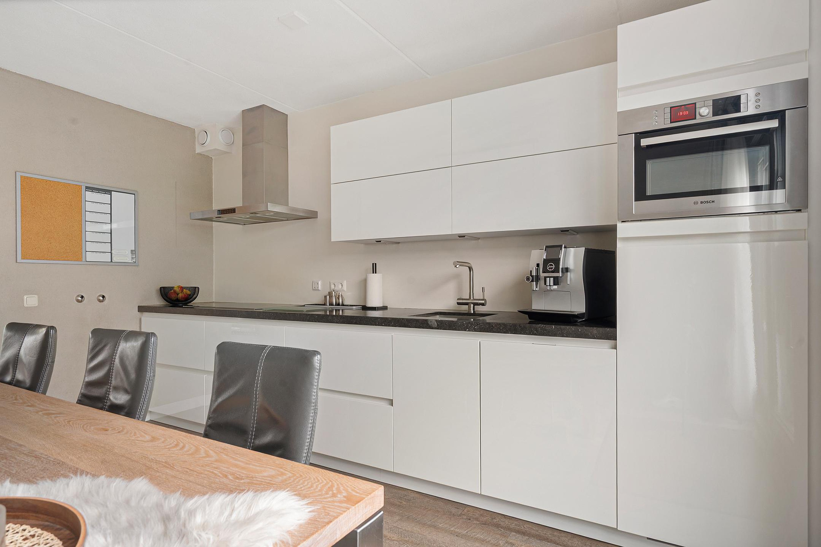 Aan de achterzijde bevindt zich de ruime woonkeuken, uitgevoerd in een neutrale, moderne stijl en voorzien van diverse inbouwapparatuur. De grote schuifpui geeft direct toegang tot de tuin, waardoor binnen en buiten naadloos in elkaar overlopen.