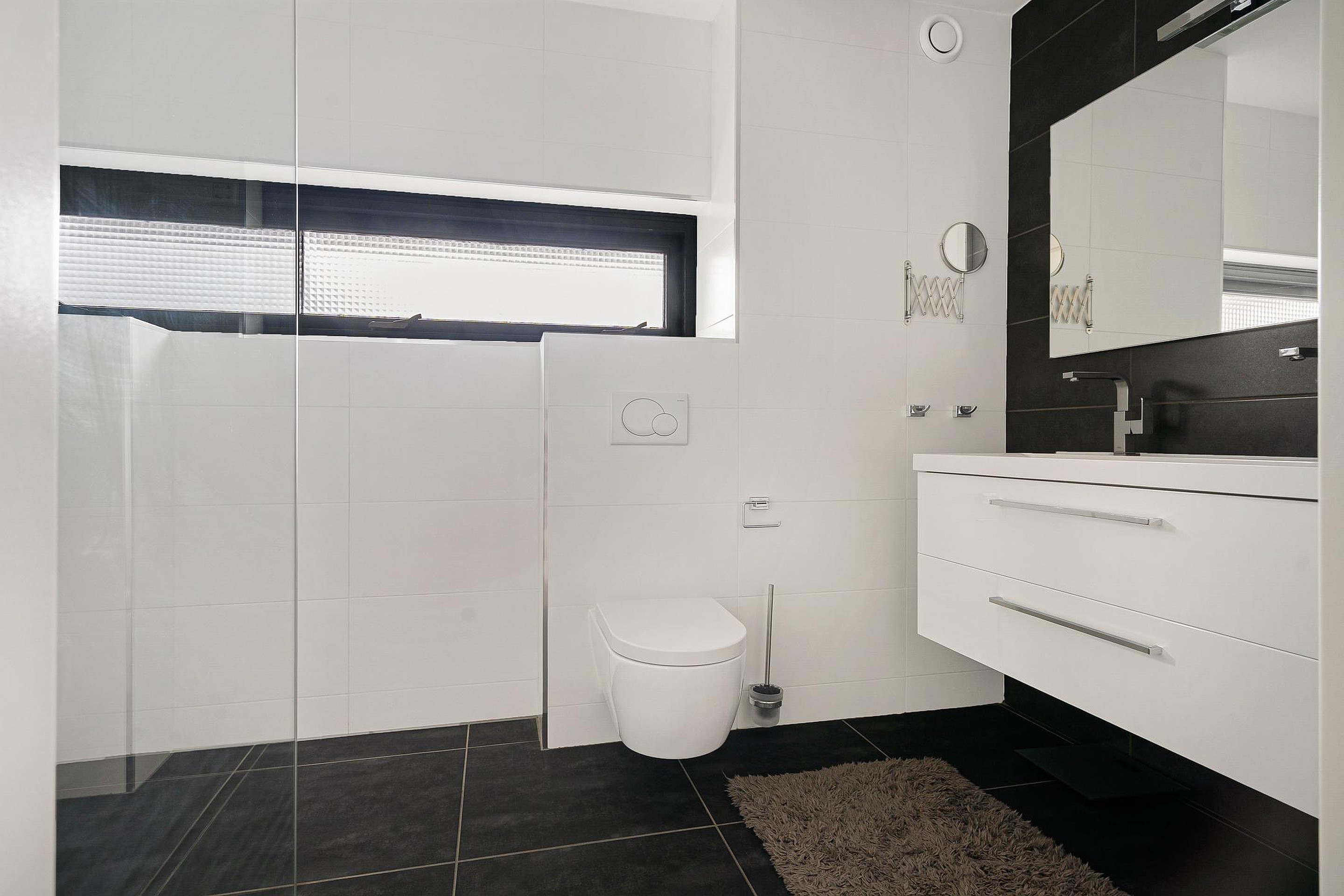 Op de eerste verdieping bevinden zich twee ruime slaapkamers en een moderne badkamer met inloopdouche, dubbele wastafel en tweede toilet. Alles netjes afgewerkt en praktisch ingedeeld.