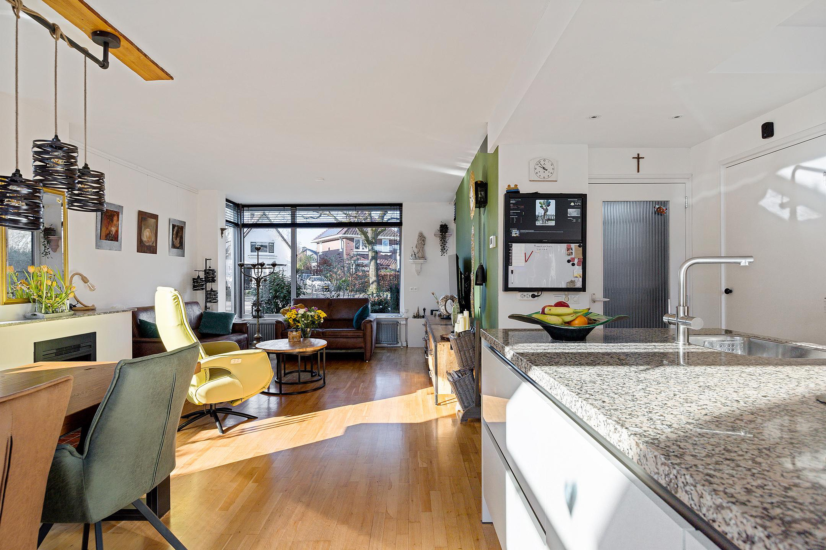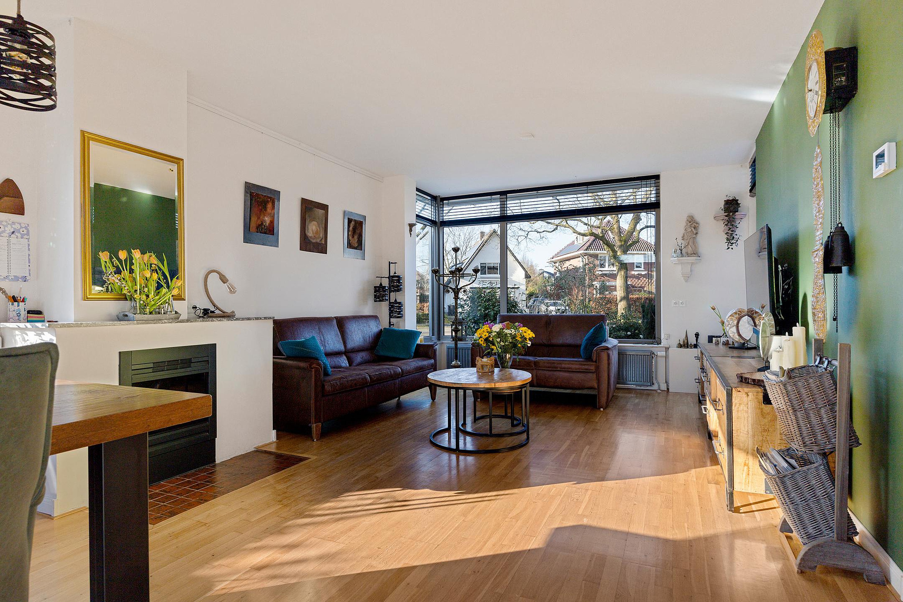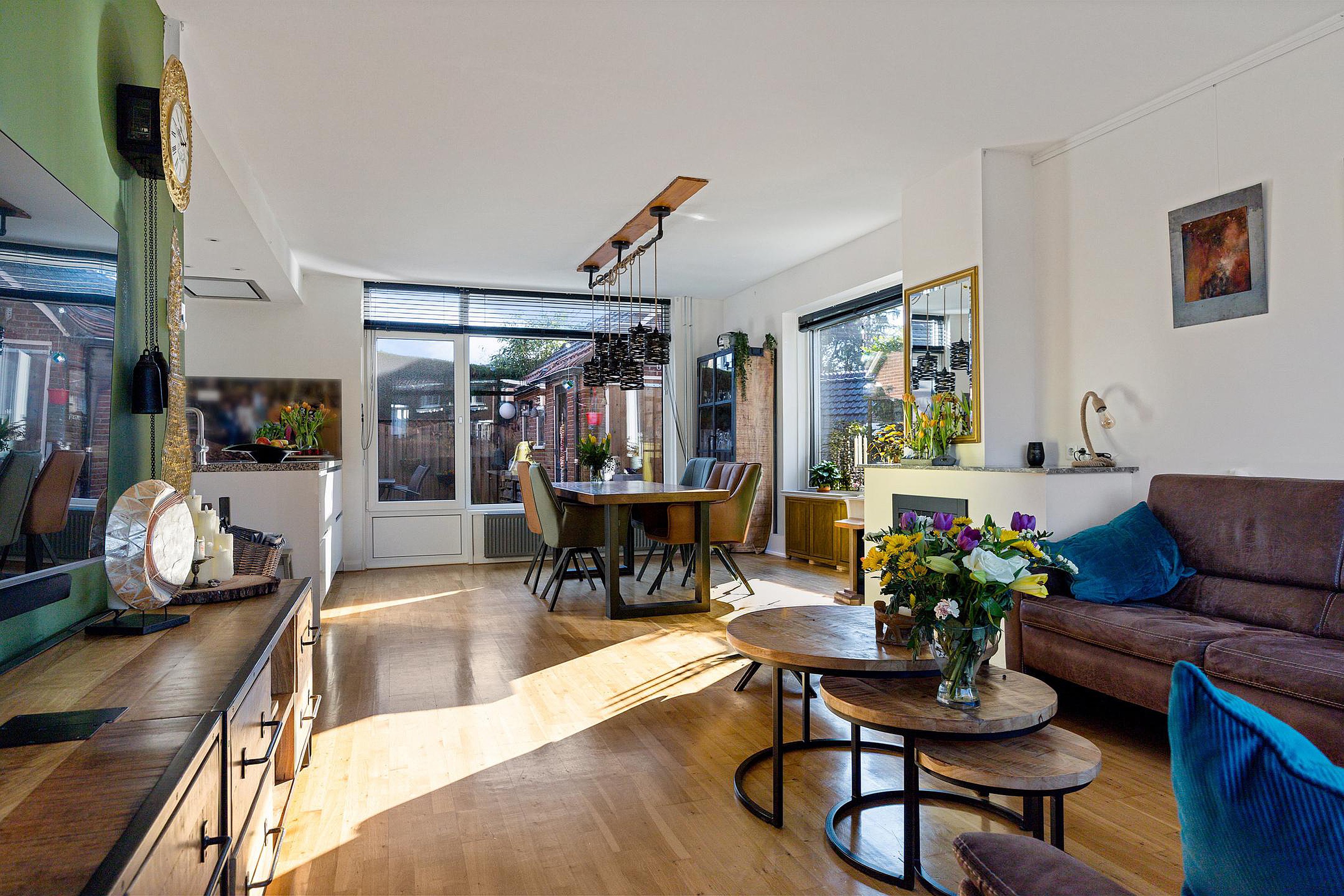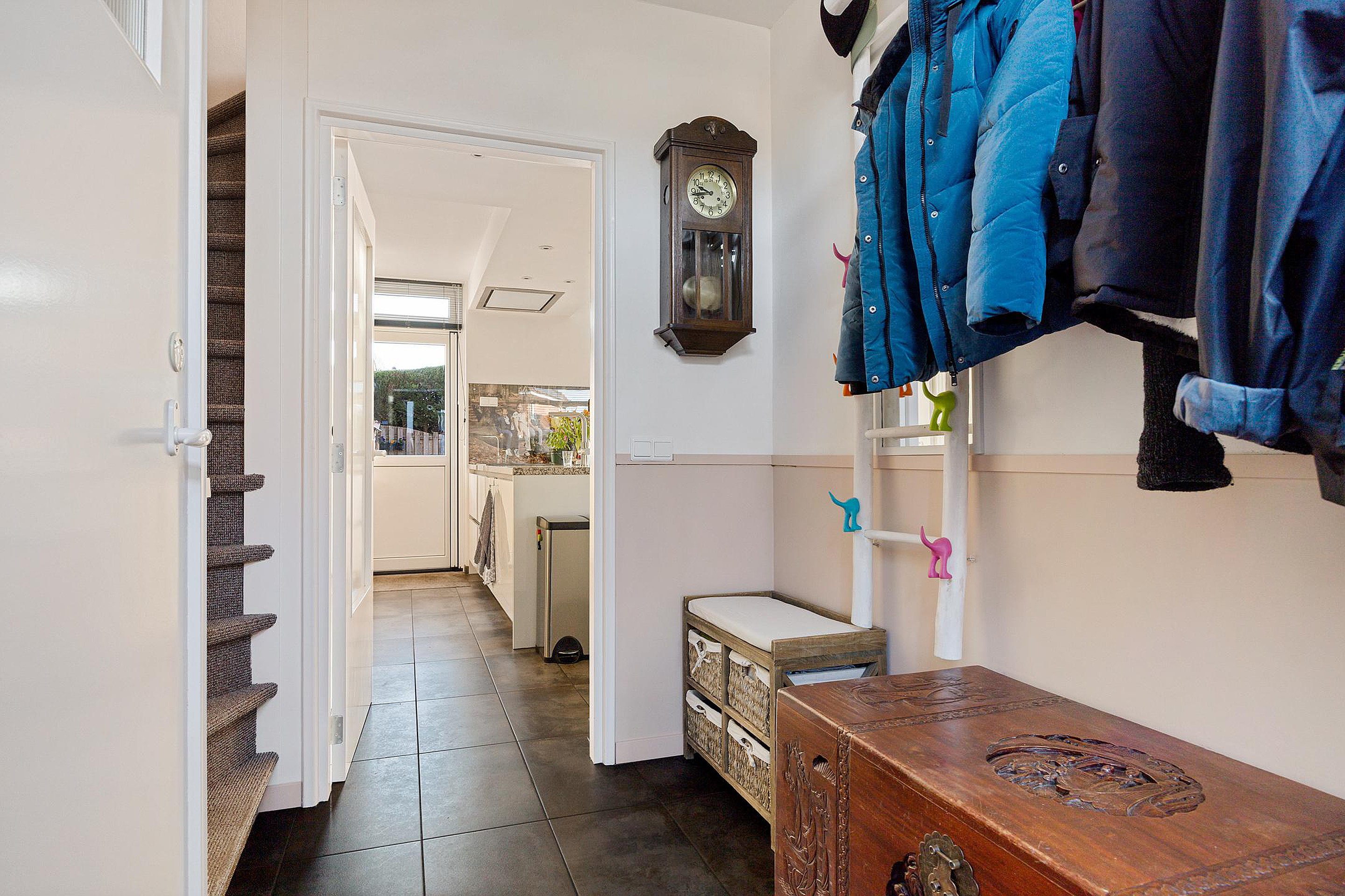 Bij binnenkomst tref je een nette entree met garderoberuimte en een modern zwevend toilet. De lichte woonkamer heeft een warme uitstraling dankzij de houten parketvloer, elektrische sfeerhaard en strakke wandafwerking.