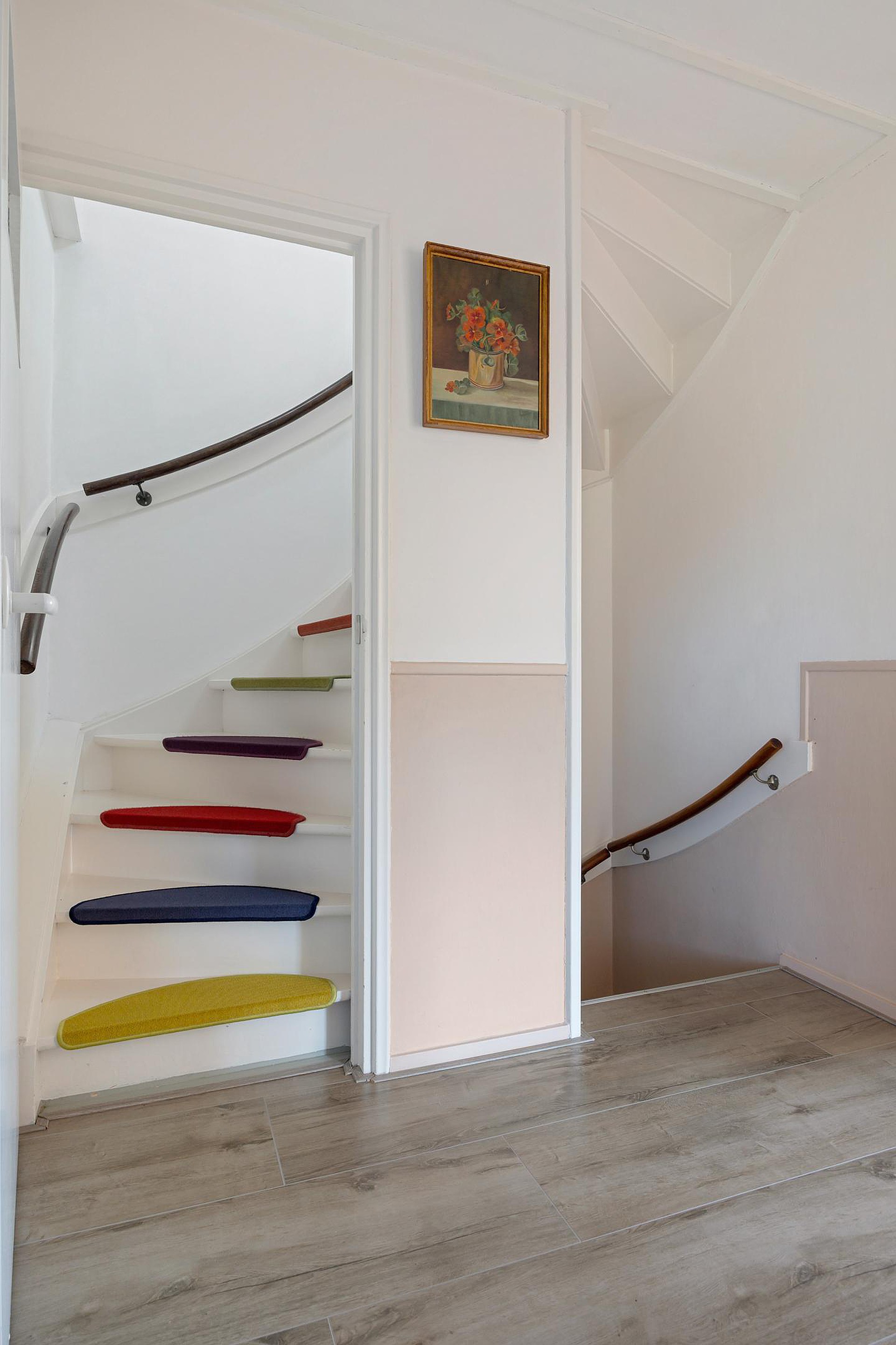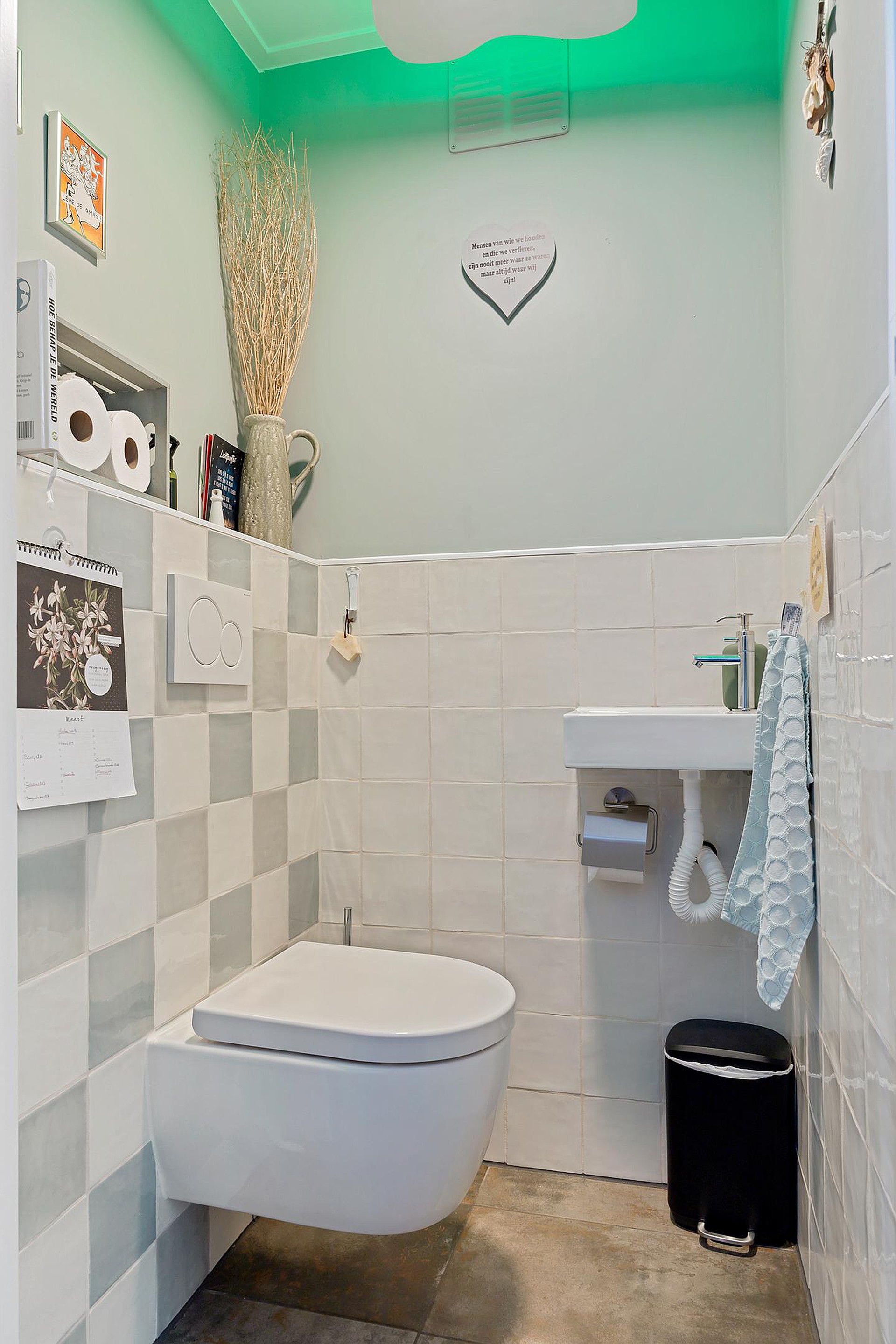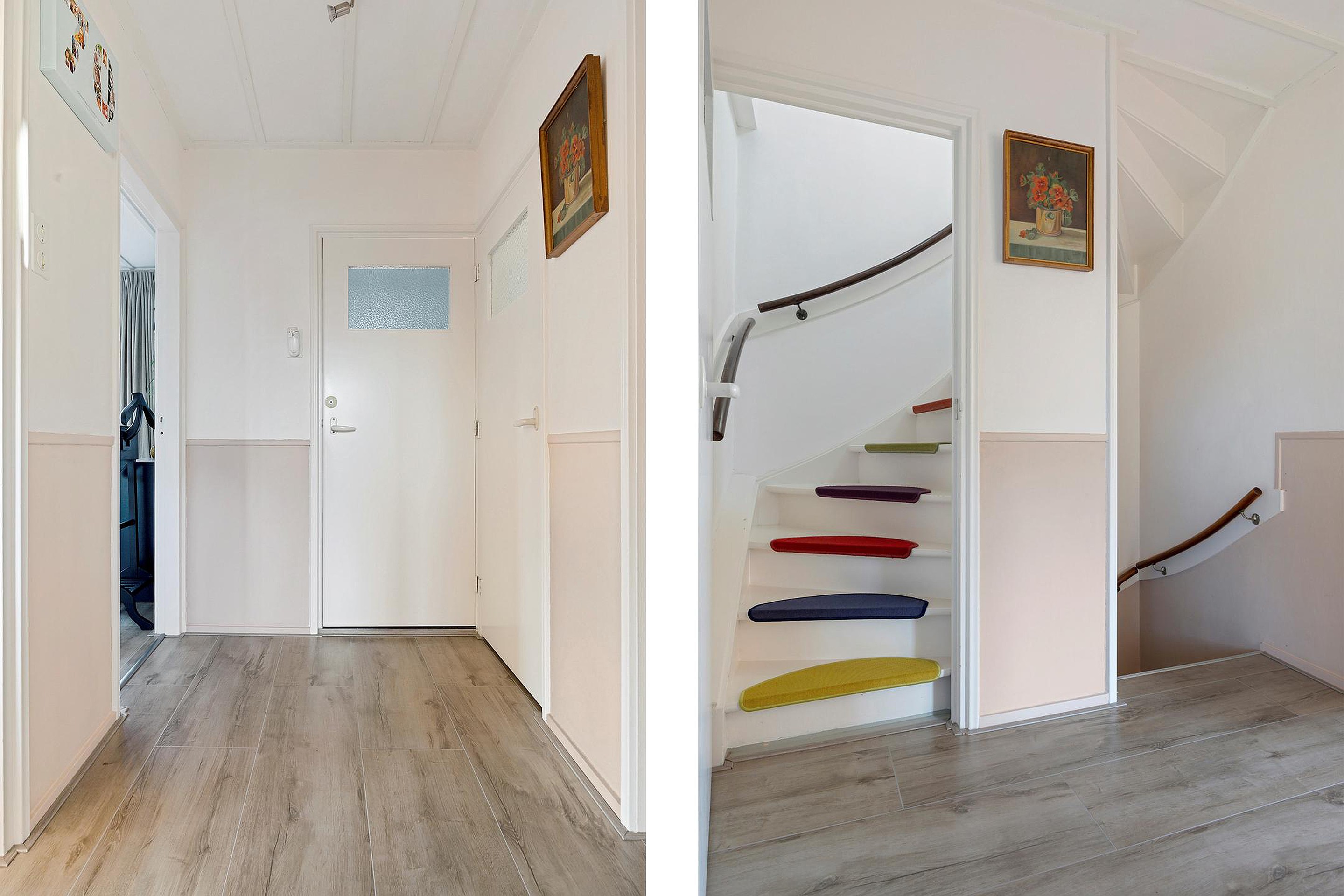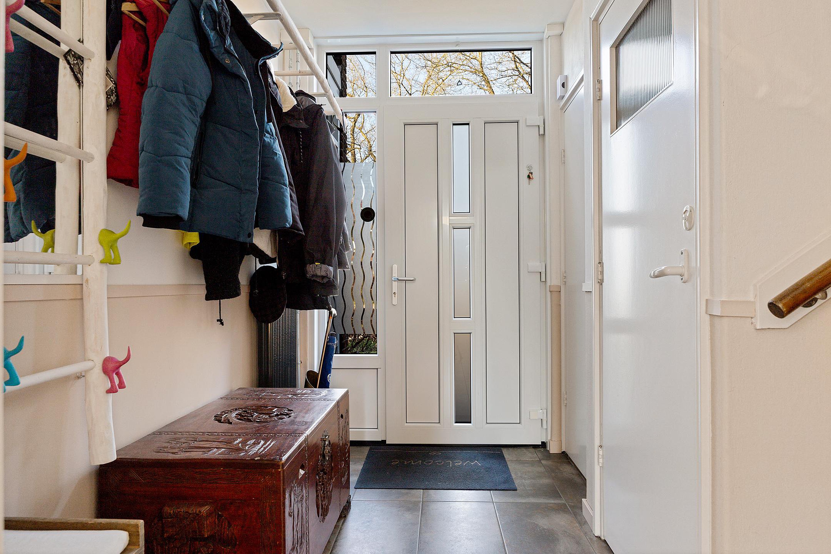 Bij binnenkomst tref je een nette entree met garderoberuimte en een modern zwevend toilet. De lichte woonkamer heeft een warme uitstraling dankzij de houten parketvloer, elektrische sfeerhaard en strakke wandafwerking.
