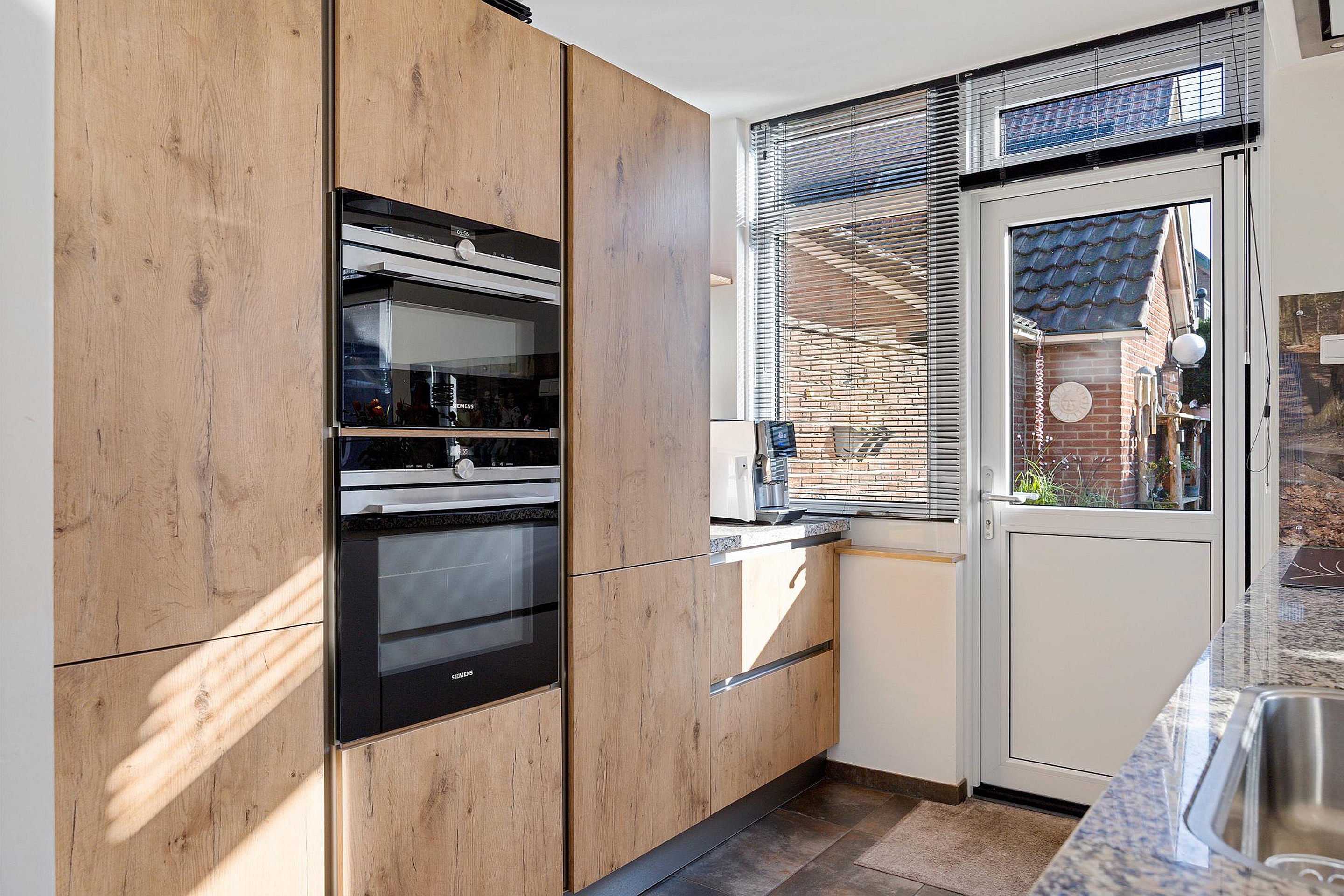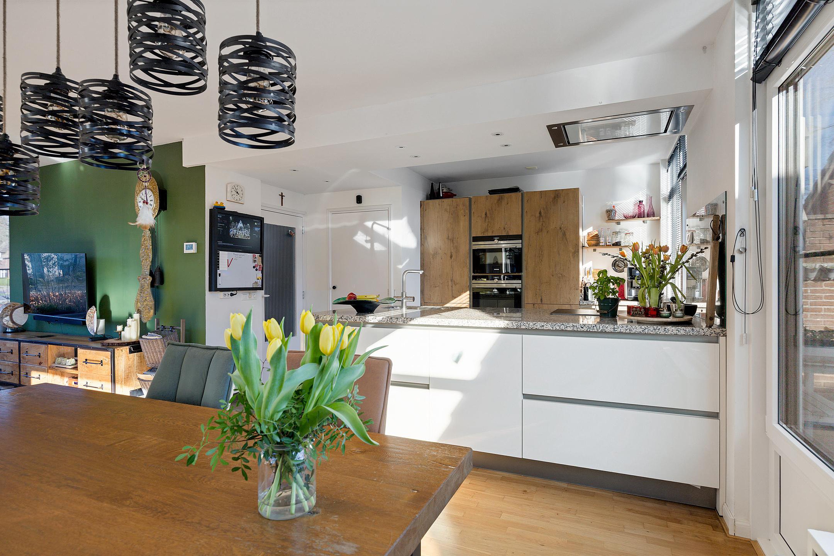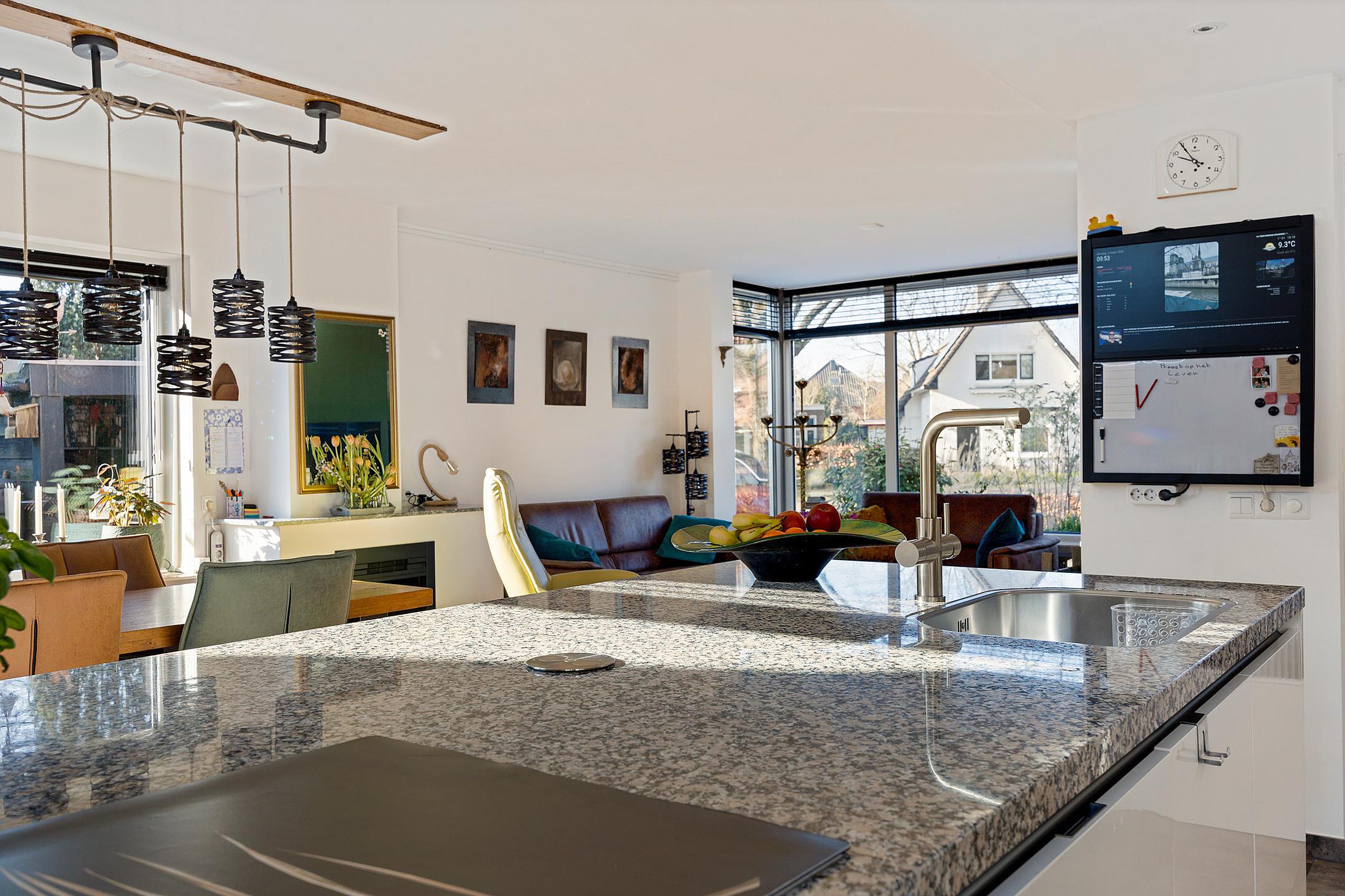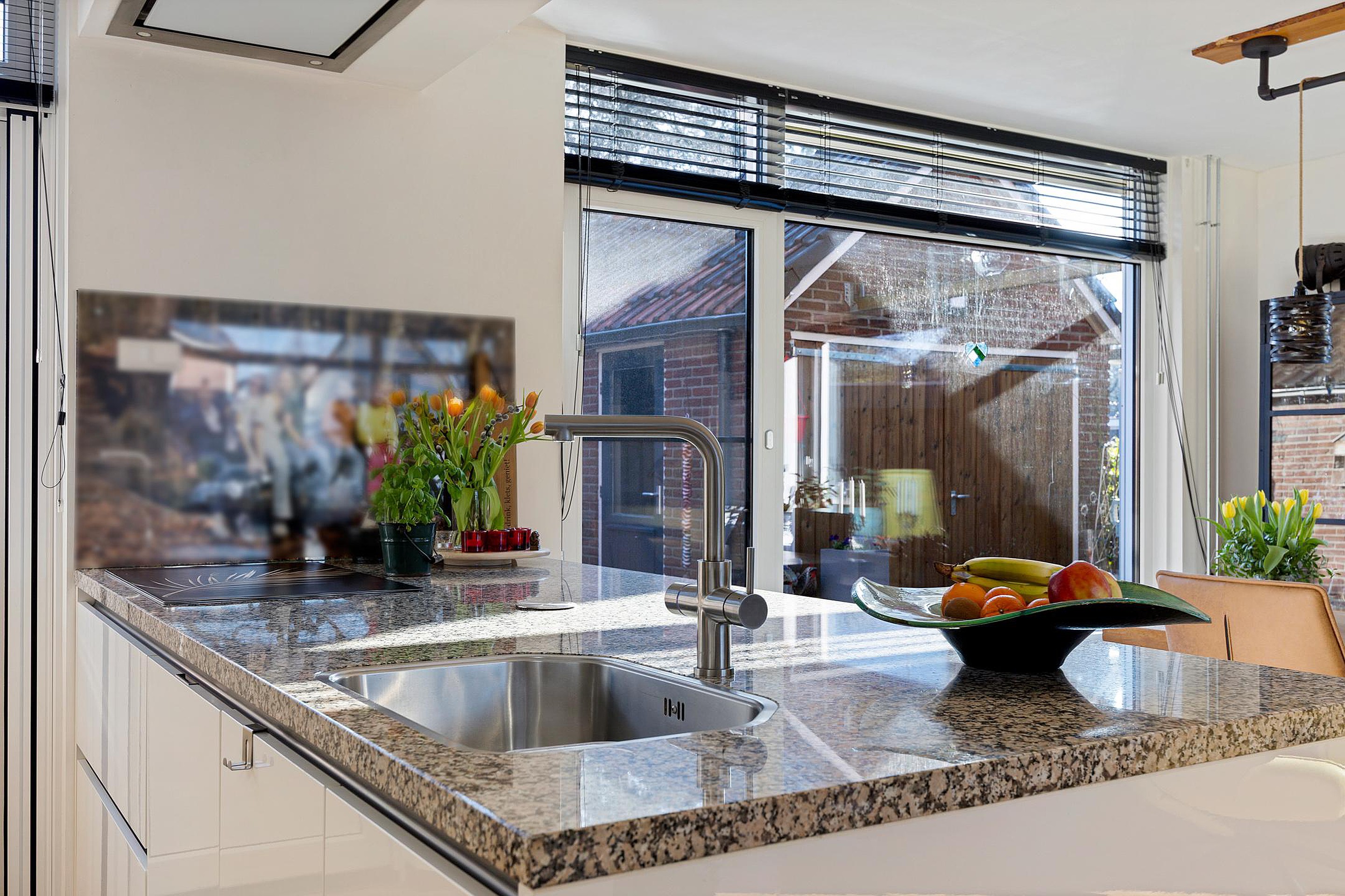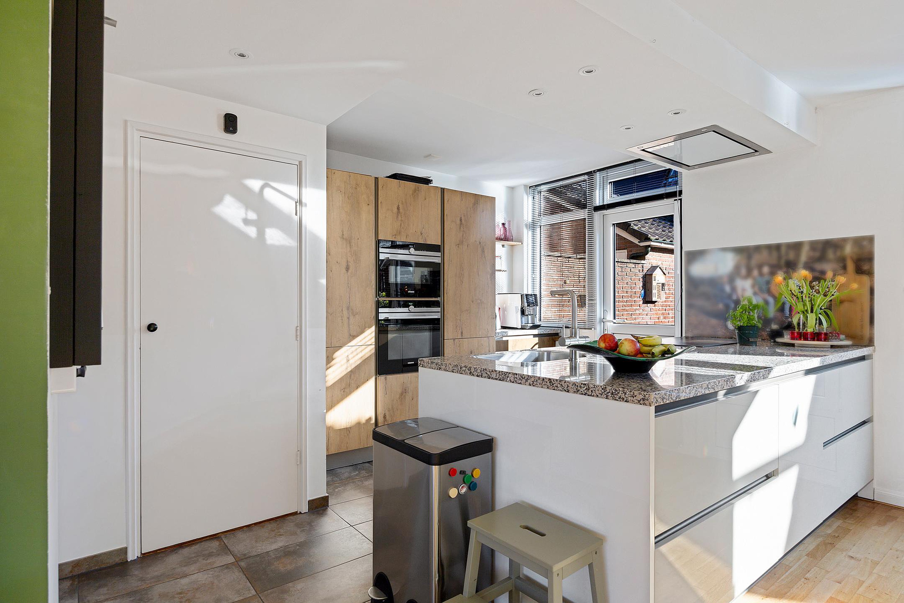 De moderne open keuken met kookeiland is van alle gemakken voorzien, waaronder diverse inbouwapparatuur, een Floww kokend waterkraan, composiet werkblad en veel kastruimte. Voor extra comfort is er vloerverwarming aanwezig in de keuken.