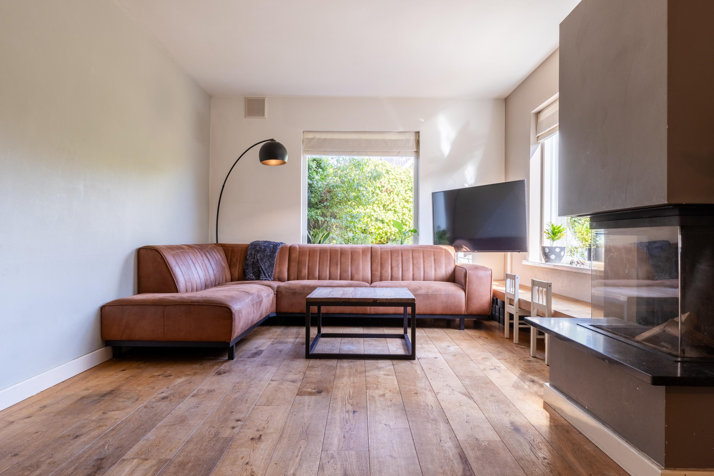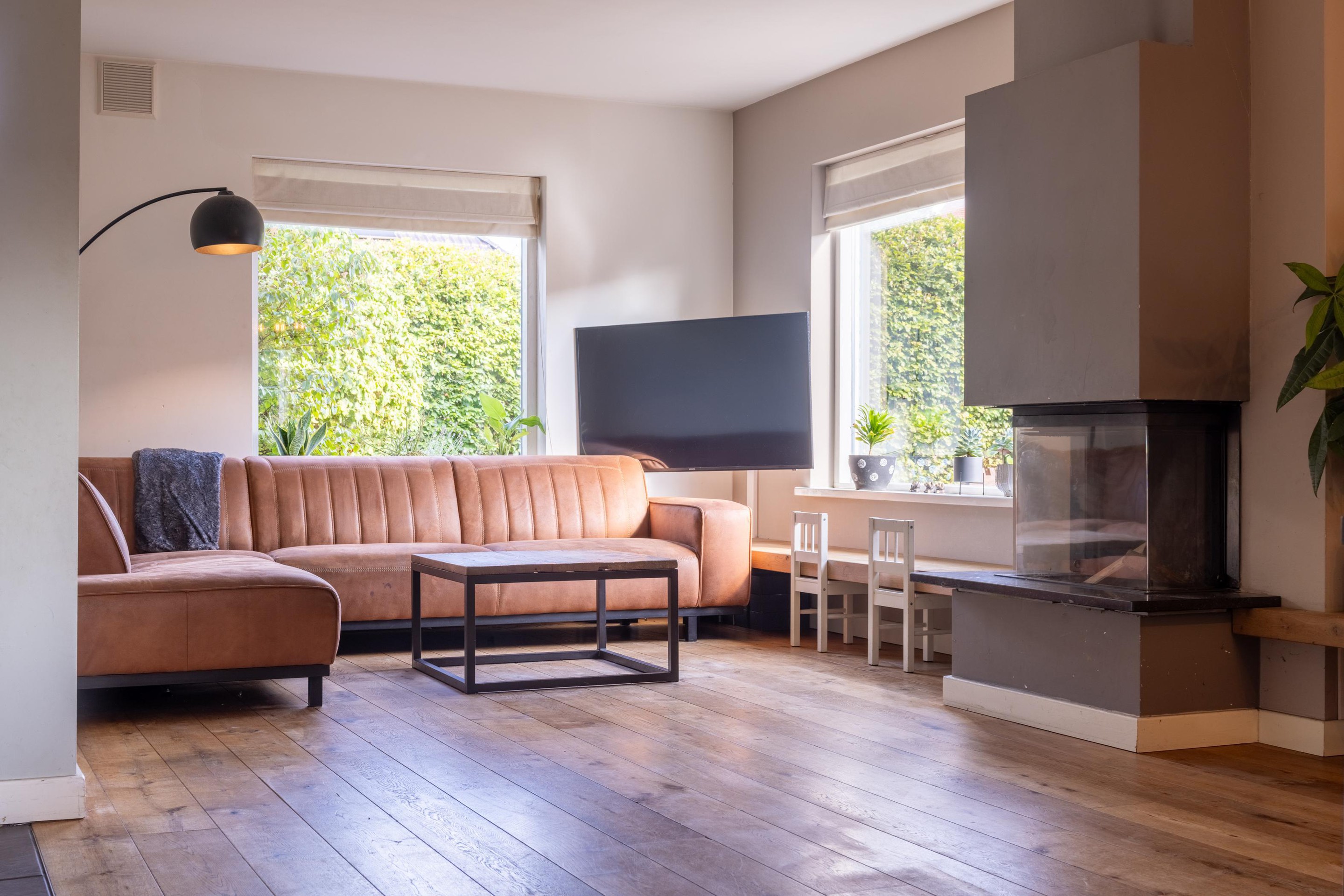 Lichte woonkamer met houtkachel, houten vloer en openslaande deuren naar de tuin.