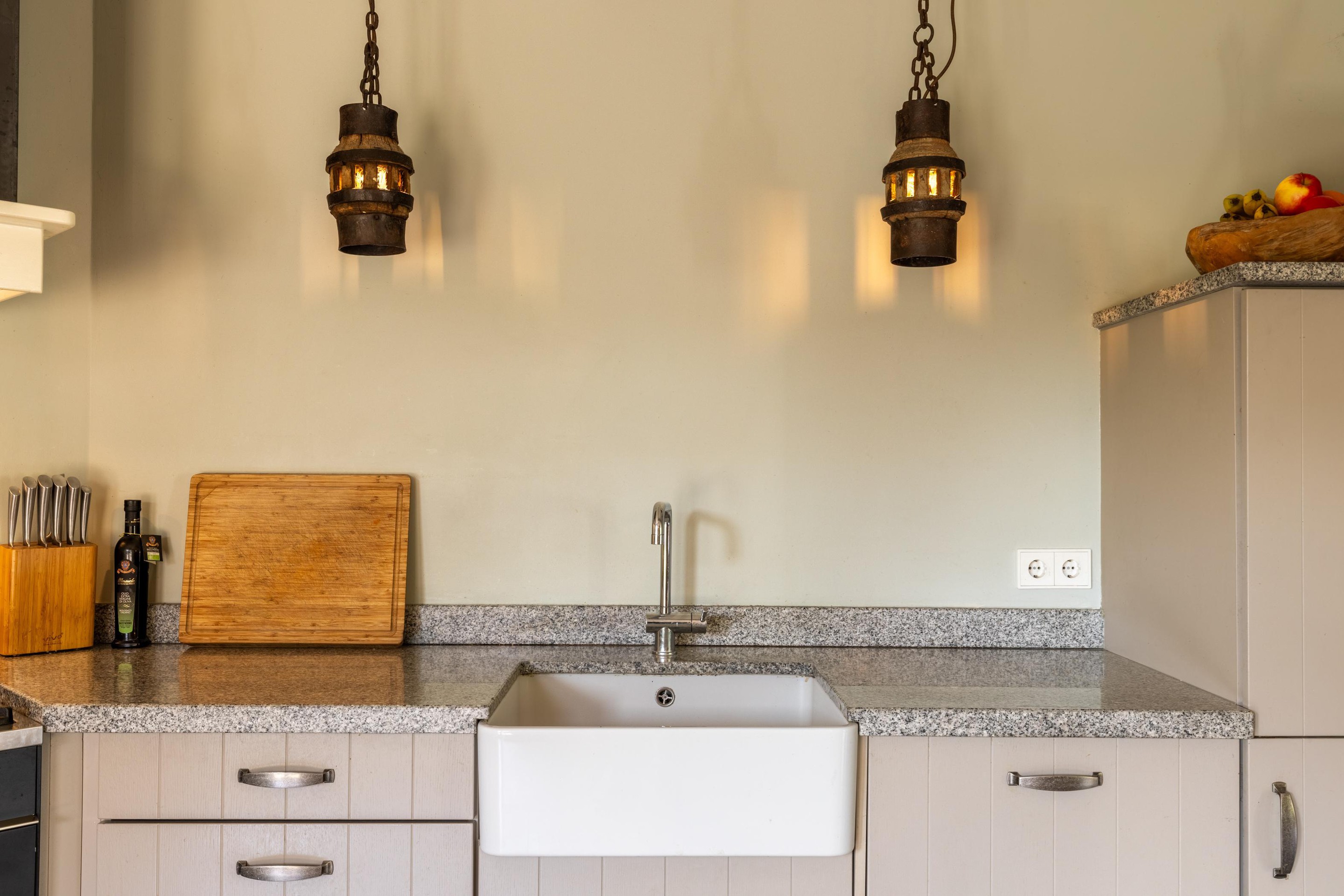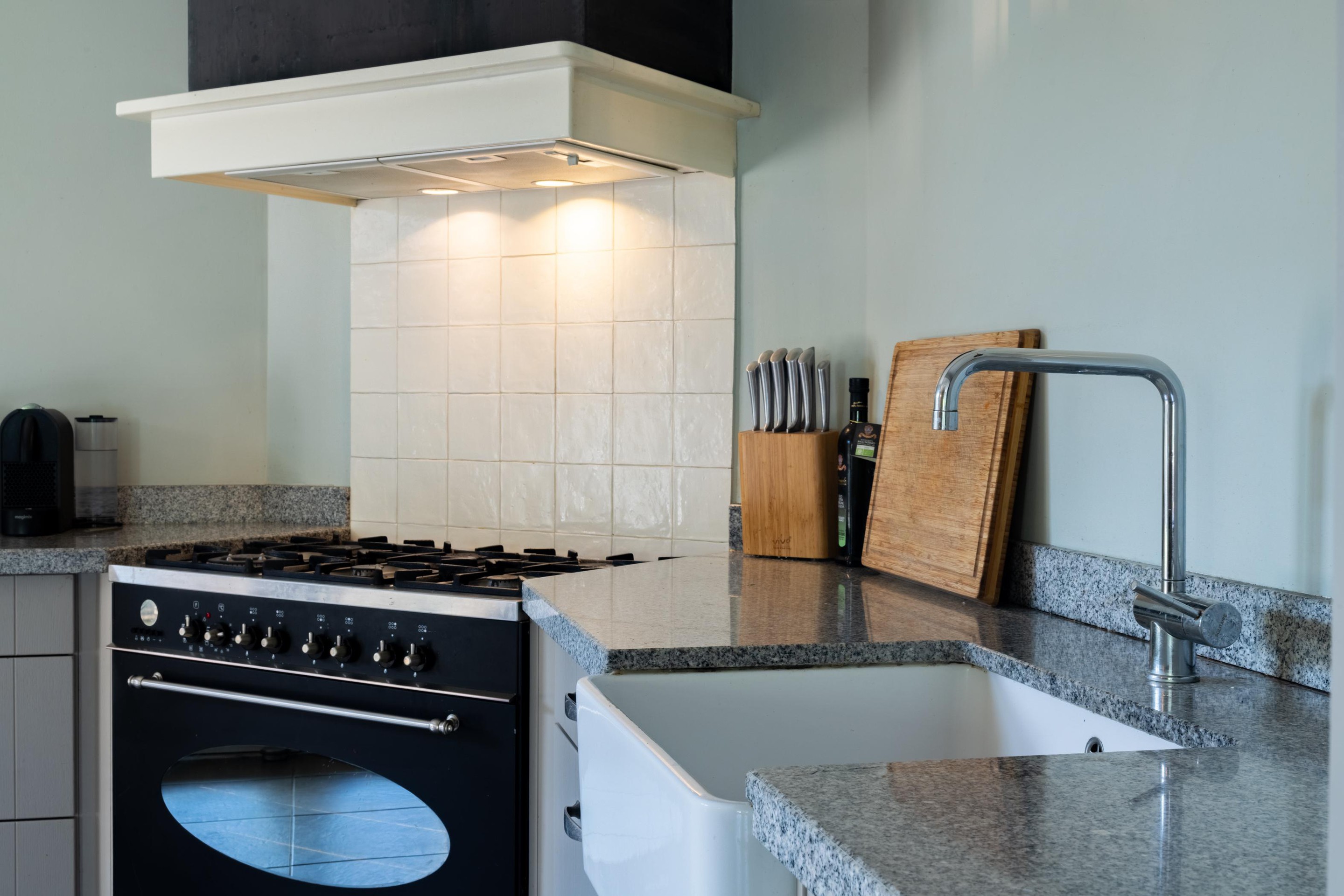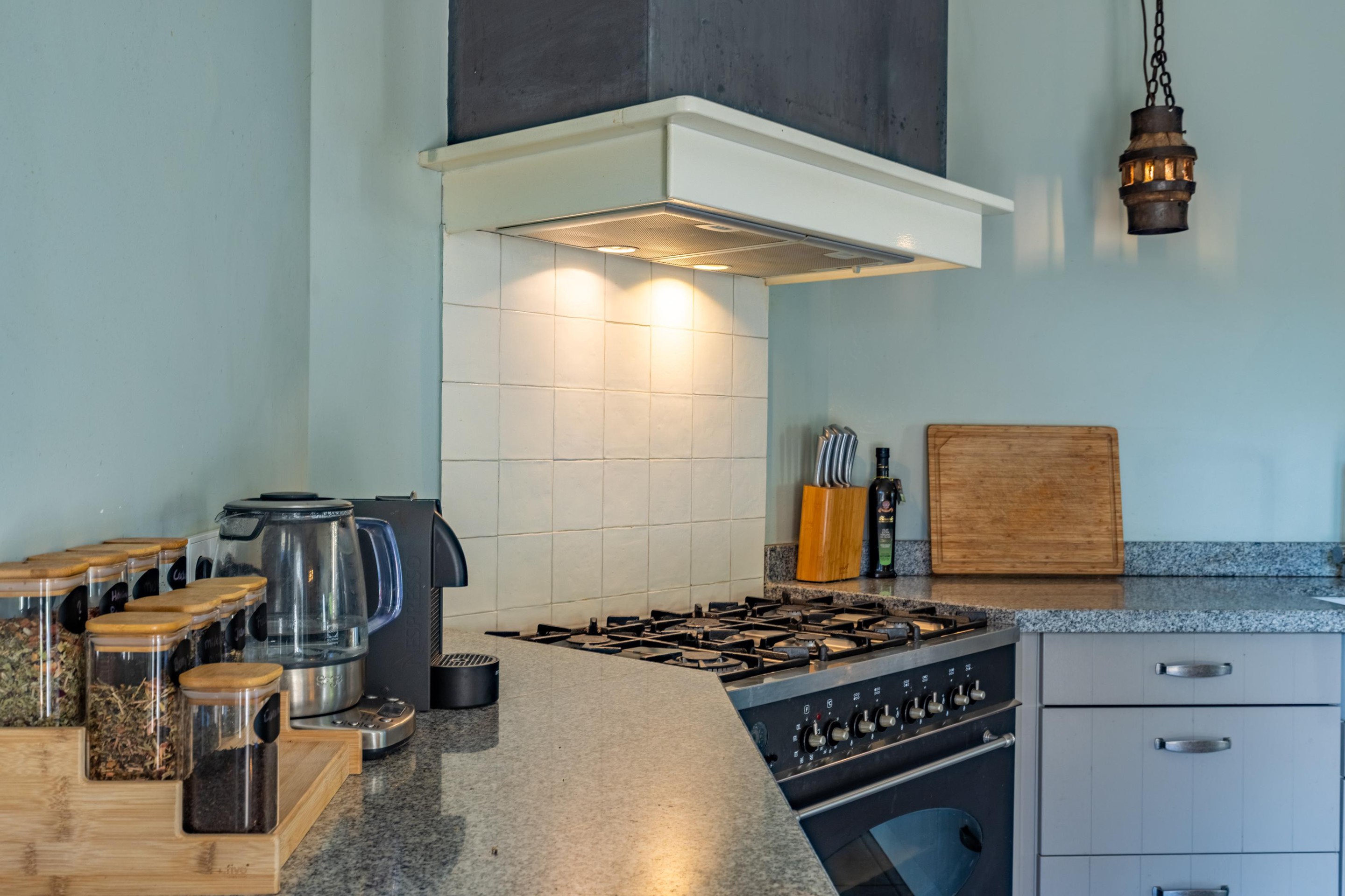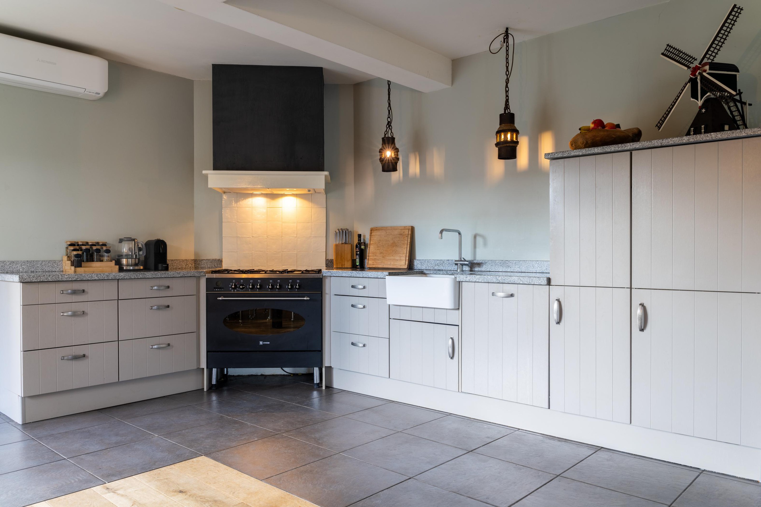 Riante woonkeuken met volop werkruimte en inbouwapparatuur.