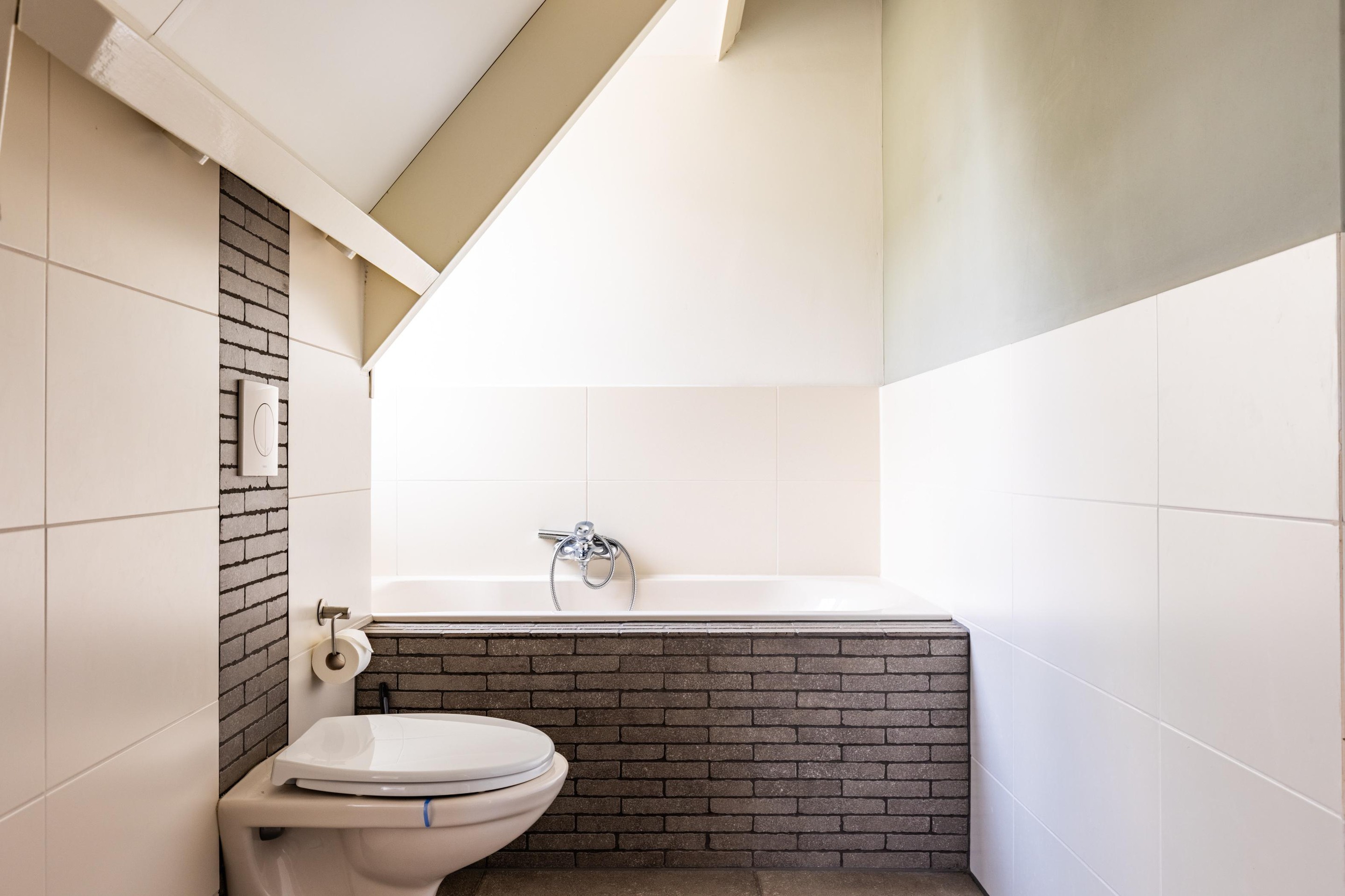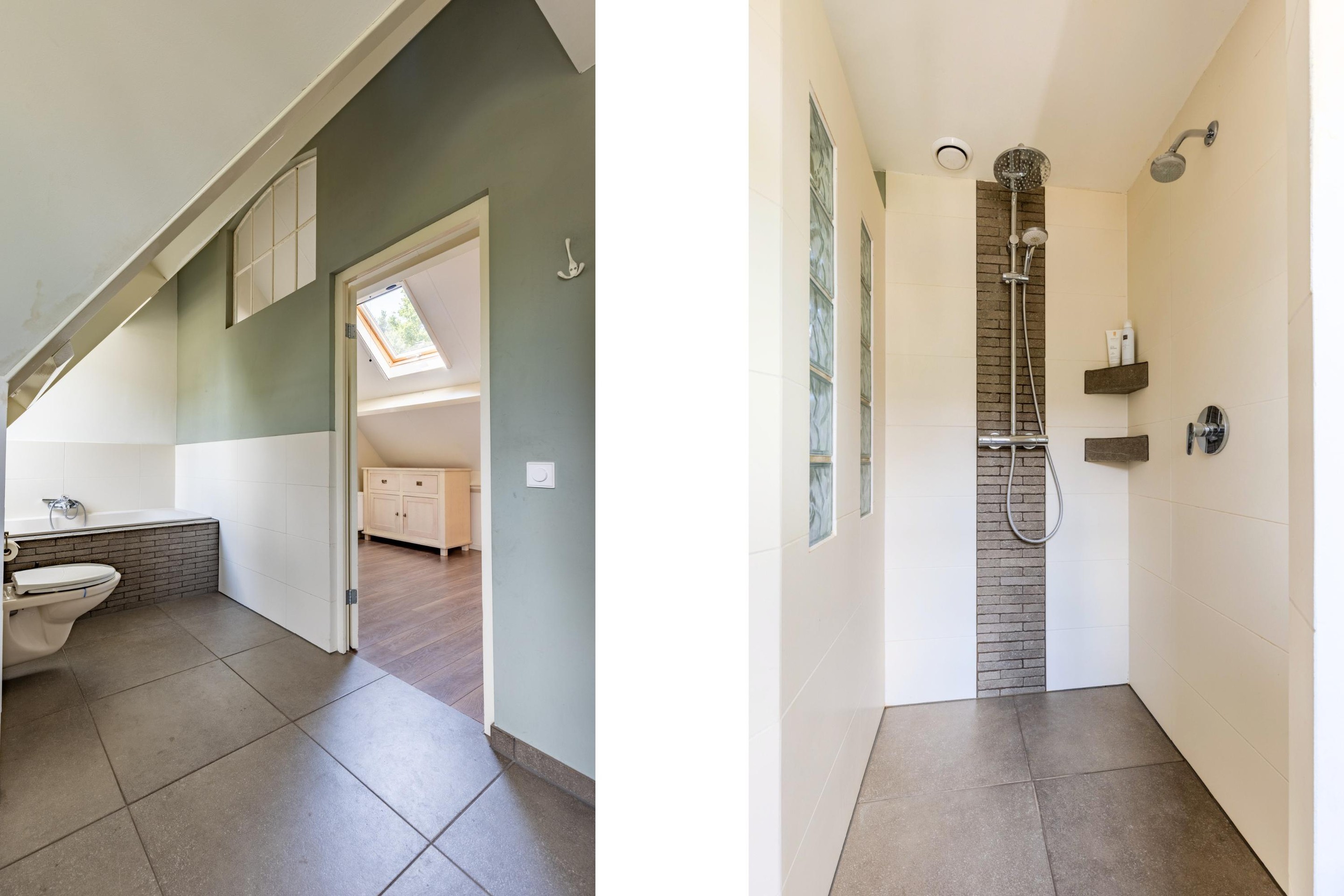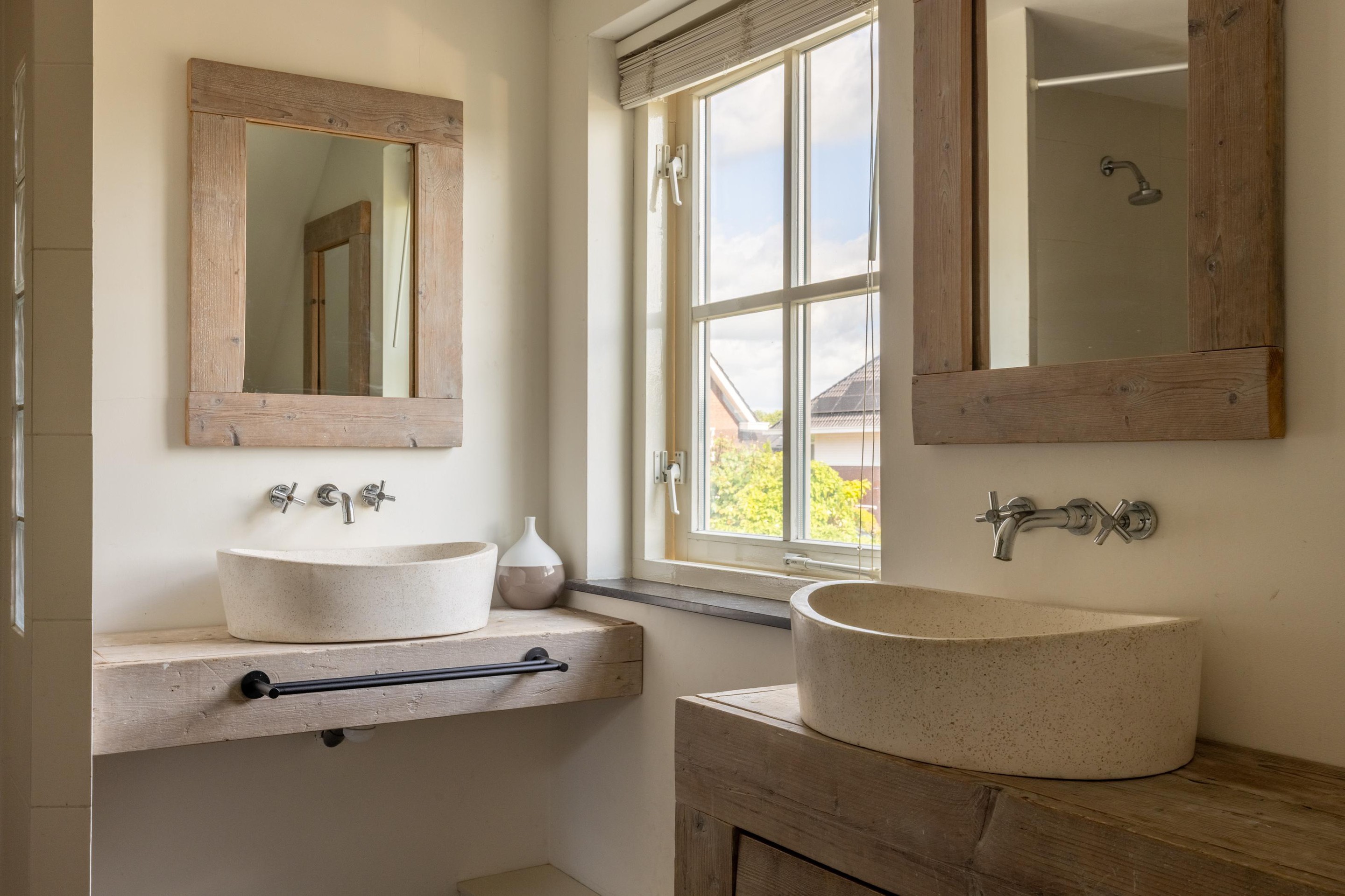 Luxe badkamer (2012) met inloopdouche, ligbad, dubbele wastafel en tweede toilet.