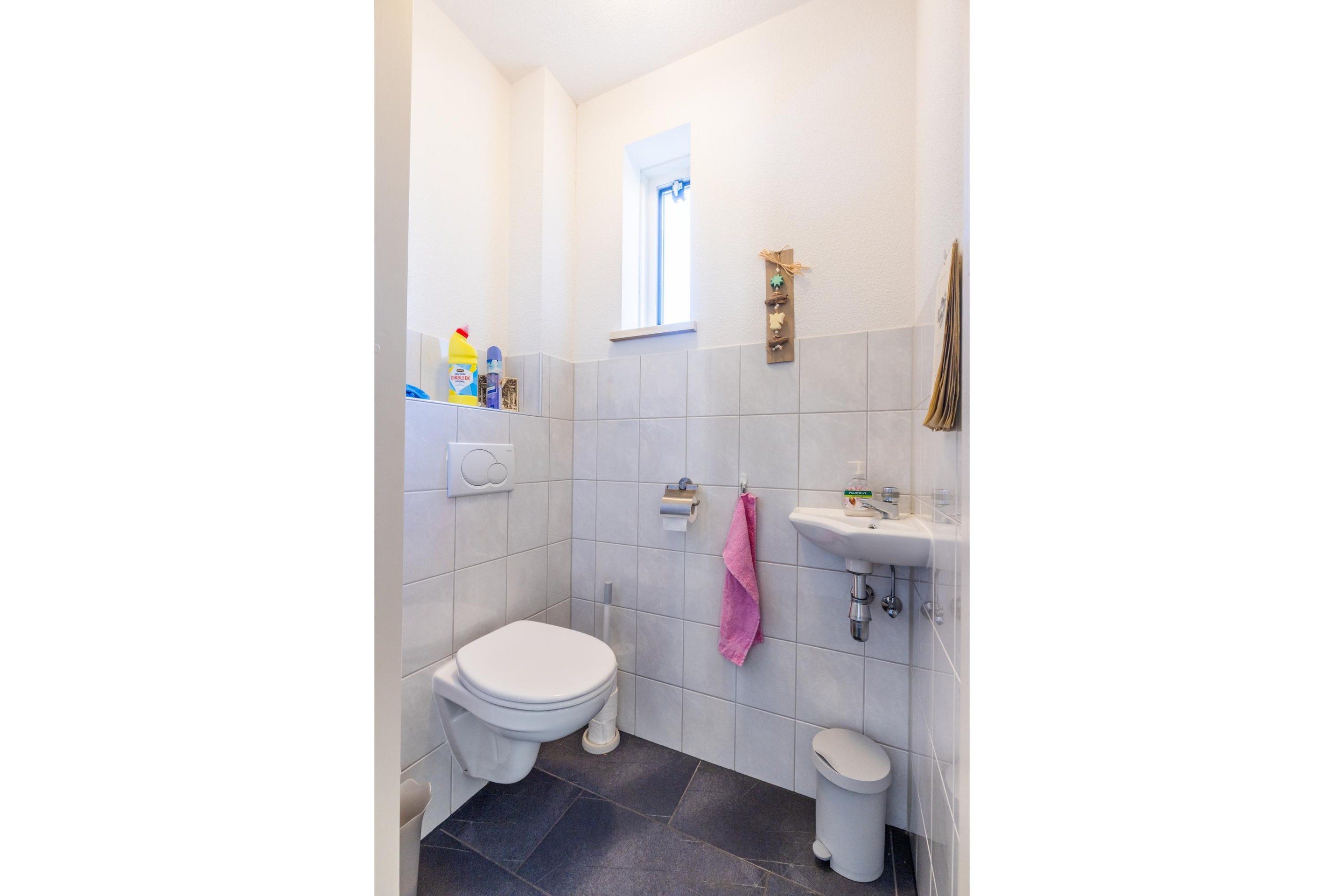 Daarnaast vindt u op de begane grond een ruime slaapkamer met aansluitende badkamer, voorzien van een inloopdouche, wastafelmeubel en een tweede toilet. Verder is er een praktische wasruimte/bijkeuken en toegang tot het multifunctionele bijgebouw.
