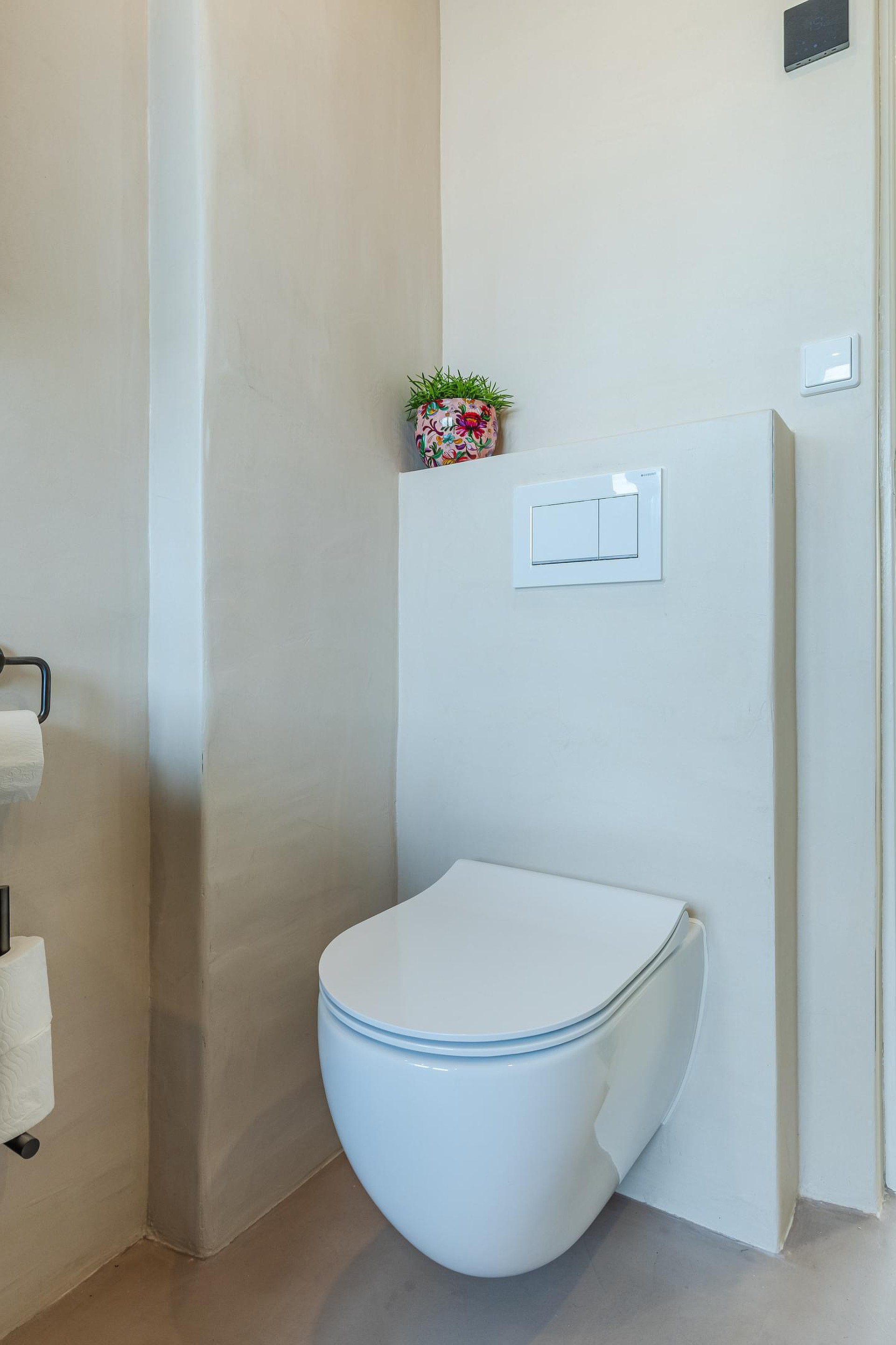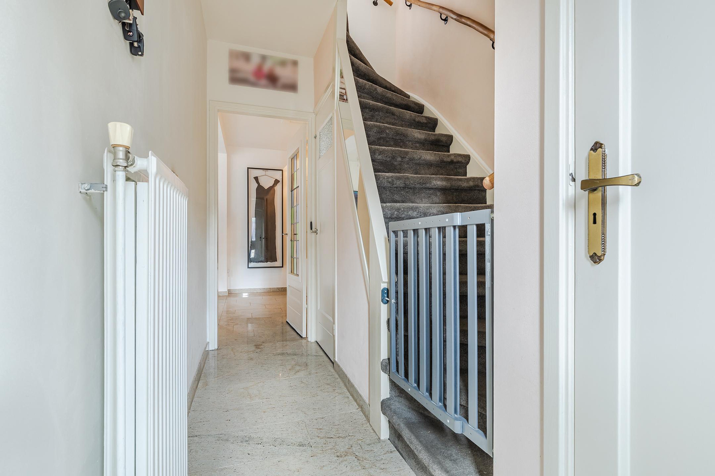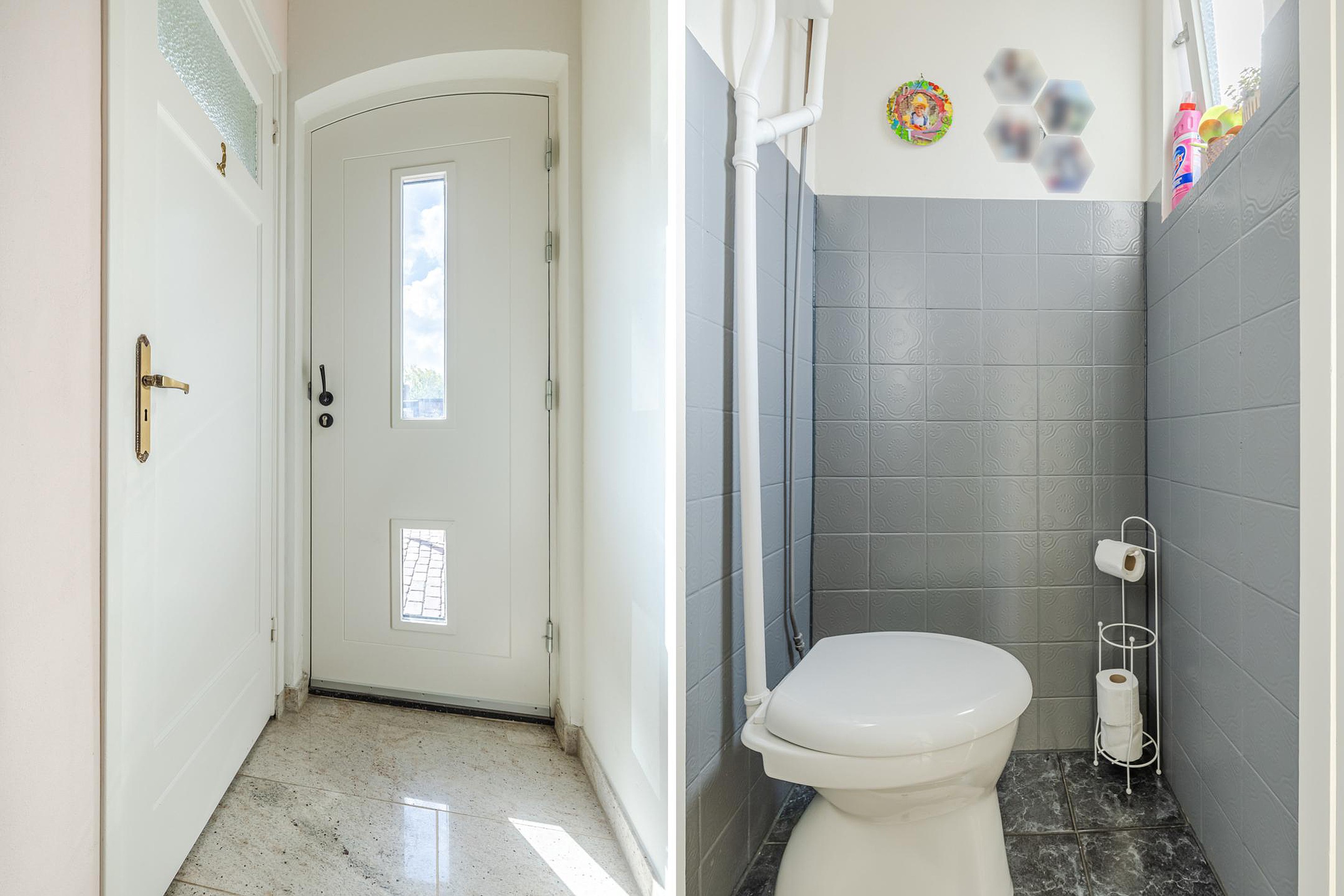 De hal geeft toegang tot de trapopgang naar de 1e verdieping, de kelder, de woonkamer en de deels betegelde toiletruimte met staand closet en ventilatievenster.
