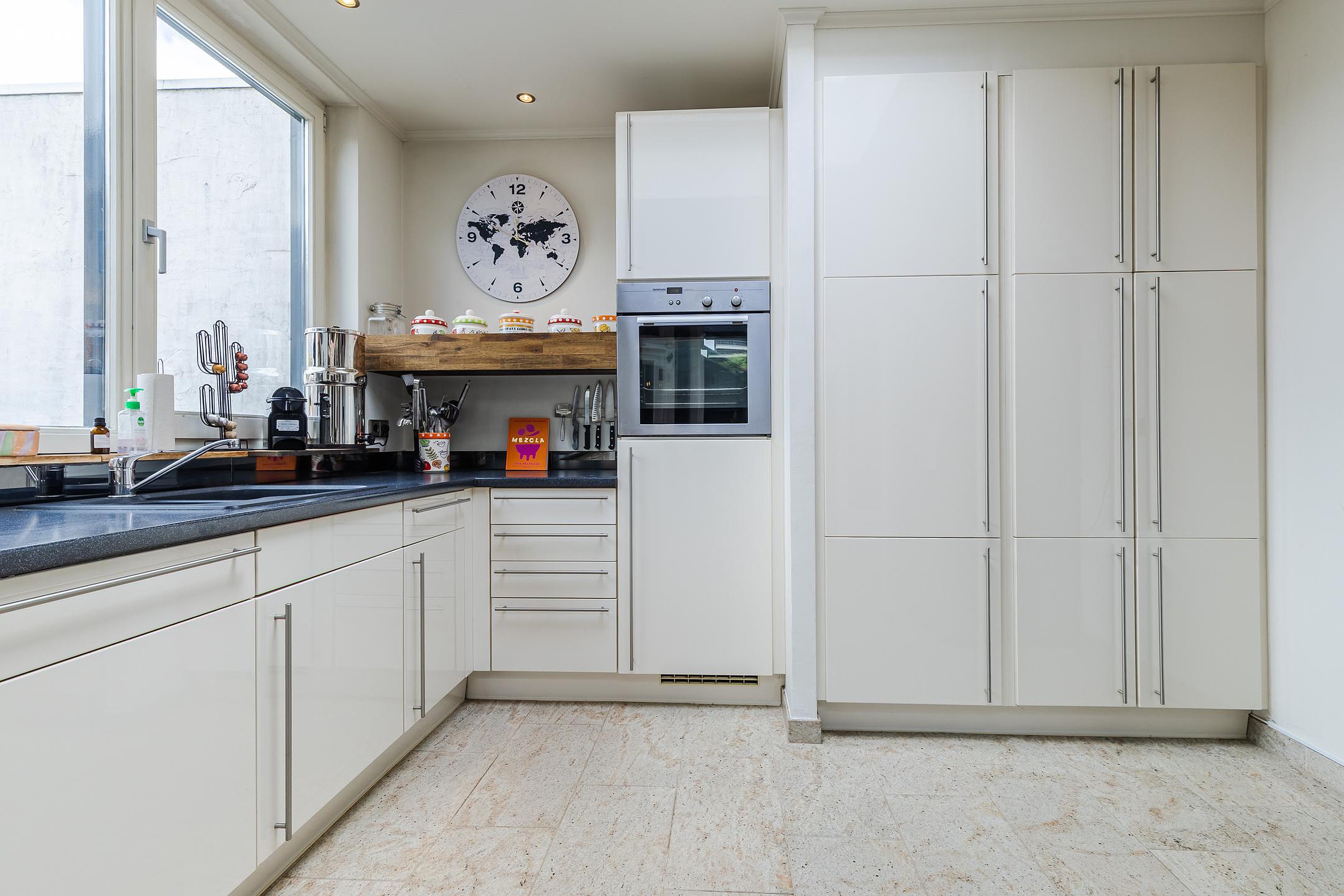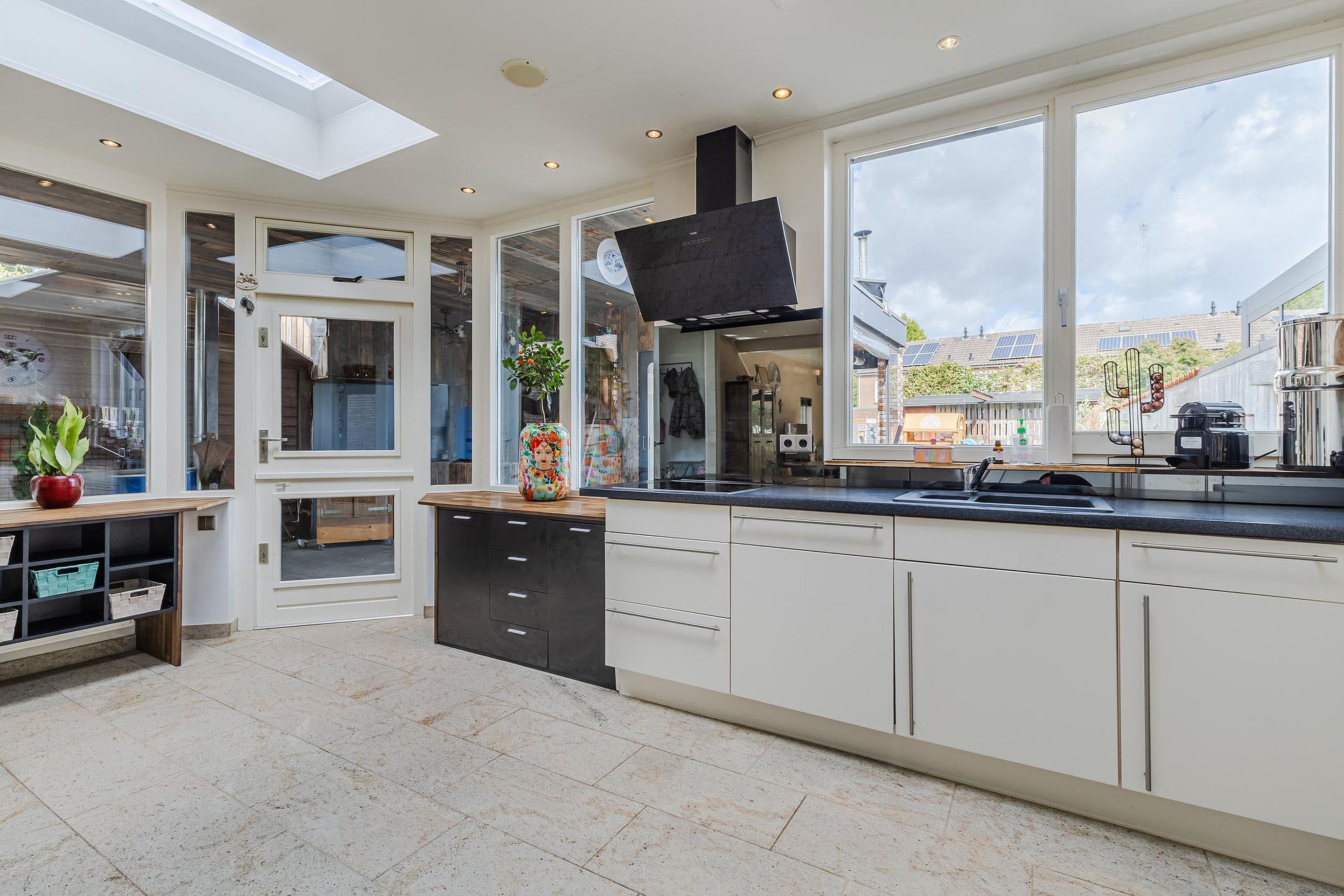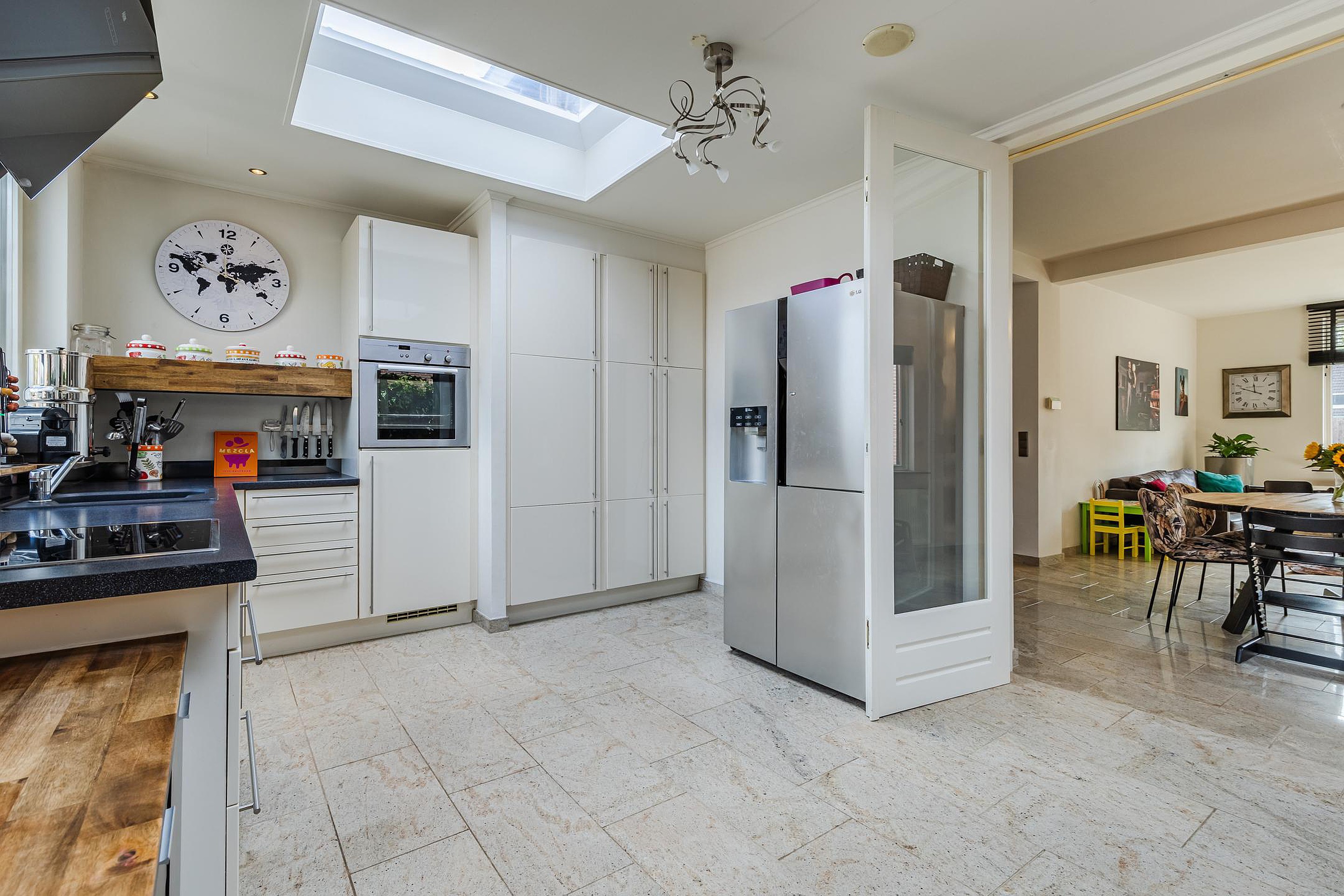 De leefkeuken (ca.20m2) is ingericht met een keukenblok in hoekopstelling en een vaste kastenwand en voorzien van een 4 pits inductiekookplaat, afzuigkap, vaatwasser, oven. Achter de vaste kastenwand bevinden zich de aansluitingen voor de wasmachine en droger en de CV-opstelling. In het dak zitten 2 lichtstraten en een loopdeur geeft toegang tot het overdekt terras. De keuken is voorzien van plafondspots. Alle wanden op de begane grond zijn strak gestukt. Op de vloer liggen tegels in natuursteenmotief met vloerverwarming in de keuken. De begane grond is voorzien van airco die zowel verwarmt als koelt.