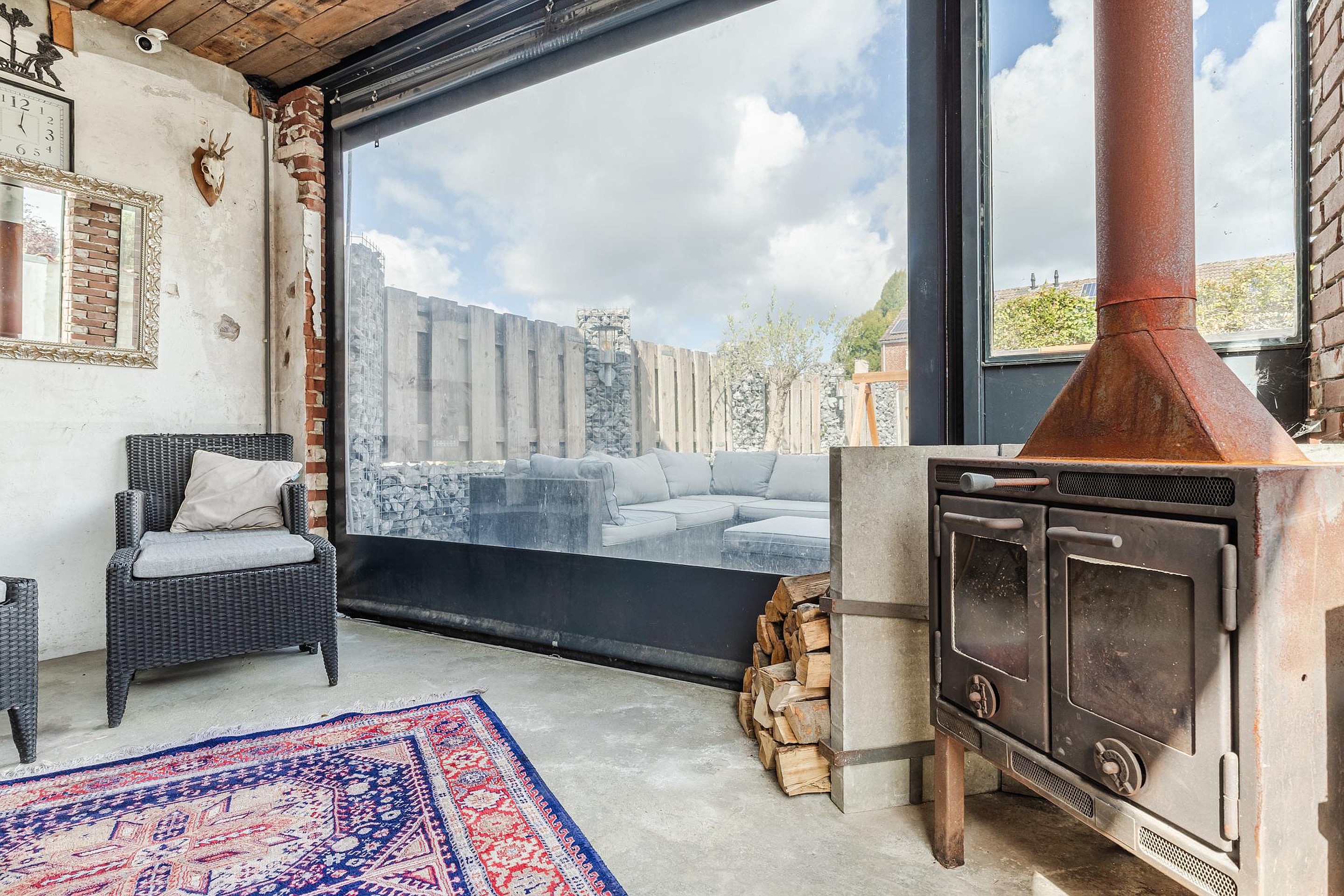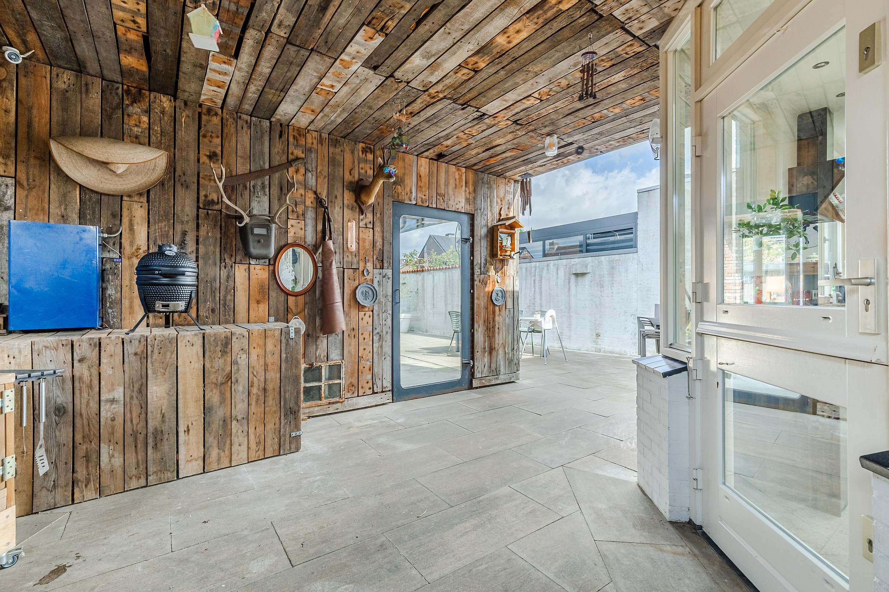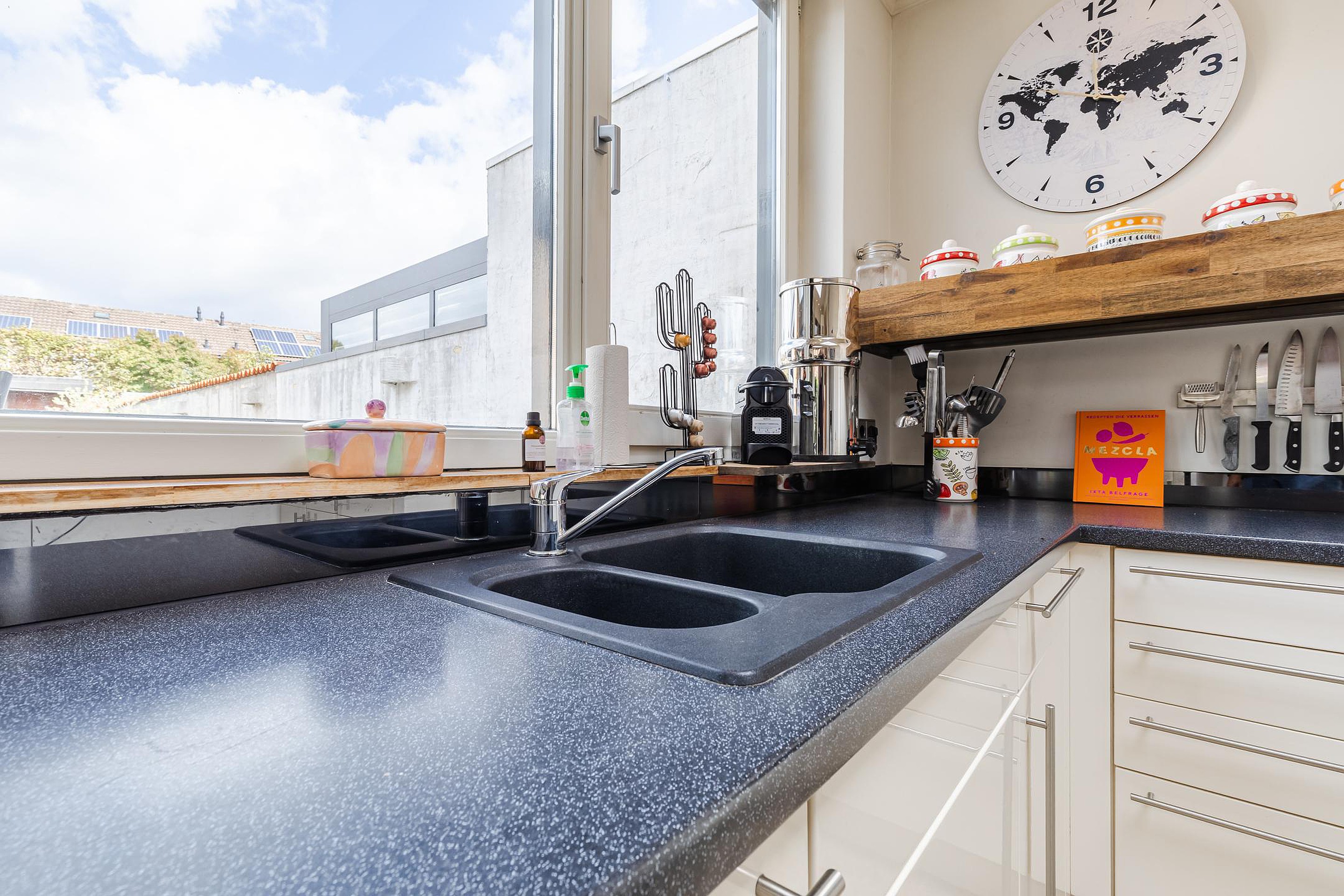 De leefkeuken (ca.20m2) is ingericht met een keukenblok in hoekopstelling en een vaste kastenwand en voorzien van een 4 pits inductiekookplaat, afzuigkap, vaatwasser, oven. Achter de vaste kastenwand bevinden zich de aansluitingen voor de wasmachine en droger en de CV-opstelling. In het dak zitten 2 lichtstraten en een loopdeur geeft toegang tot het overdekt terras. De keuken is voorzien van plafondspots. Alle wanden op de begane grond zijn strak gestukt. Op de vloer liggen tegels in natuursteenmotief met vloerverwarming in de keuken. De begane grond is voorzien van airco die zowel verwarmt als koelt.