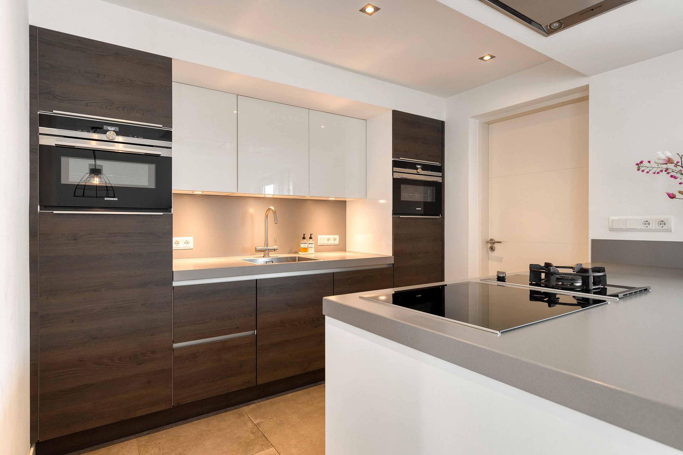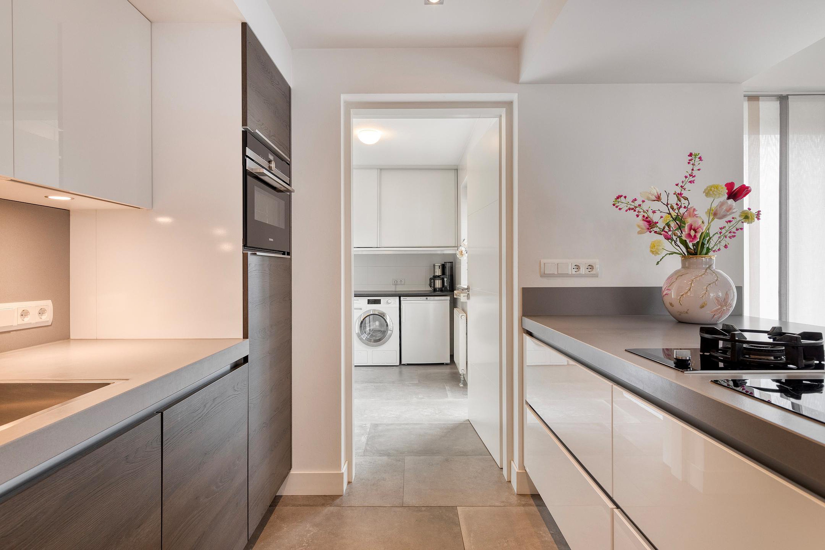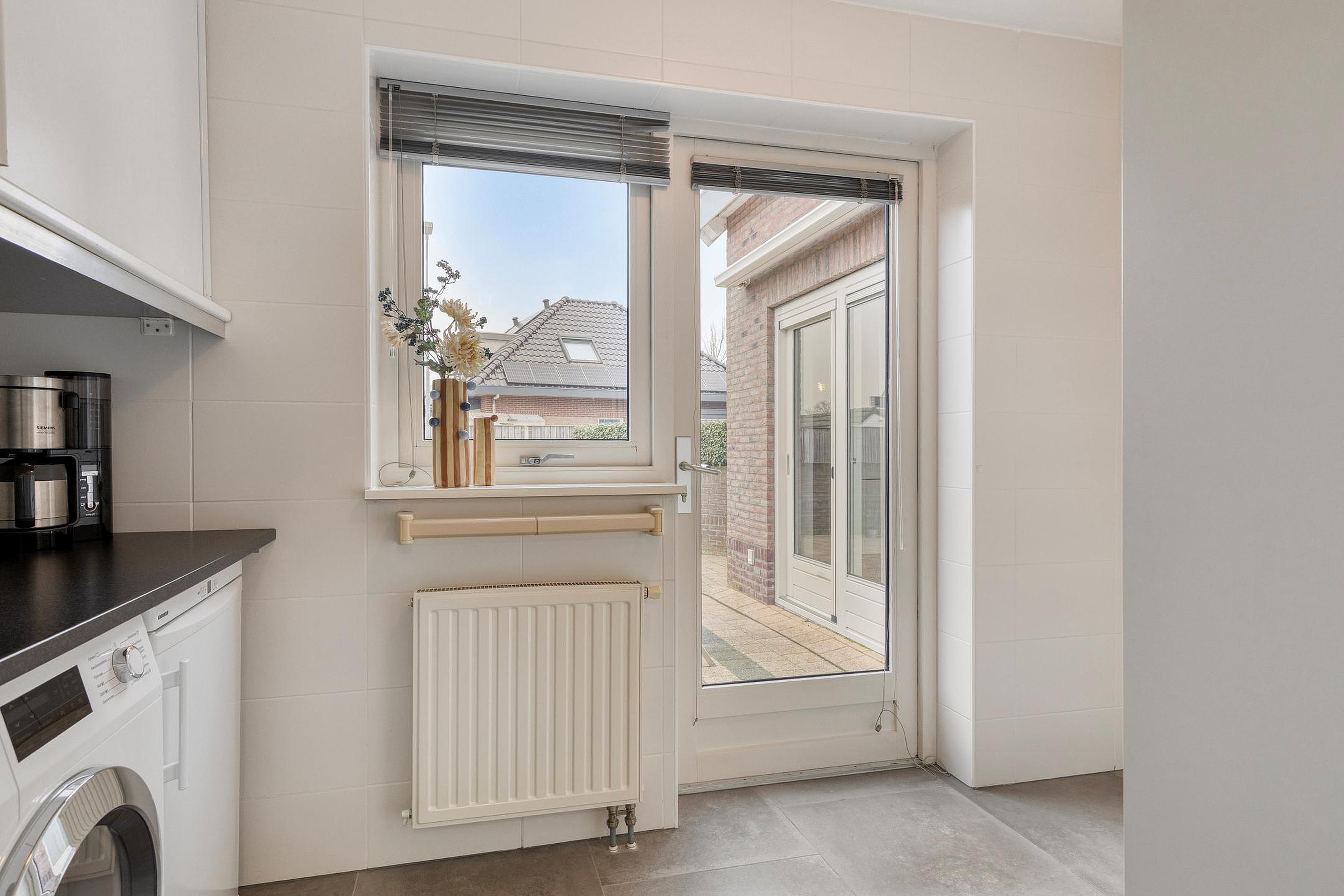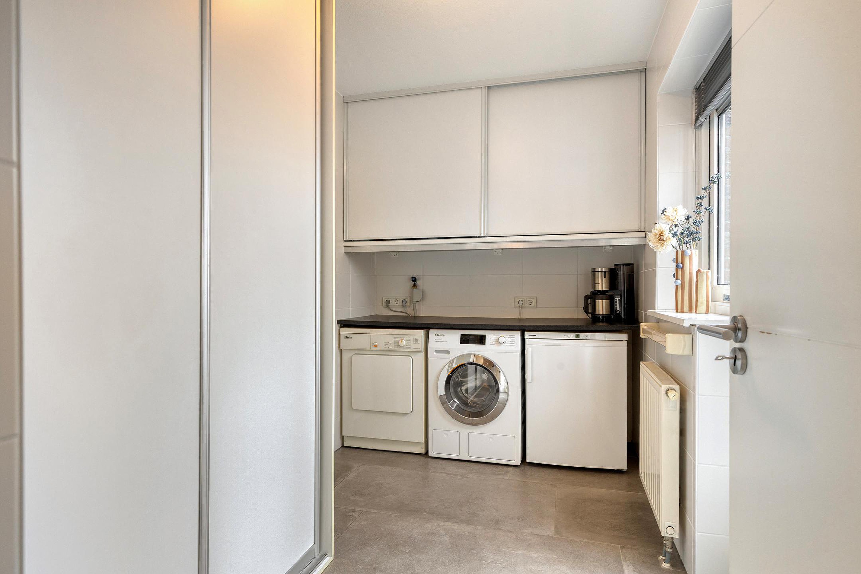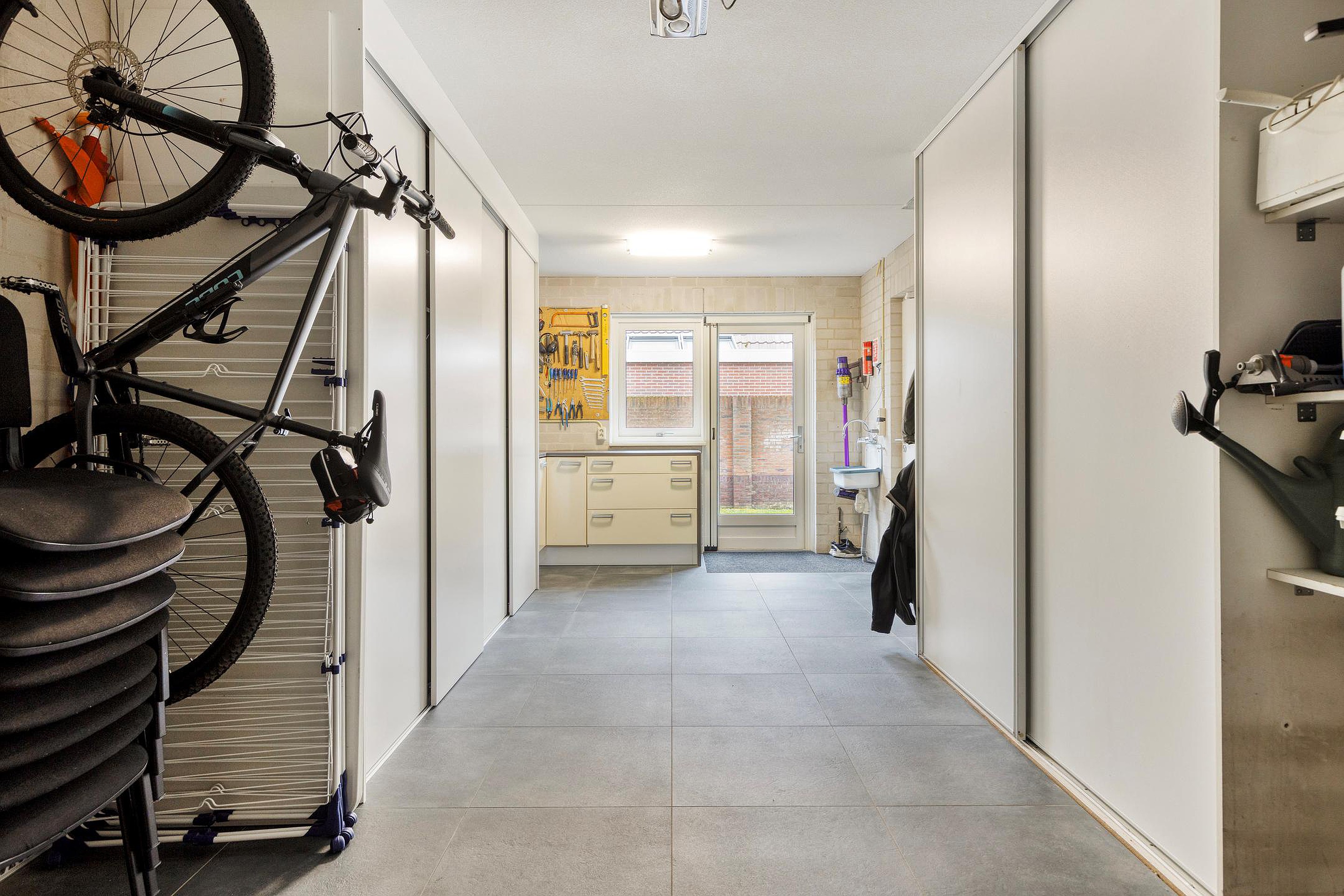 Aansluitend bevindt zich de praktische bijkeuken (circa 5,9 m2) met vaste kastruimte, aansluitingen voor huishoudelijke apparatuur en toegang tot de tuin en garage.