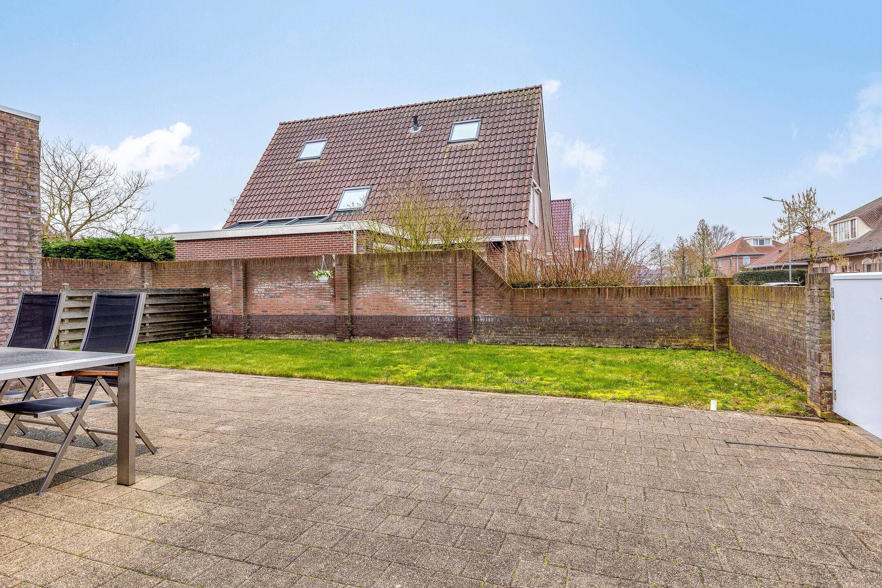 De ruime achtertuin is open aangelegd met bestrating en gras en is gunstig gelegen op het zuidwesten, waardoor u hier optimaal van de zon kunt genieten. Aan de gevel bevindt zich een zonnescherm. De tuin beschikt over een vrije achterom. Aan de voorzijde ligt een diepe oprit met parkeergelegenheid voor meerdere auto’s.