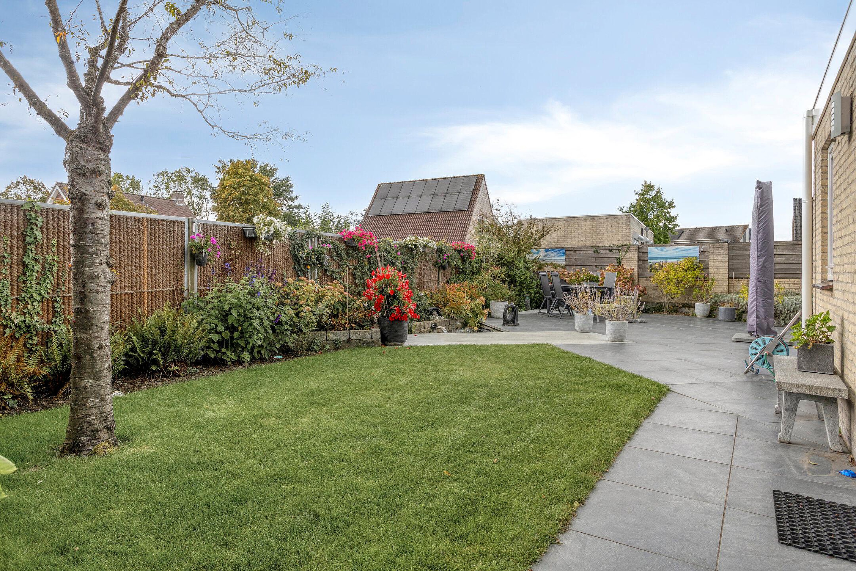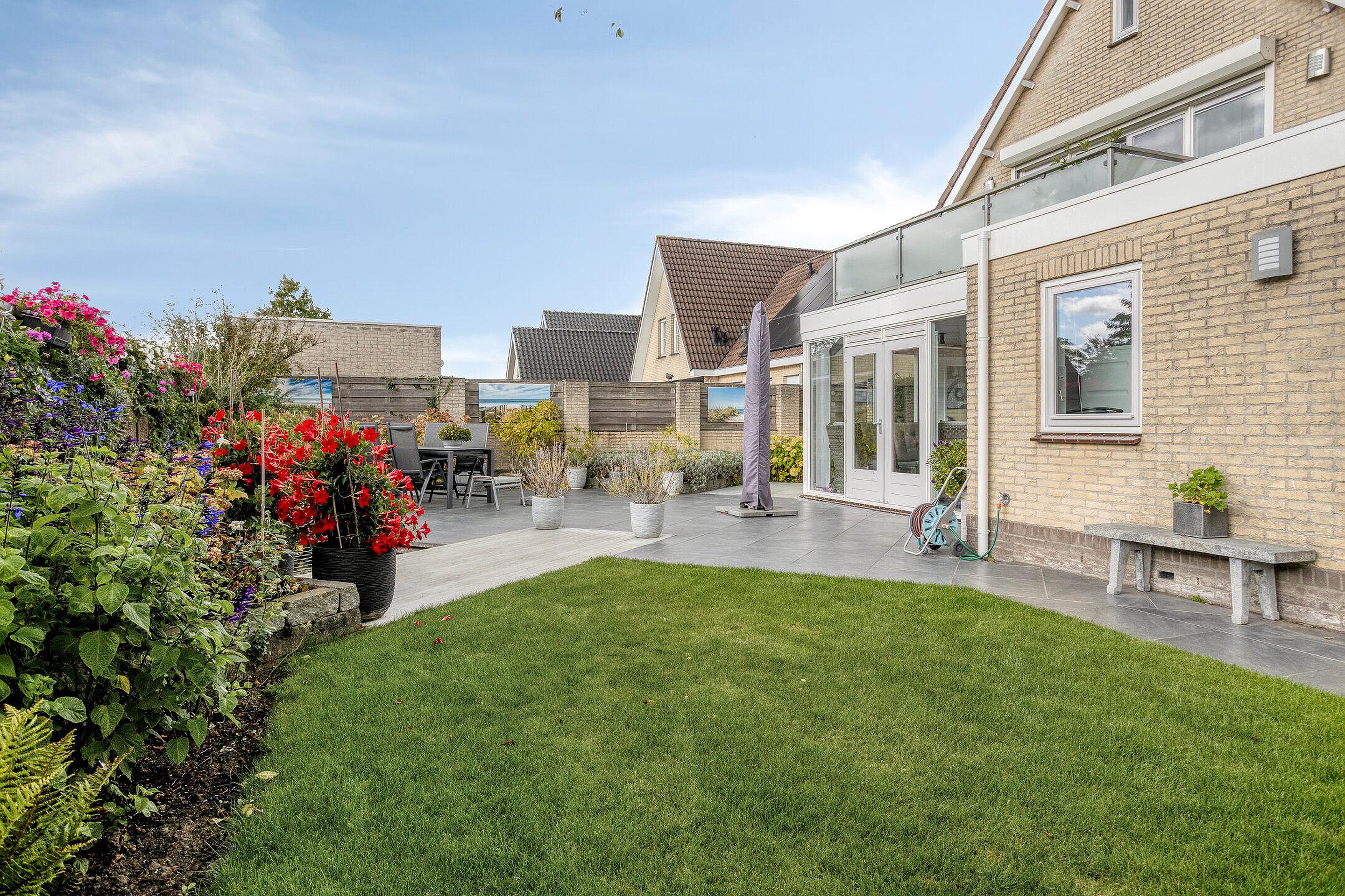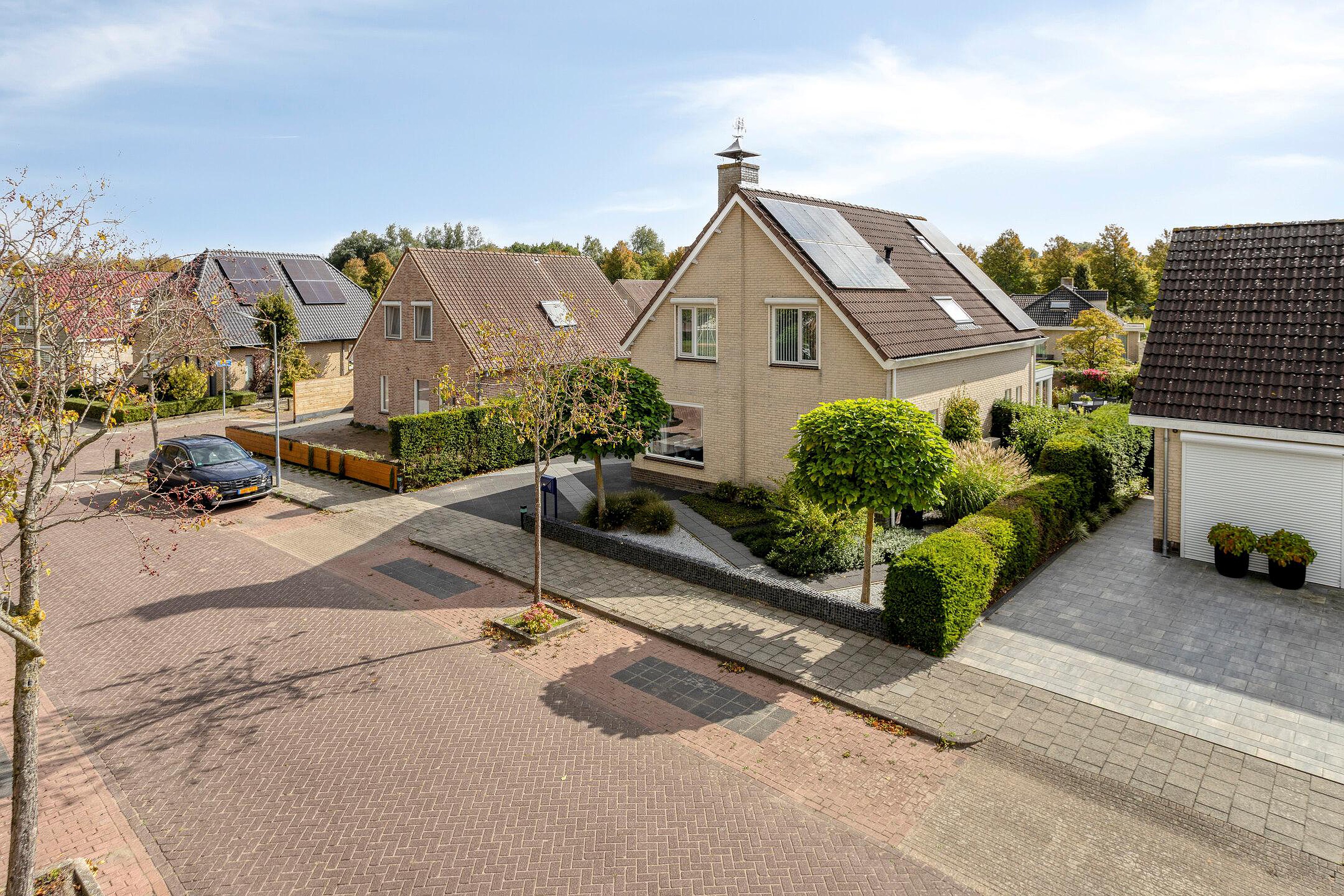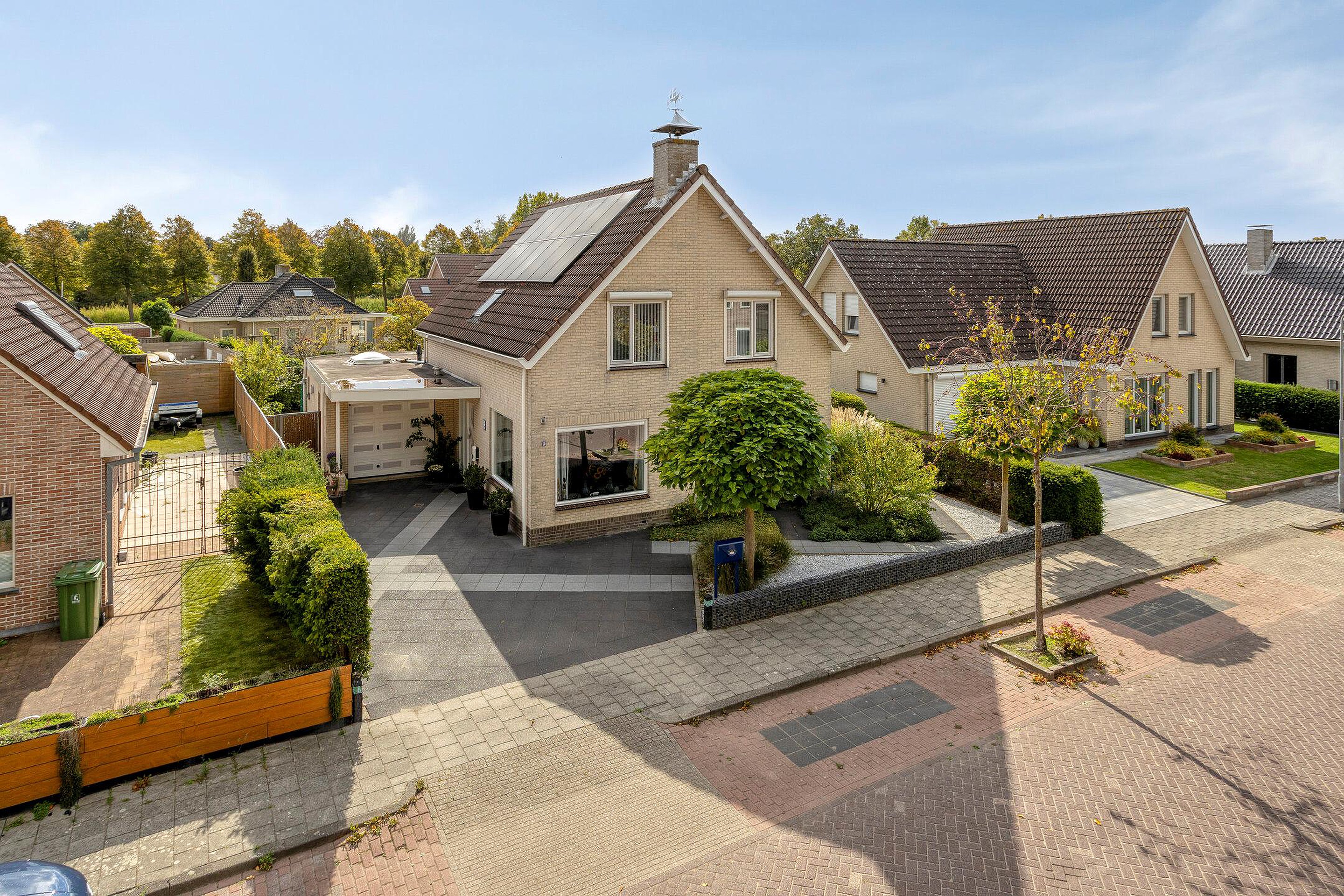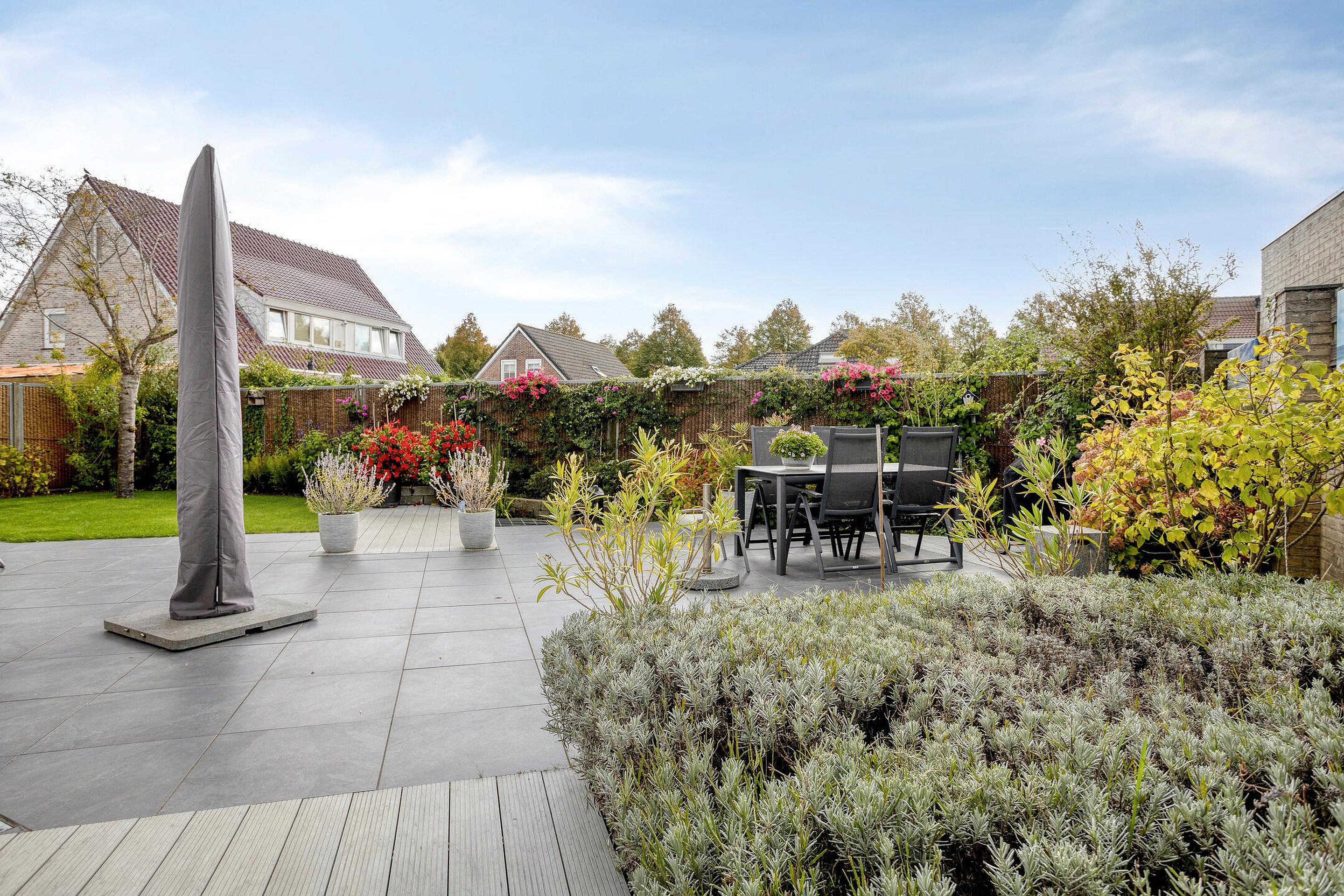 De fraai aangelegde tuin rondom de woning is een heerlijke plek om te ontspannen. Dankzij de gunstige ligging op het zuiden geniet u hier de hele dag van de zon. De vijver en het terras maken de tuin extra sfeervol: een plek waar u in alle rust gezellig samenkomt met familie en/of vrienden. De garage beschikt over een loopdeur naar de tuin en aan de voorzijde is een overkapping aanwezig. De oprit met elektrische laadpaal biedt ruimte voor het parkeren van een auto op eigen terrein.