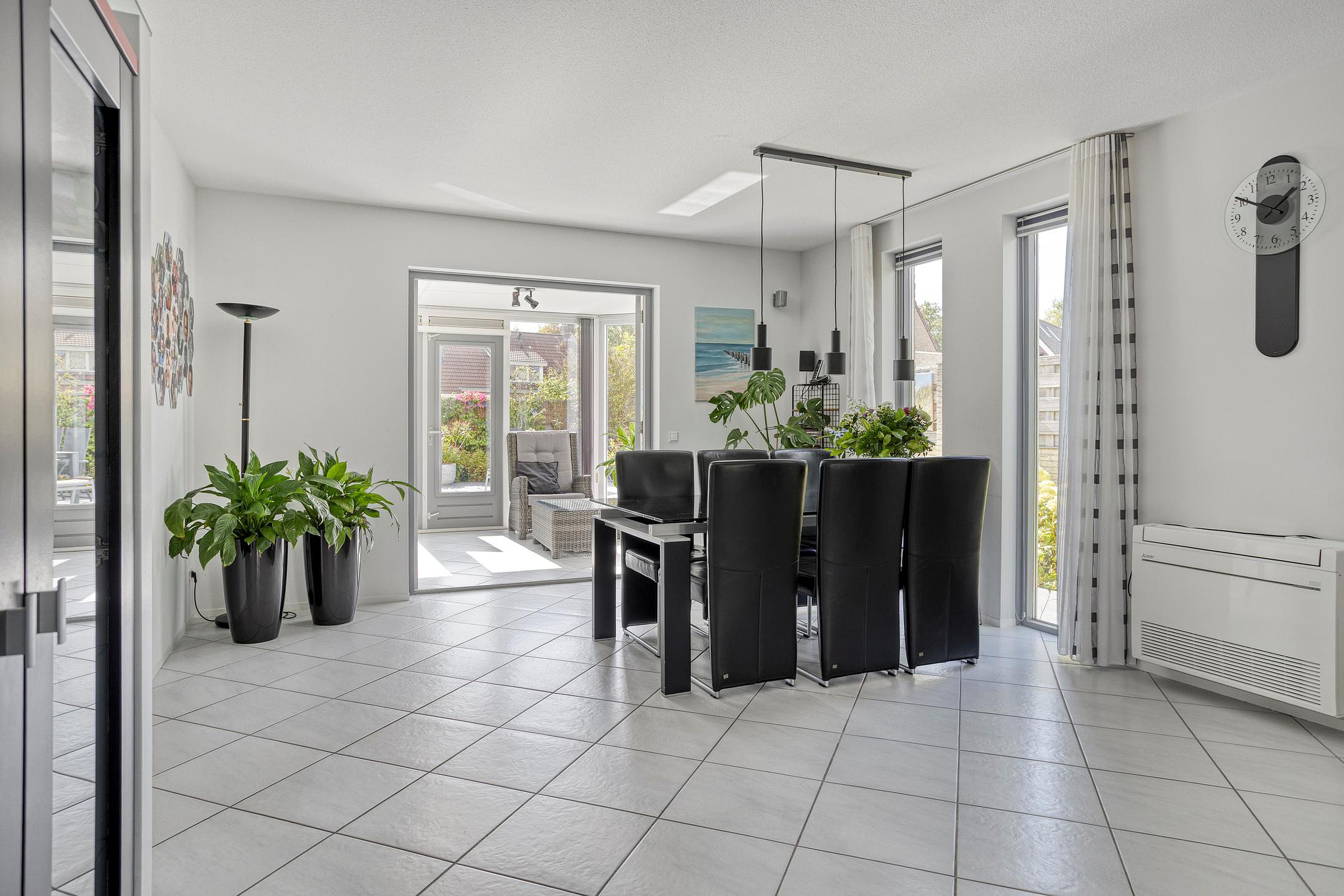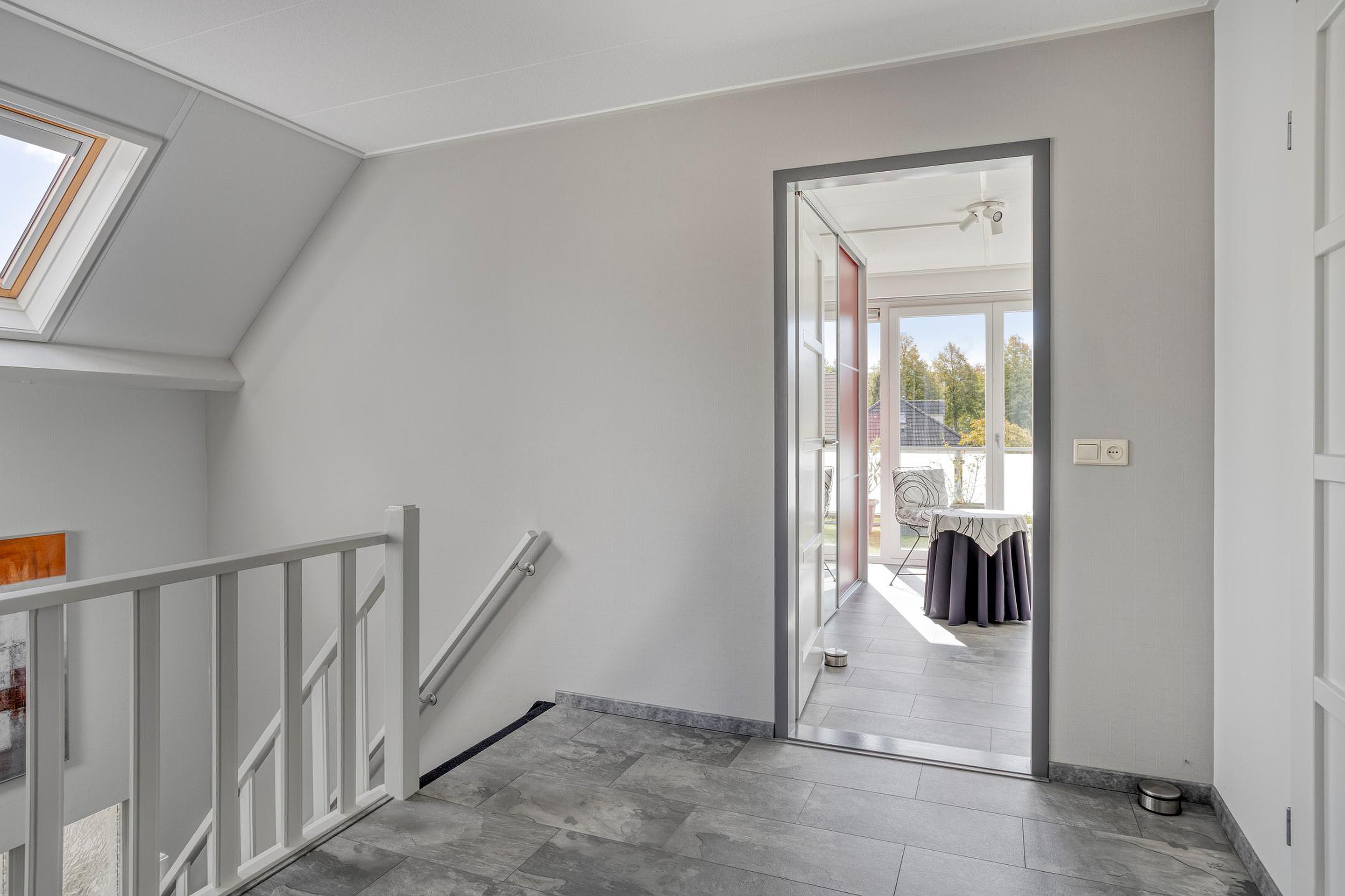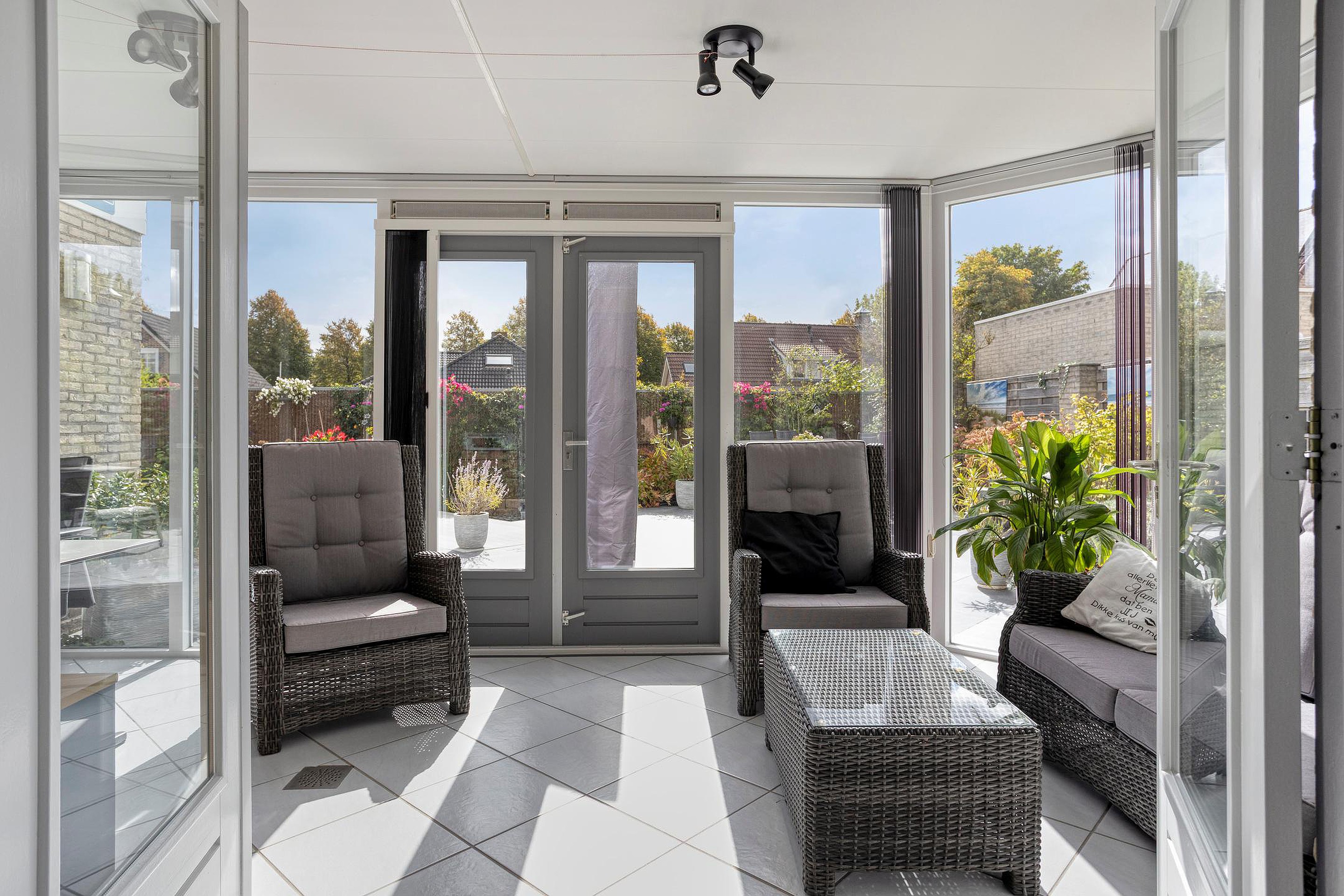 De ruime hal met vide en met modern toilet verwelkomt u stijlvol. Vanuit hier loopt u door naar de royale woonkamer (ca. 54 m2), waar de gashaard zorgt voor warmte en gezelligheid. Dankzij de vele ramen geniet u hier van een fijne lichtinval. De woonkamer is aan de achterzijde voorzien van openslaande deuren richting de serre. Deze serre (ca. 12 m2) functioneert als een verlengstuk van de woonkamer en biedt een fijne, lichte ruimte. De openslaande tuindeuren zorgen voor een fijne verbinding met de tuin.