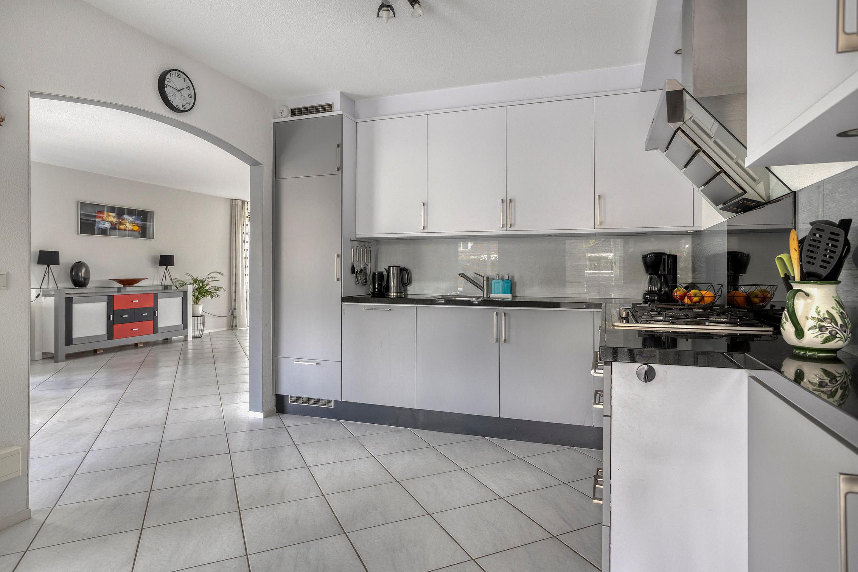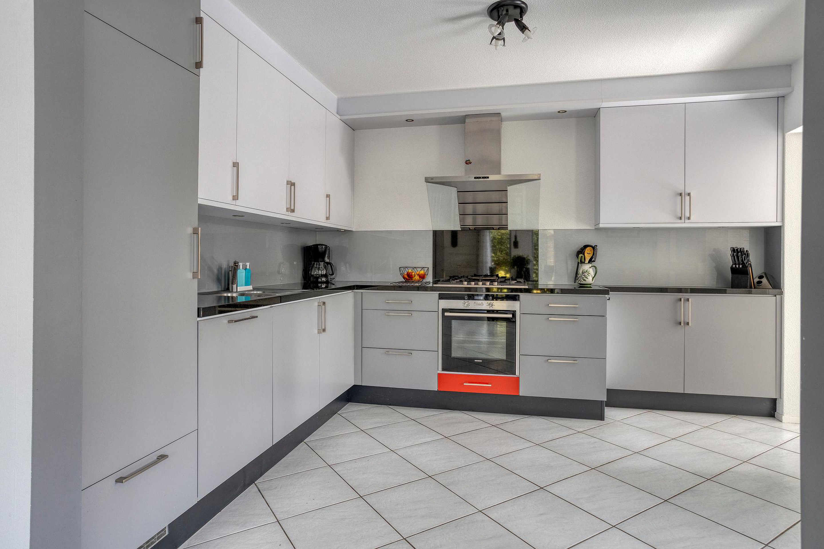De ruime keuken (ca. 11,3m2) met nette keukenopstelling biedt alles wat een kookliefhebber zich kan wensen. De inbouwapparatuur bestaat uit een gaskookplaat, afzuigkap, vaatwasser, koelkast en oven. Aangrenzend vindt u de praktische bijkeuken (ca. 7,3 m2) met inbouwkasten en toegang tot de ruime garage, waar ook de cv-installatie (Atag, 2017) is geplaatst.