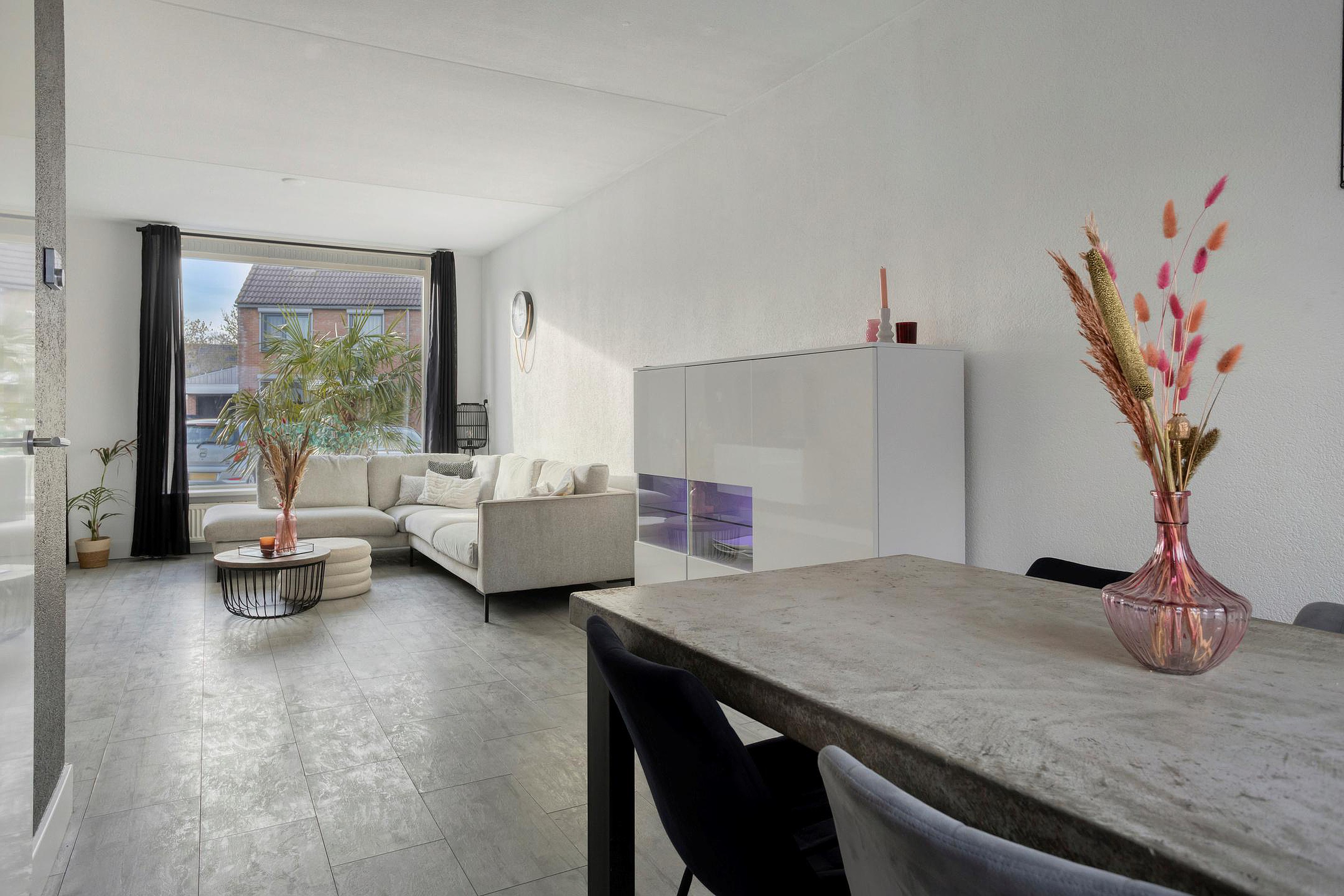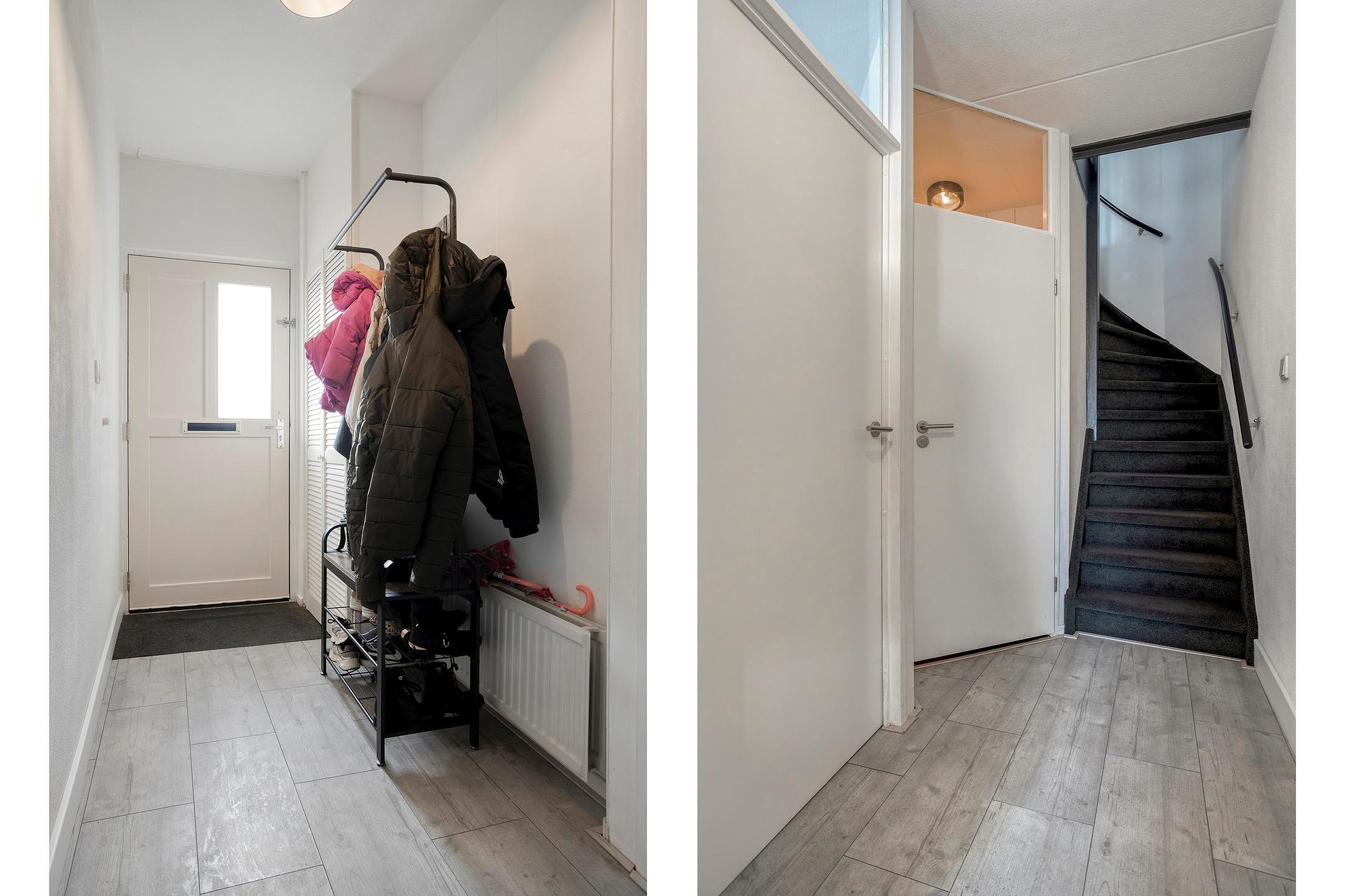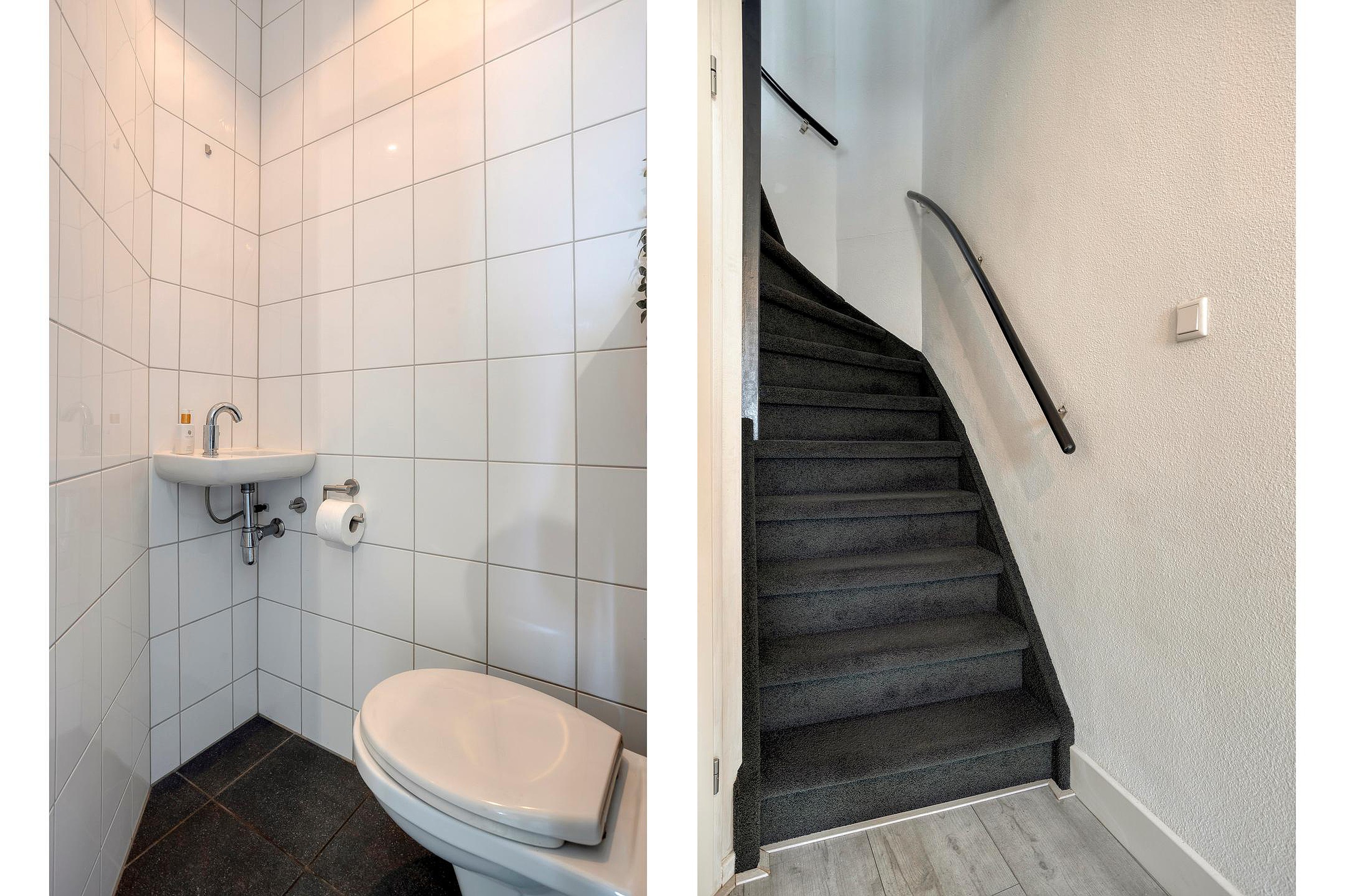 Je betreedt de woning via de ruime hal met meterkast, toilet en trapopgang. Het toilet is netjes uitgevoerd met een hangend toilet en een fonteintje. De lichte woonkamer valt direct op door de prettige lichtinval en de fijne indeling met een gezellige zithoek en eethoek. Daarnaast is er een praktische trapkast aanwezig voor extra bergruimte.