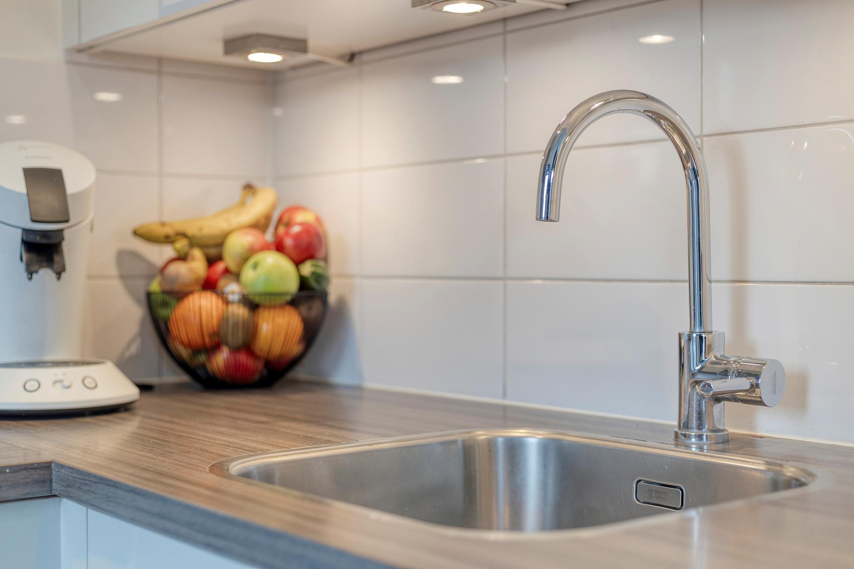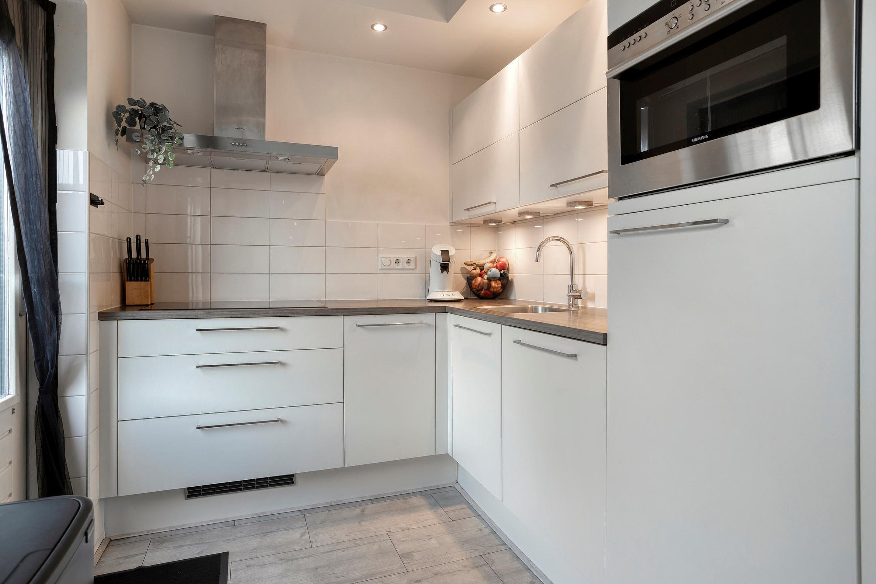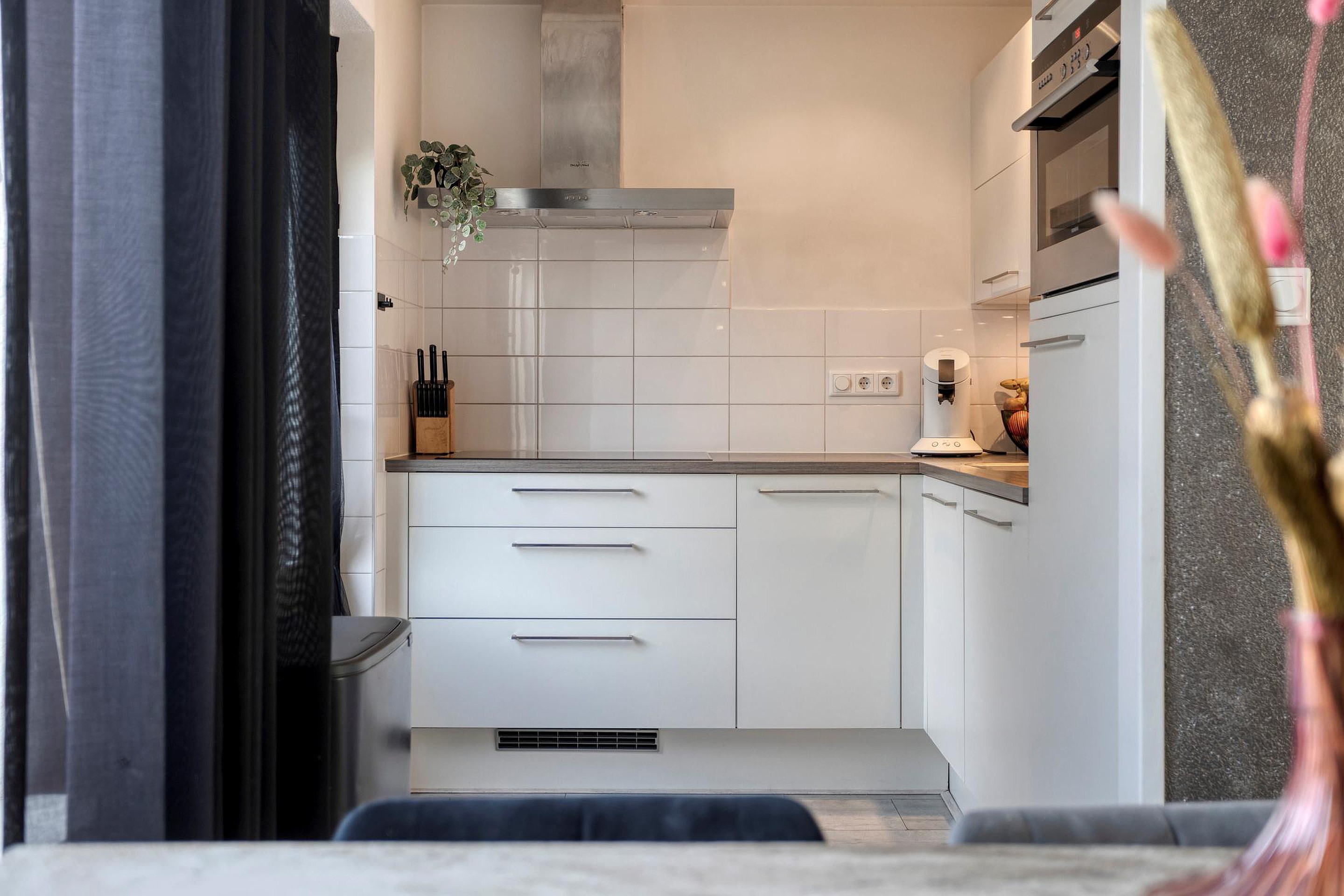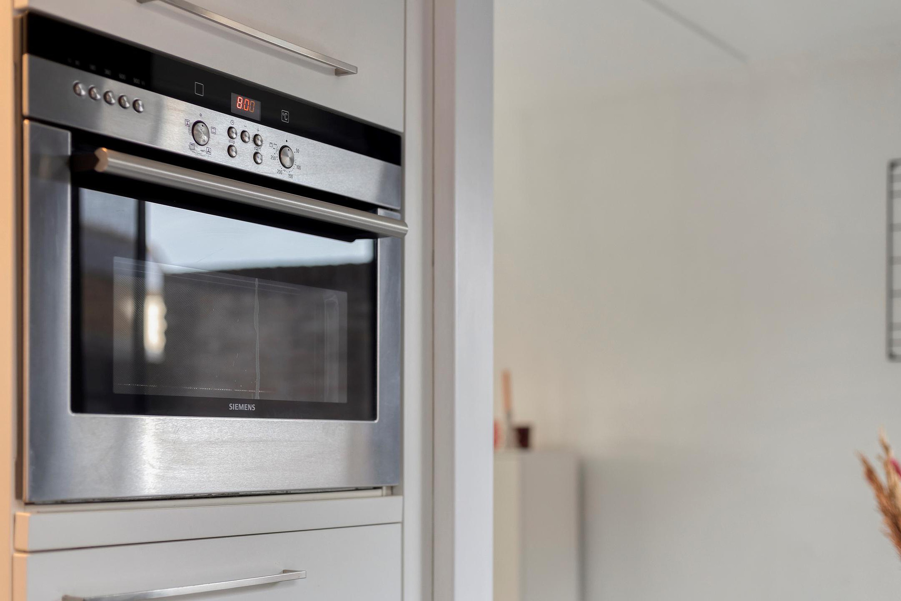De keuken beschikt over een nette keukenopstelling met diverse inbouwapparatuur, waaronder een kookplaat, afzuigkap, combioven, koel-vriescombinatie en vaatwasser. Vanuit de keuken is er directe toegang tot de achtertuin.