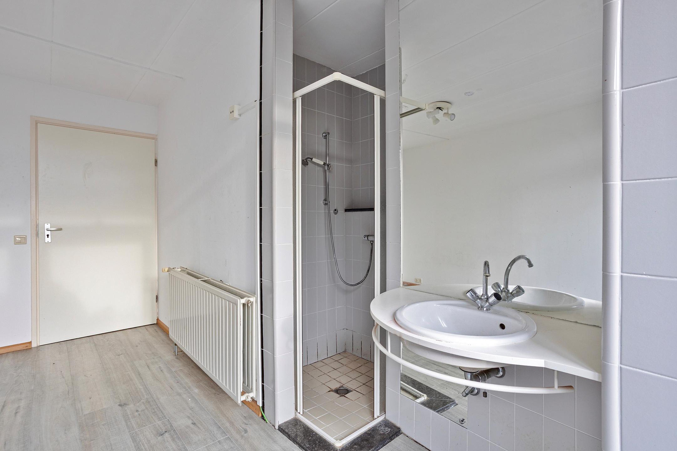 Bij binnenkomst bereikt u de hal met toilet en trapopgang, waarna de royale woonkamer in het oog springt. De brede raampartijen zorgen voor een lichte en open sfeer, terwijl de open haard het geheel een warme uitstraling geeft. Aan de achterzijde bevindt zich de eetkamer, die in open verbinding staat met de woonkamer en zicht biedt op de achtertuin. Aansluitend ligt de halfopen keuken, praktisch ingedeeld en met directe toegang tot de tuin. Op de begane grond is de voormalige garage omgebouwd tot een extra slaapkamer of werkruimte, compleet met een eigen badkamer. Deze ruimte is ideaal voor wie gelijkvloers wil wonen, een praktijk aan huis zoekt of behoefte heeft aan een zelfstandige werkplek.