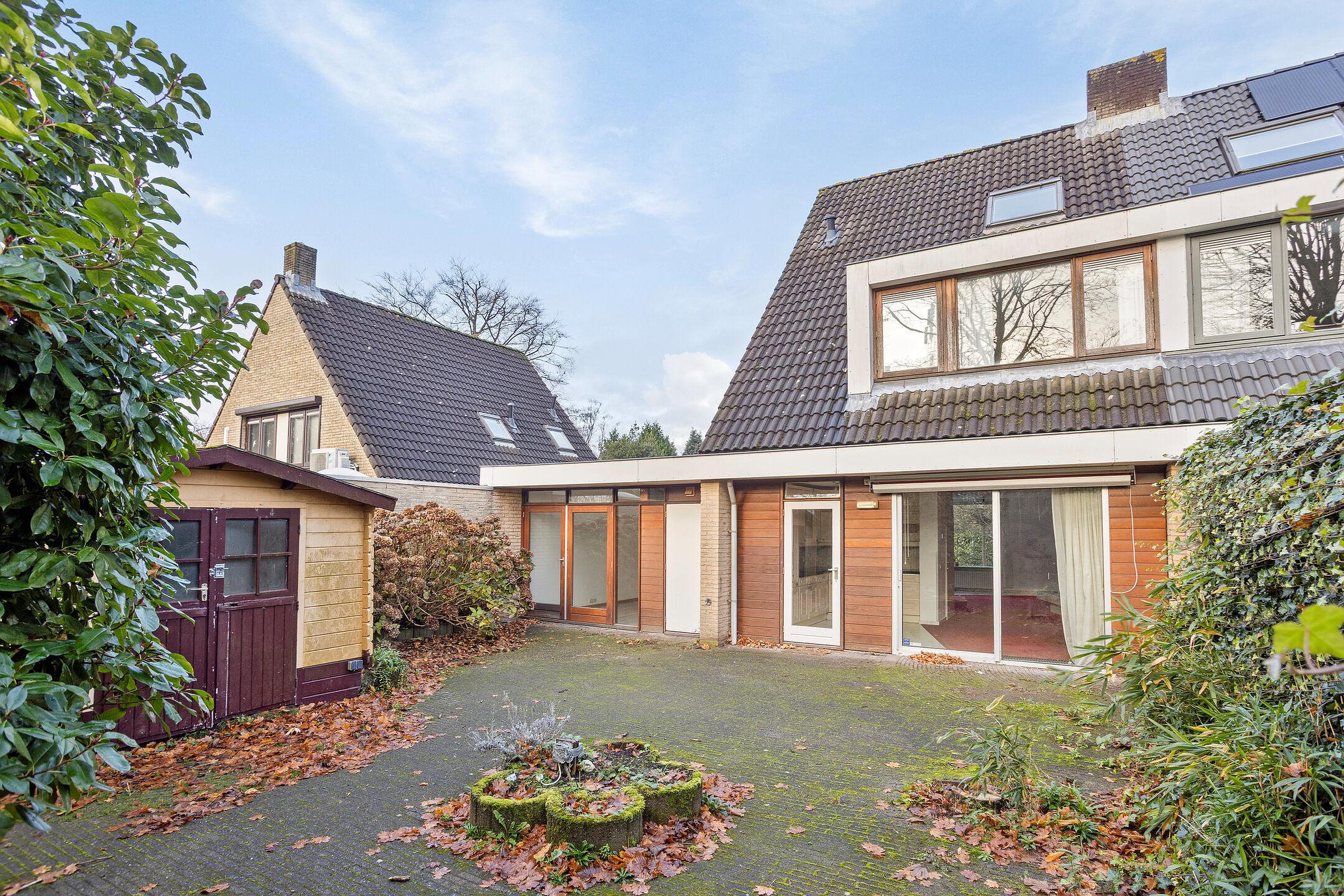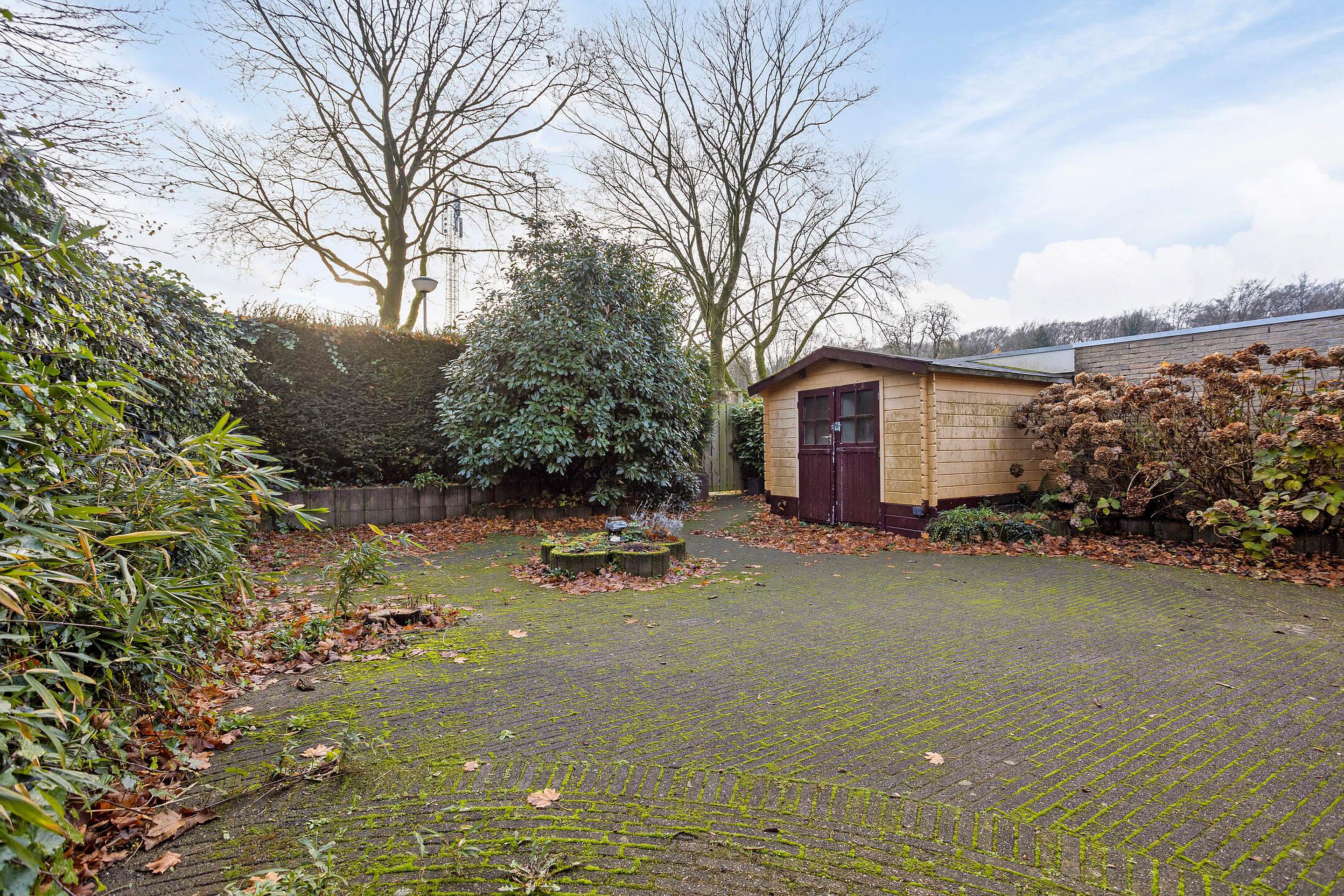 De achtertuin is diep, volledig omsloten en biedt veel privacy. De tuin bestaat grotendeels uit bestrating en groenborders en vormt een rustige plek om te genieten van de buitenruimte, met volop mogelijkheden voor herinrichting. Een vrijstaande houten berging biedt extra opbergruimte.