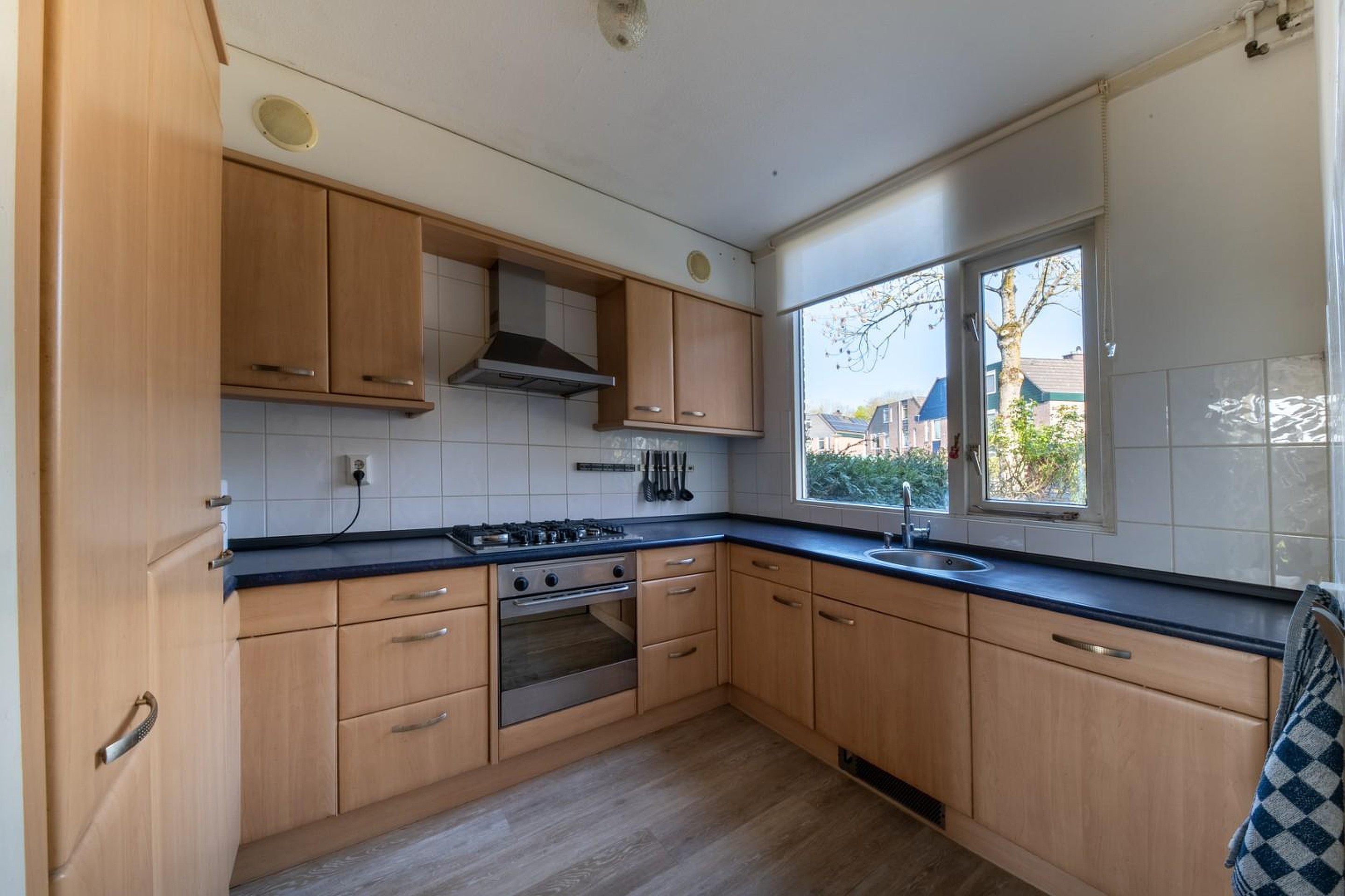 Aan de voorzijde bevindt zich de half open keuken, die op een natuurlijke manier in verbinding staat met de woonkamer. Vanuit hier heb je zicht op het pleintje, wat zorgt voor een levendig maar toch rustig straatbeeld. De opstelling biedt een goede basis en de ruimte om de keuken geheel naar eigen wens en stijl in te richten.