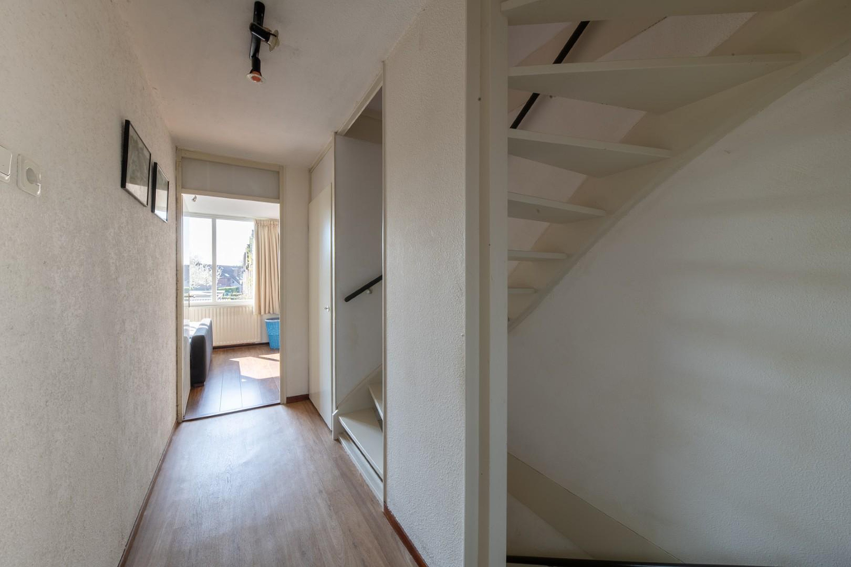 Via de entree kom je in de hal, die toegang geeft tot de woonkamer en de verdieping. De tuingerichte woonkamer vormt het hart van het huis en valt direct op door de fijne lichtinval en het contact met buiten. Hier kijk je uit op de tuin en ervaar je een prettige rust. De ruimte biedt volop mogelijkheden om een sfeervolle zithoek en eethoek te creëren.
