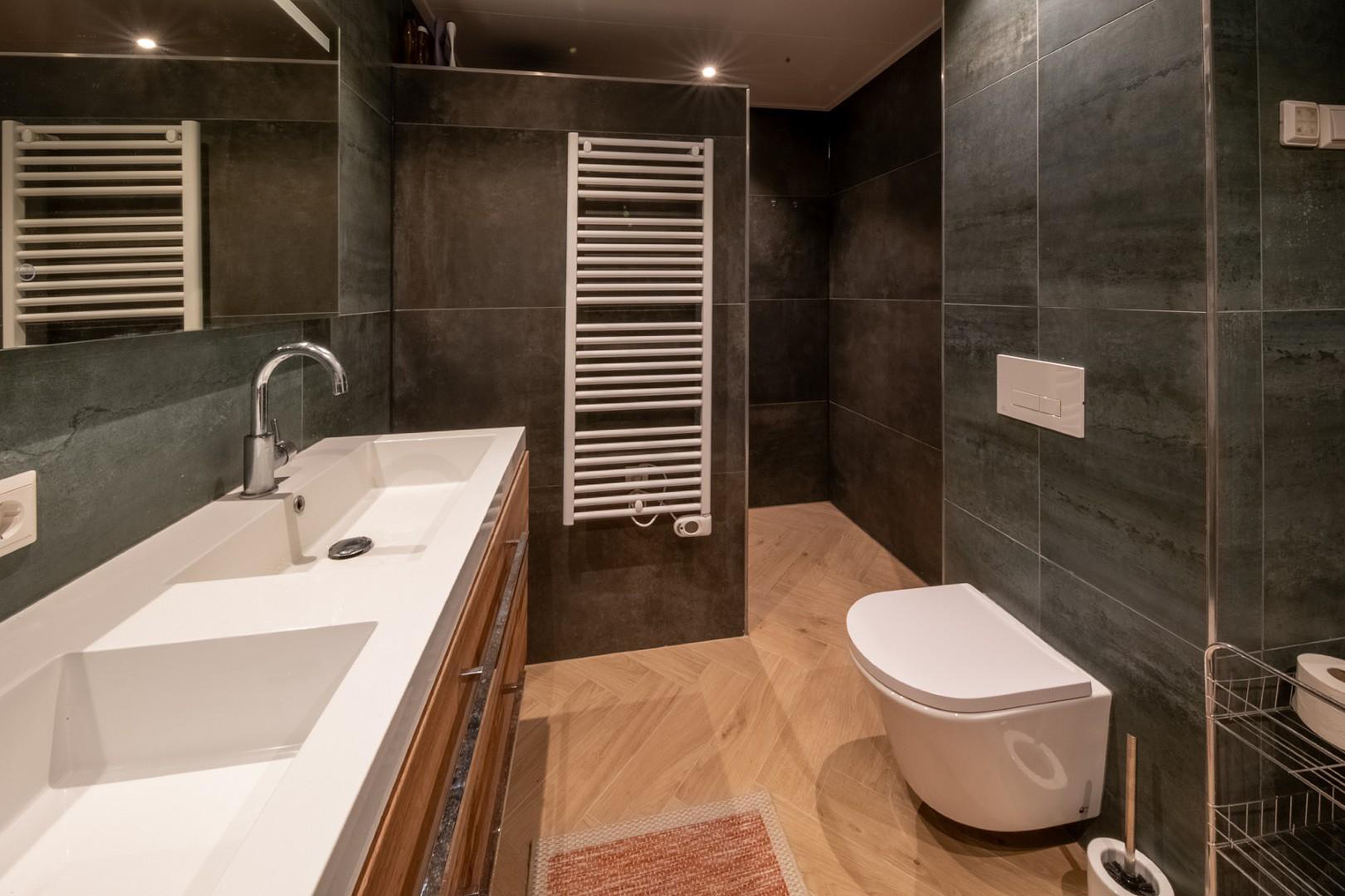 De badkamer is royaal en eigentijds uitgevoerd en beschikt over een dubbele wastafelmeubel, een tweede toilet en een ruime inloopdouche. Een verzorgde en comfortabele ruimte die aansluit bij de woonwensen van nu.