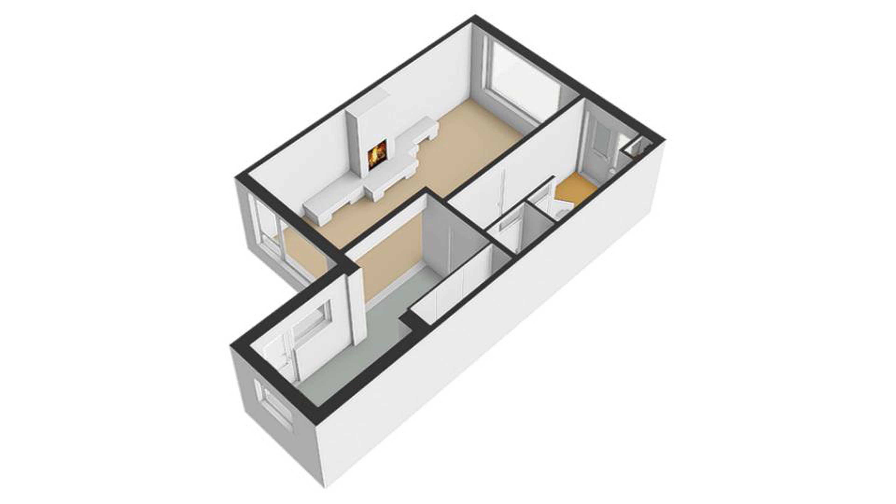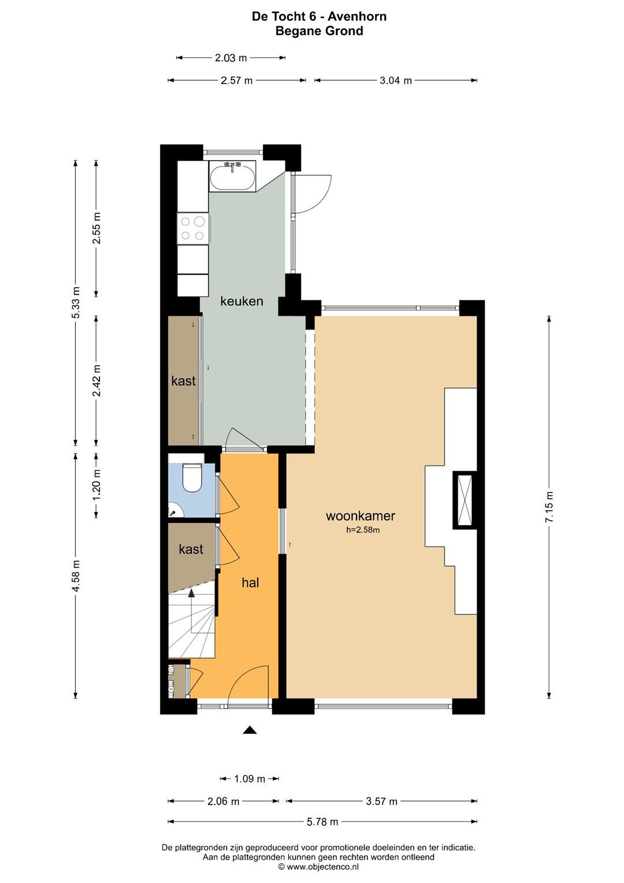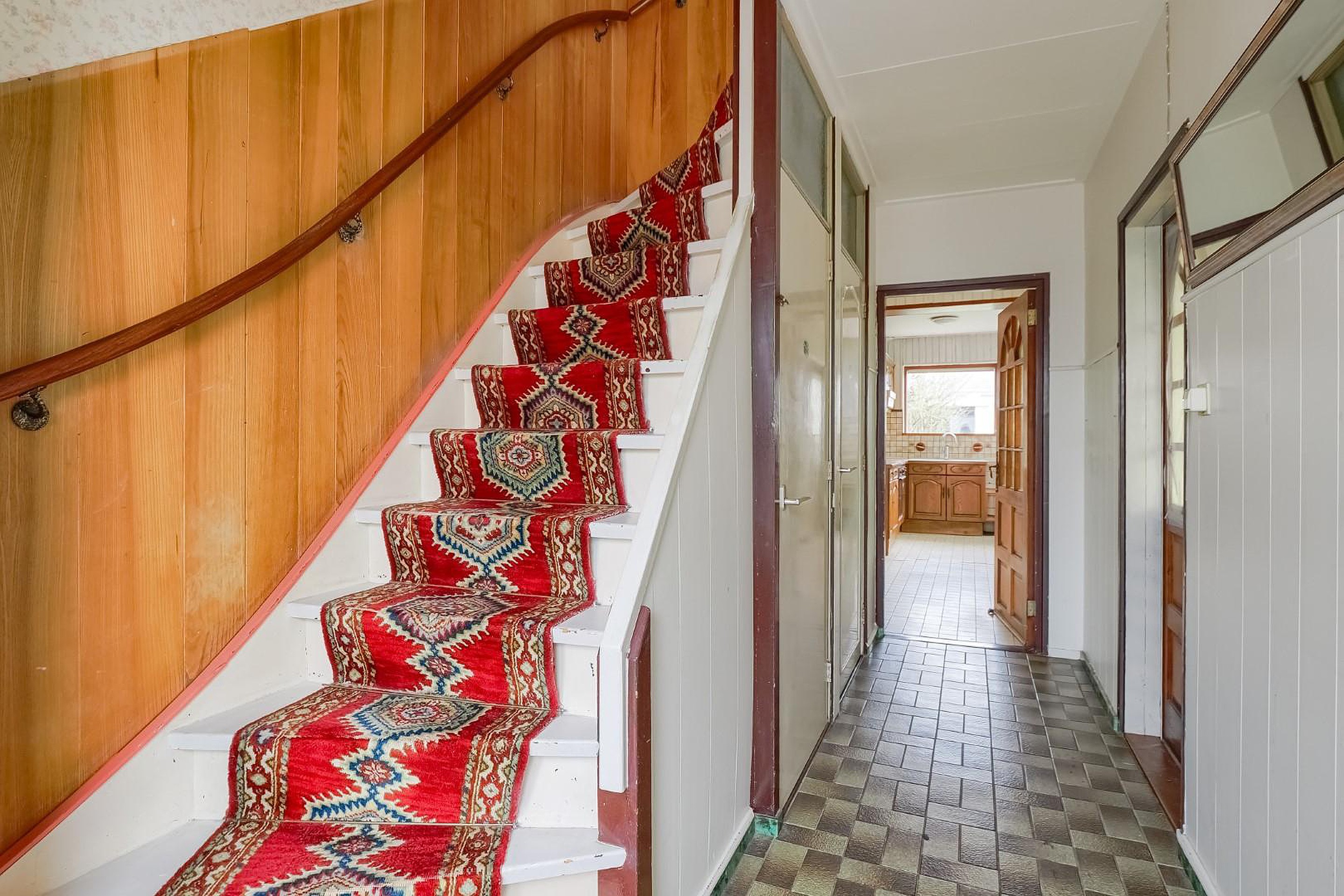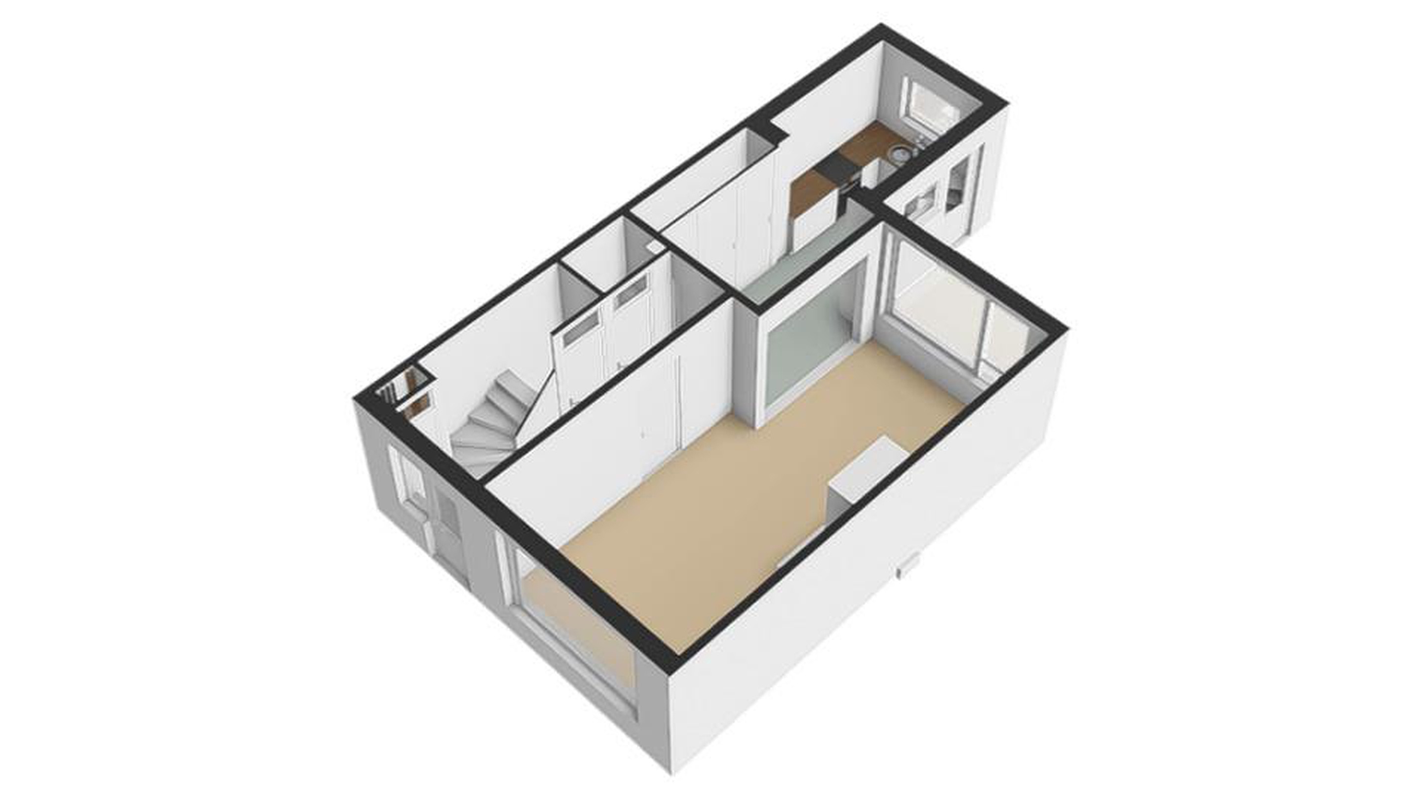 Begane grond Entree/hal met meterkast, trapopgang, trapkast en toilet, keuken in uitbouw, woonkamer met rookkanaal.
