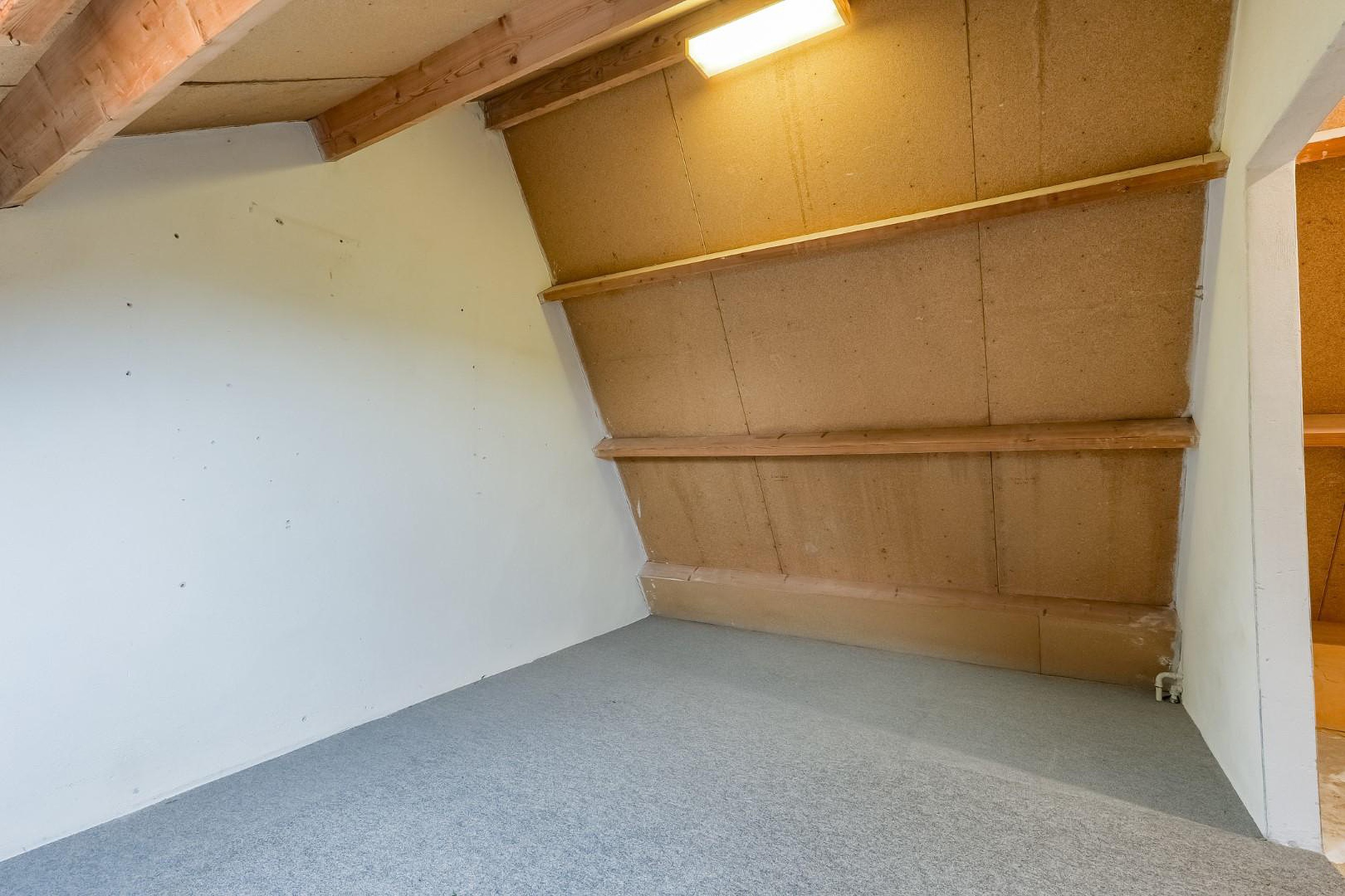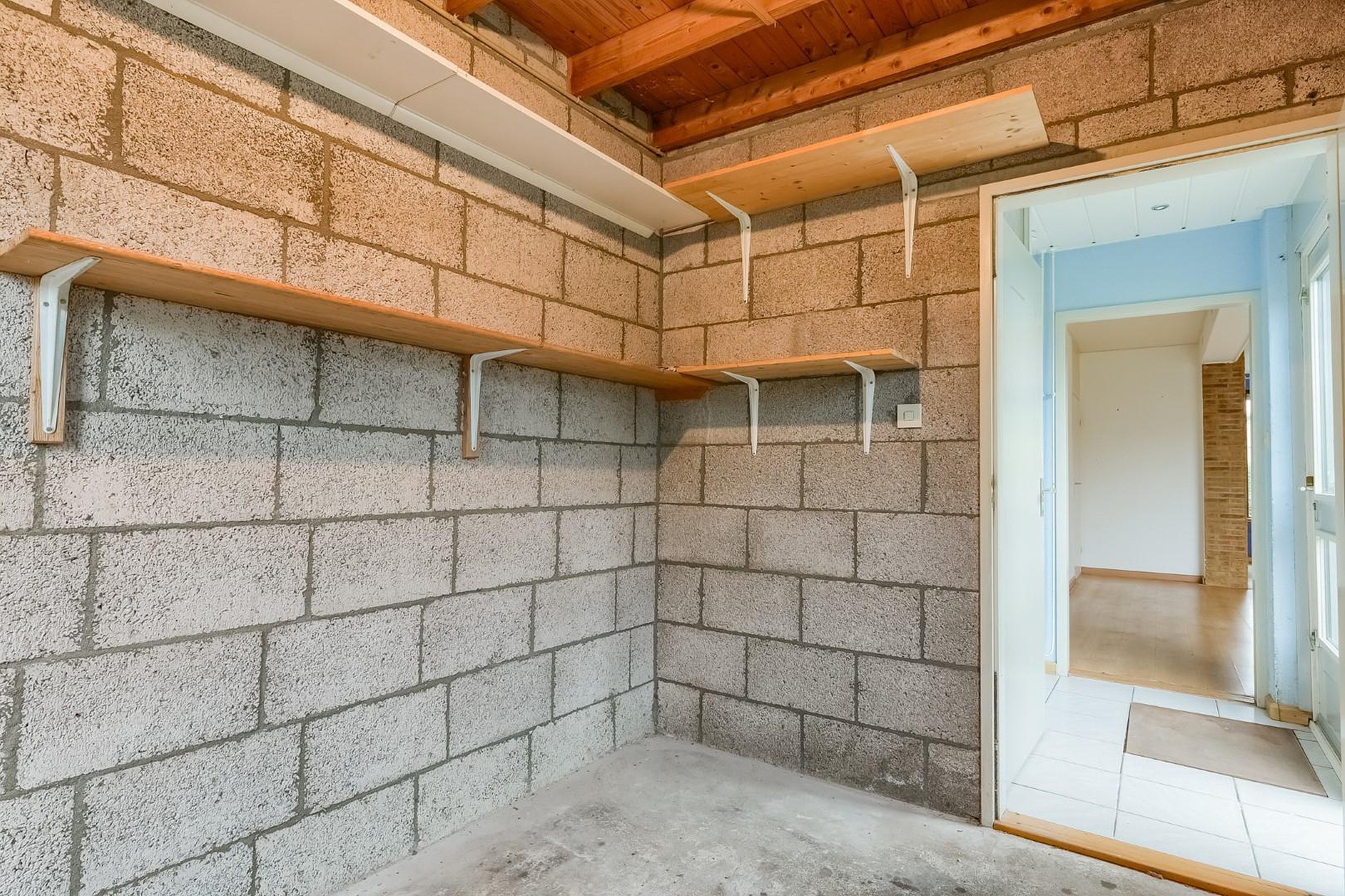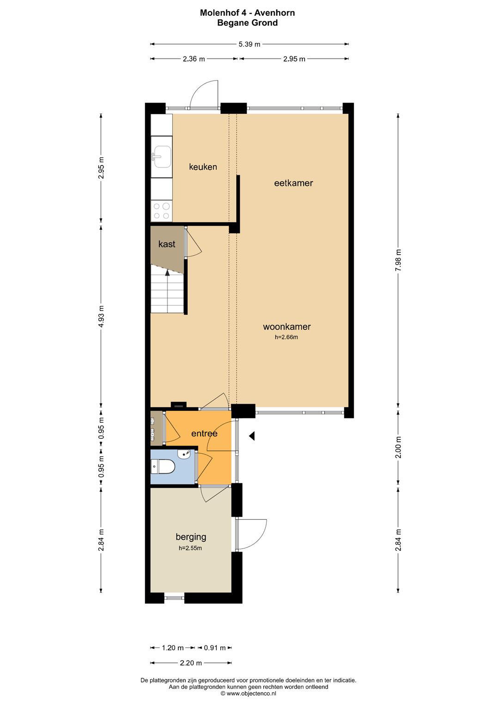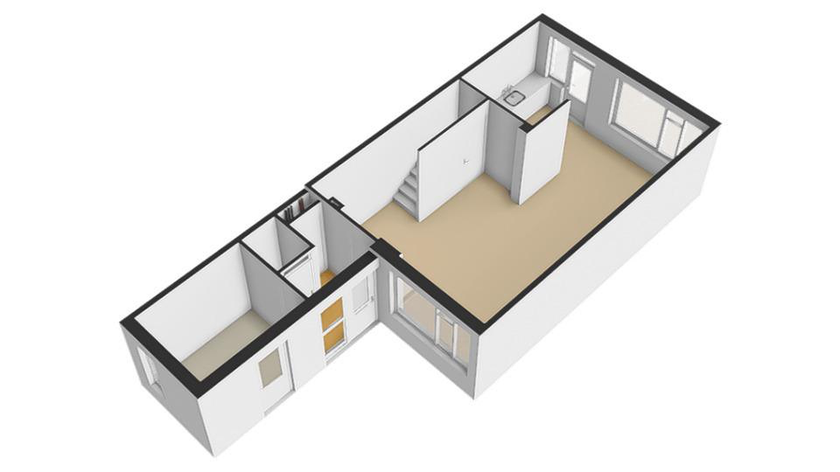 Entree/hal met toegang naar berging, toilet, meterkast. Woonkamer met trapopgang en trapkast, eenvoudige keuken.