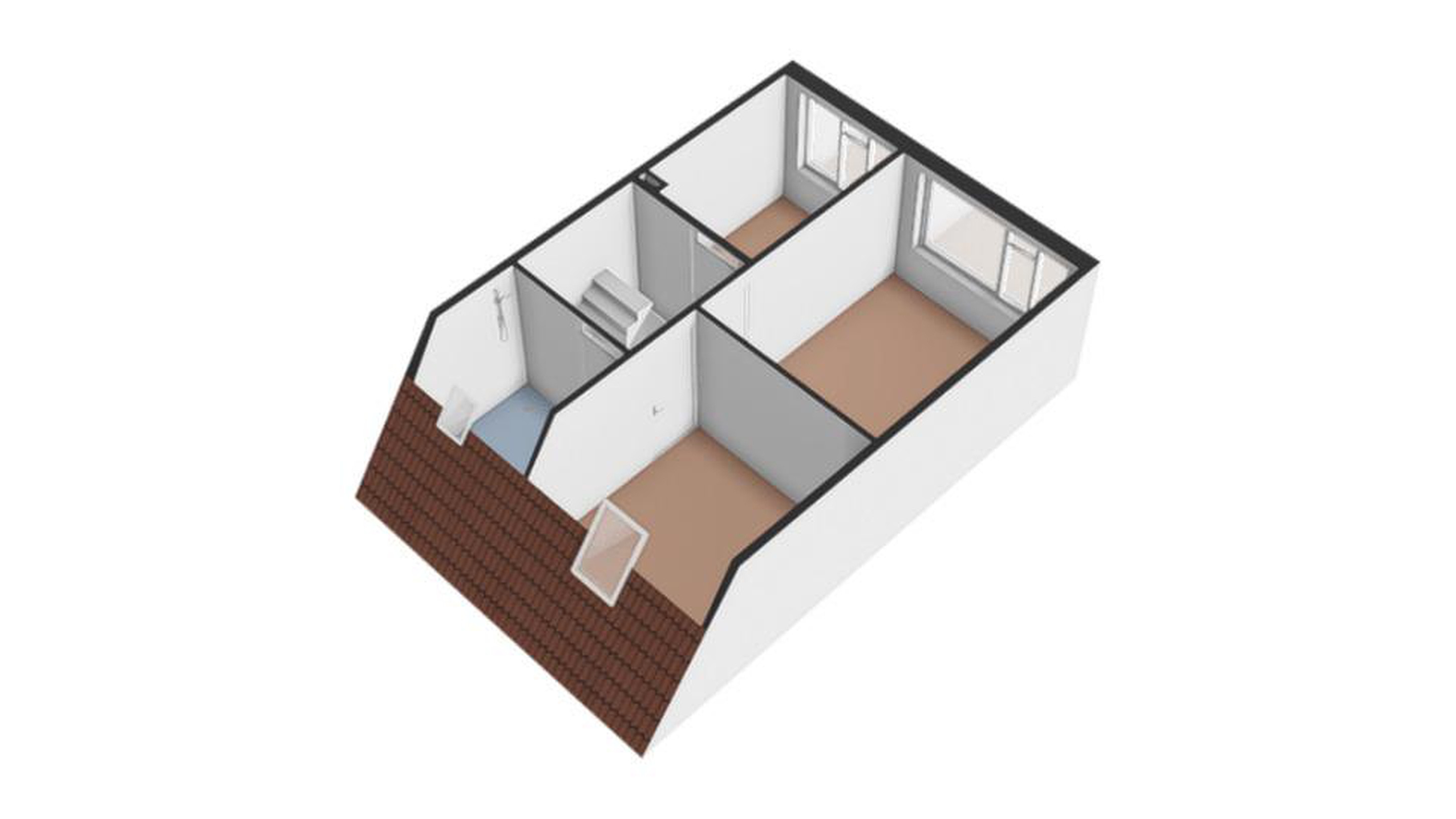 Overloop, 3 slaapkamers, badkamer met 2e toilet, douche en wastafel.