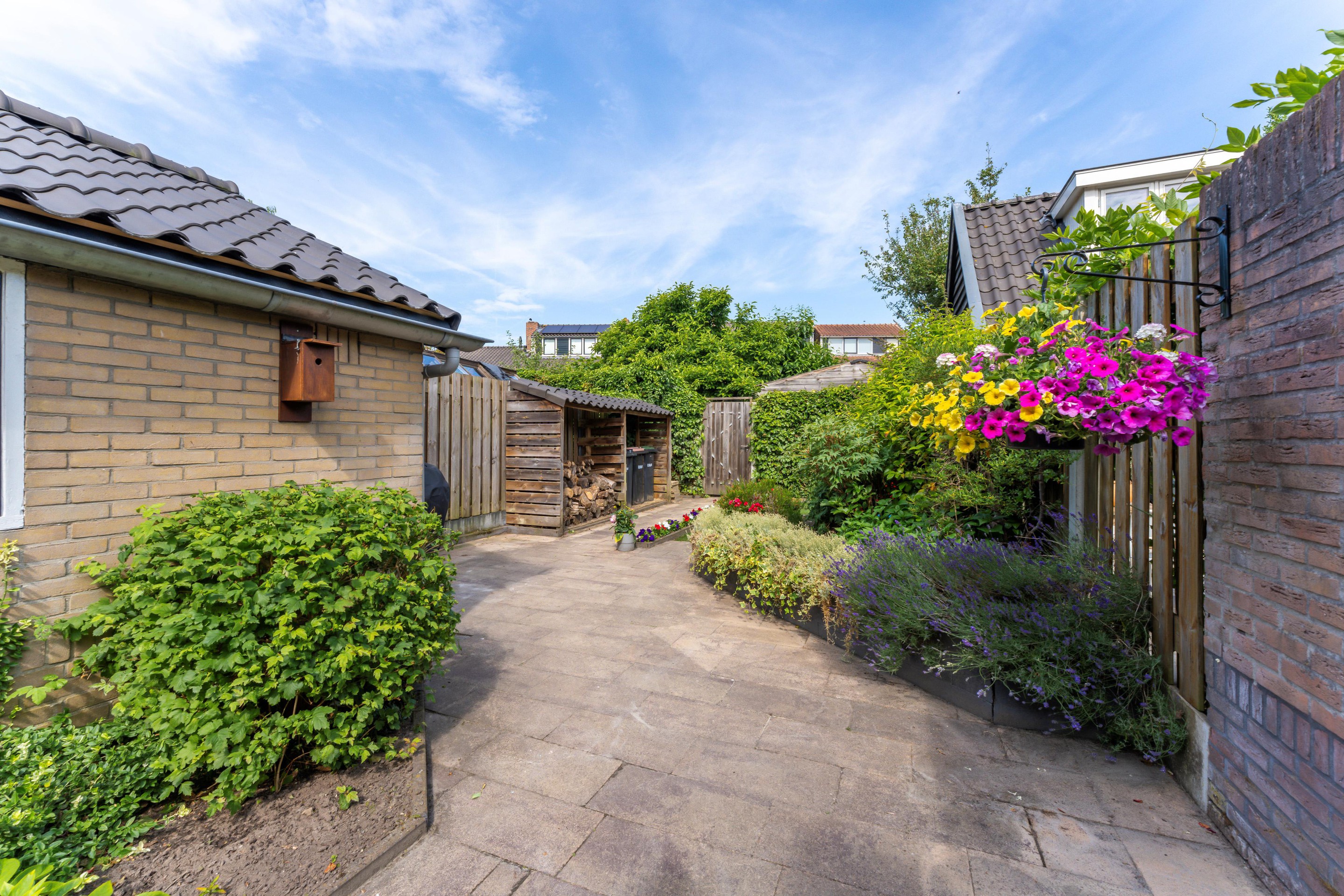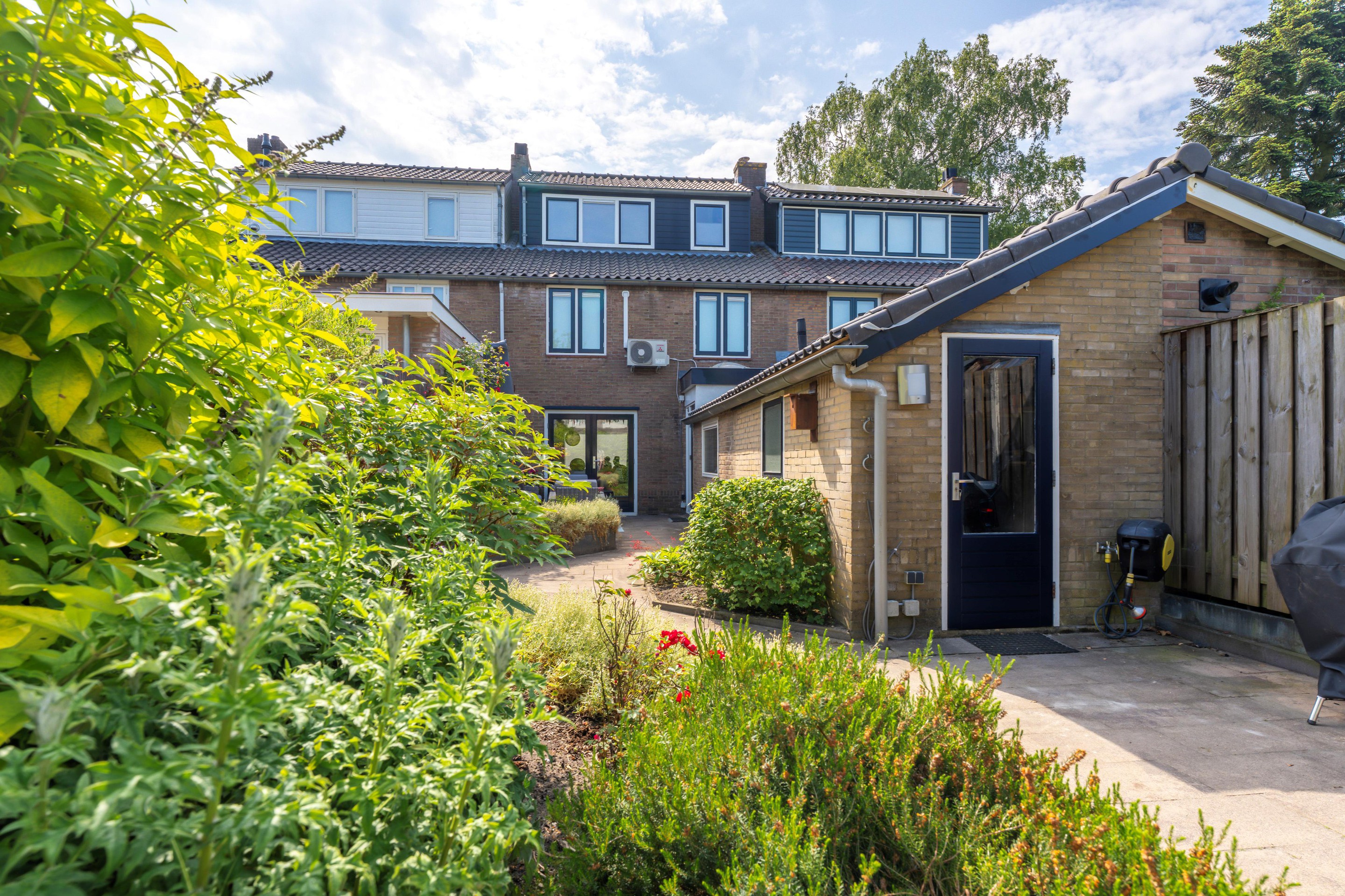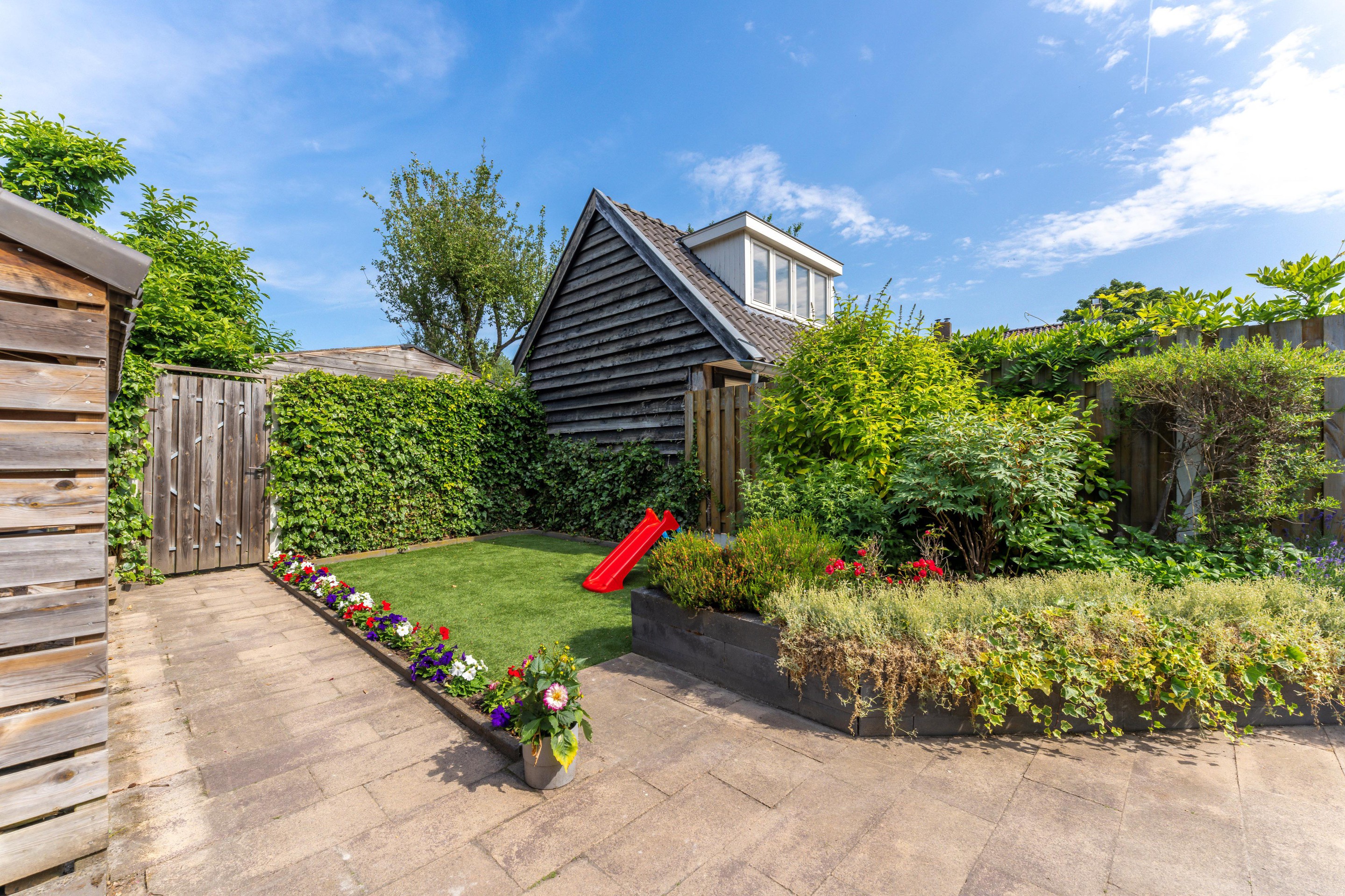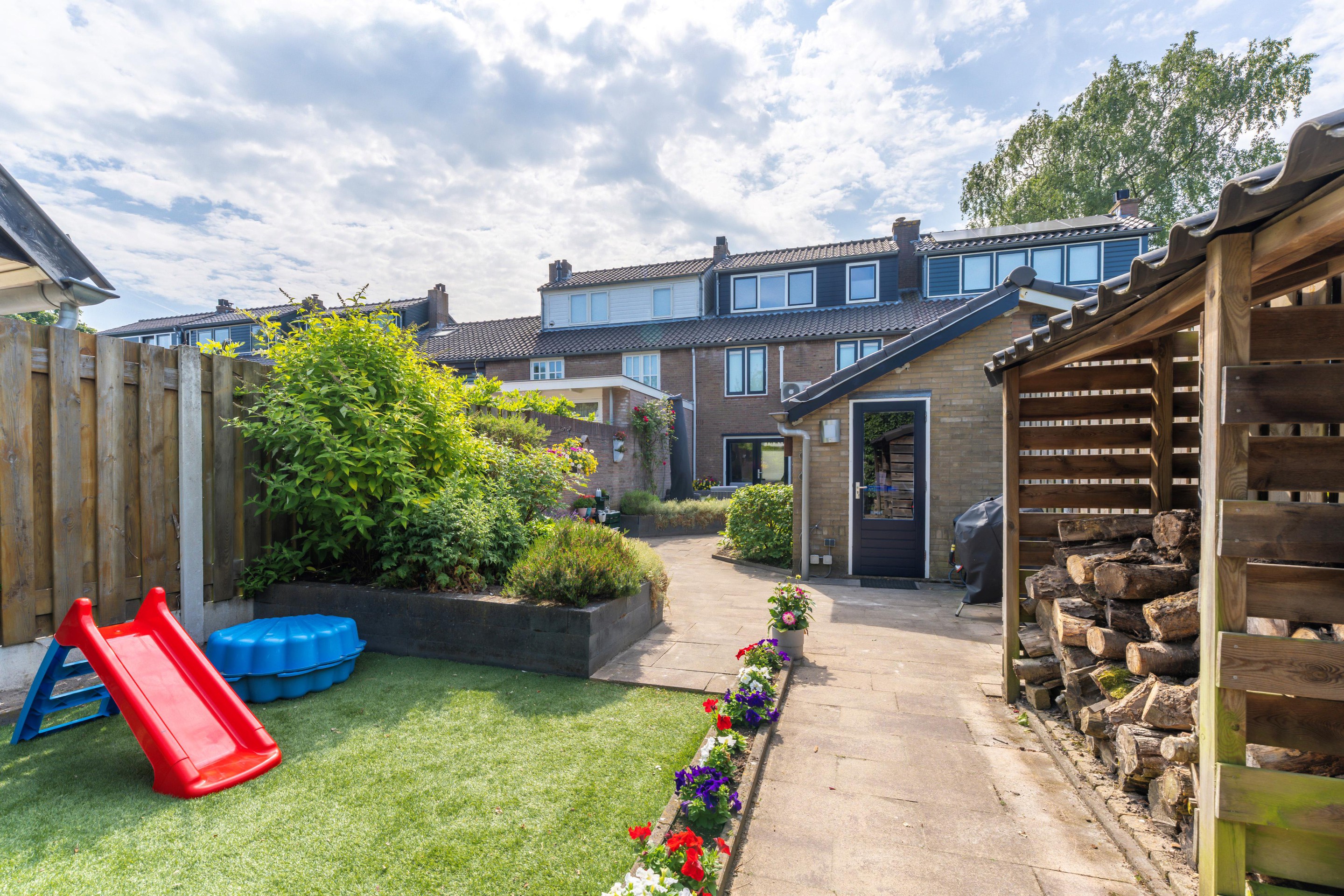 De achtertuin ligt op het noordwesten en biedt een mooie balans tussen zon en schaduw gedurende de dag. Direct aan de woning bevindt zich een ruim terras waar je gezellig kunt zitten en via de openslaande deuren de woonkamer bij je buitenleven betrekt. Verderop is ruimte voor groen en speelgelegenheid, terwijl de achterom zorgt voor extra gemak. De grote, aangebouwde berging biedt volop plaats voor fietsen, tuinspullen en opslag. Een praktische en onderhoudsvriendelijke tuin waar je onbezorgd kunt genieten van het buitenleven.
