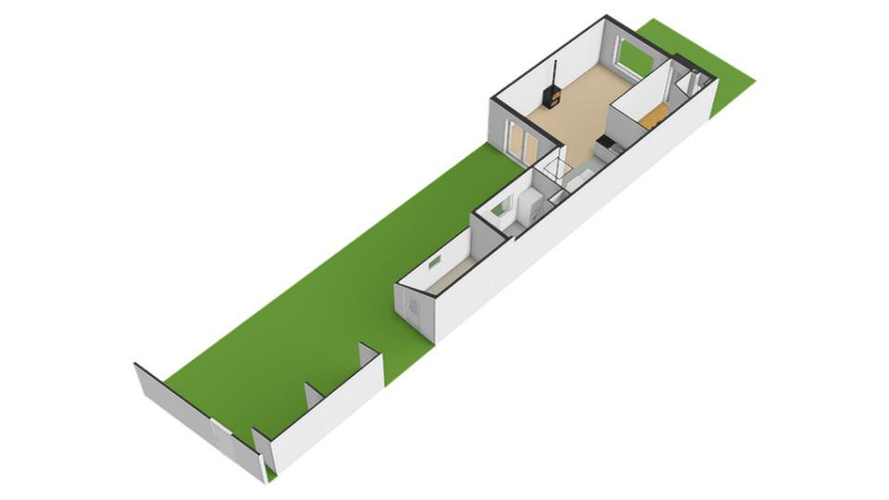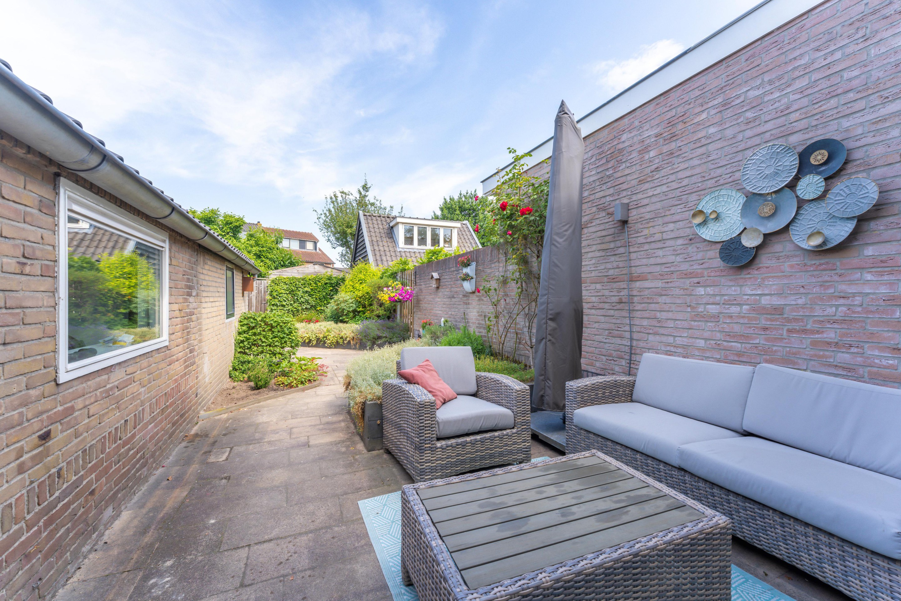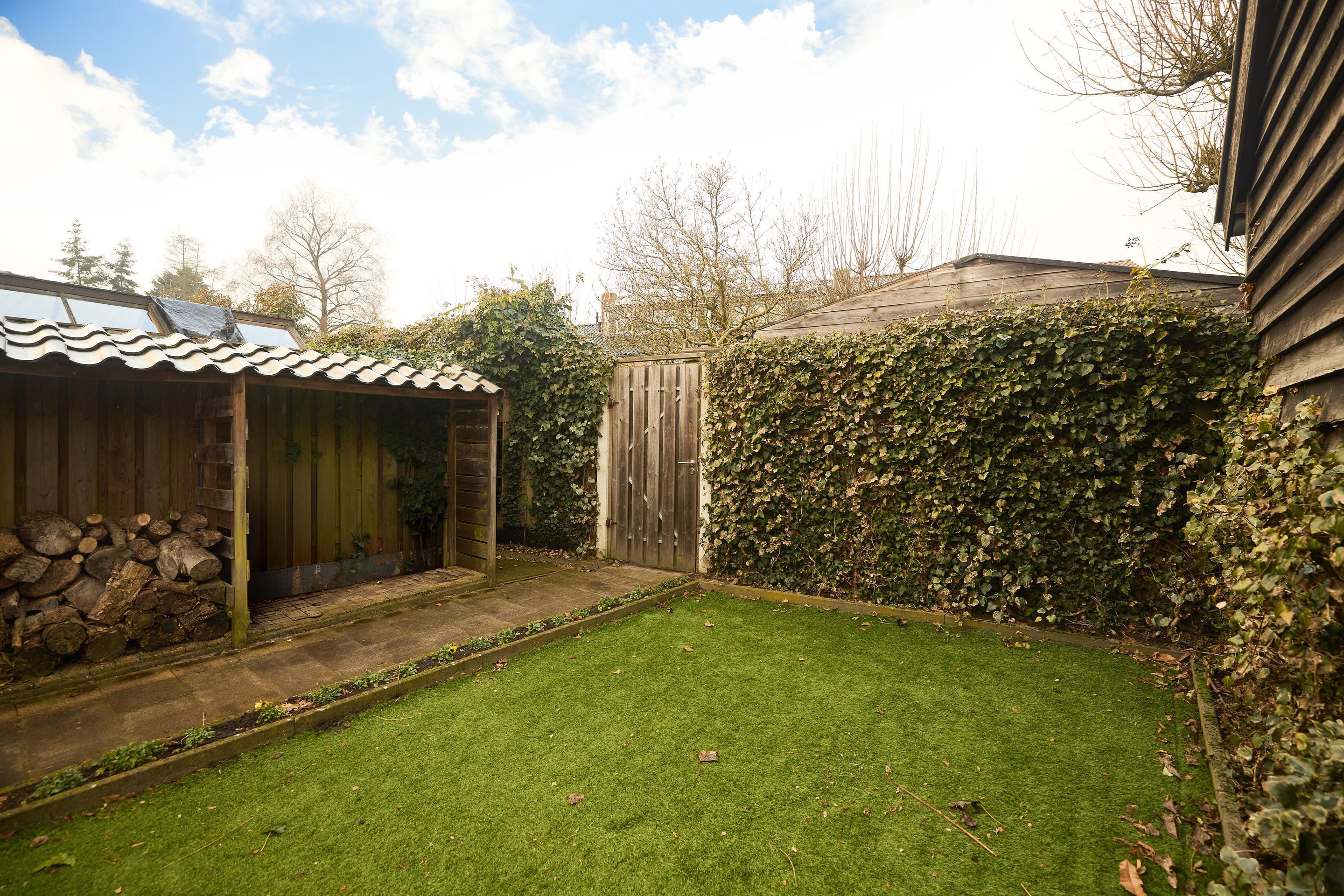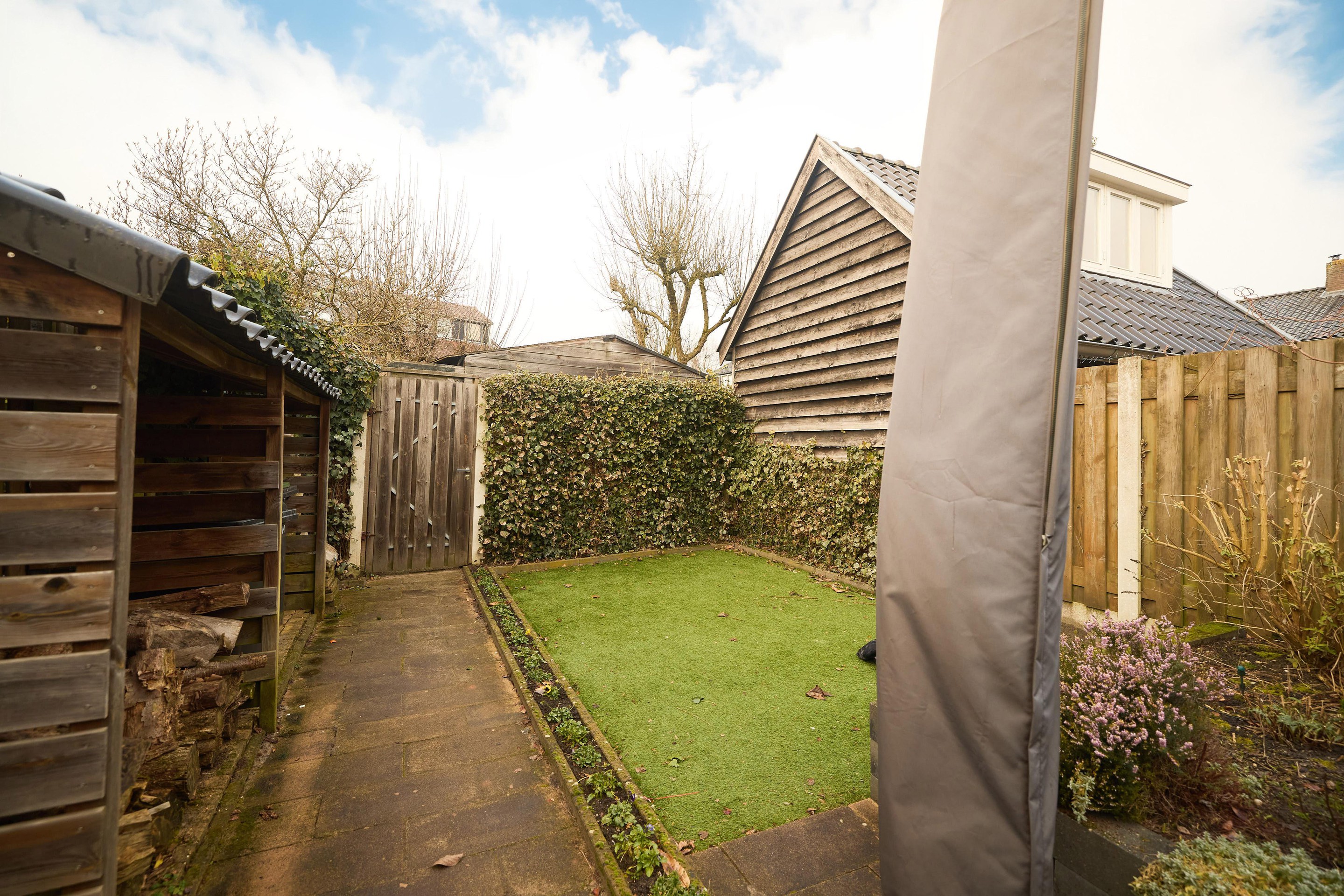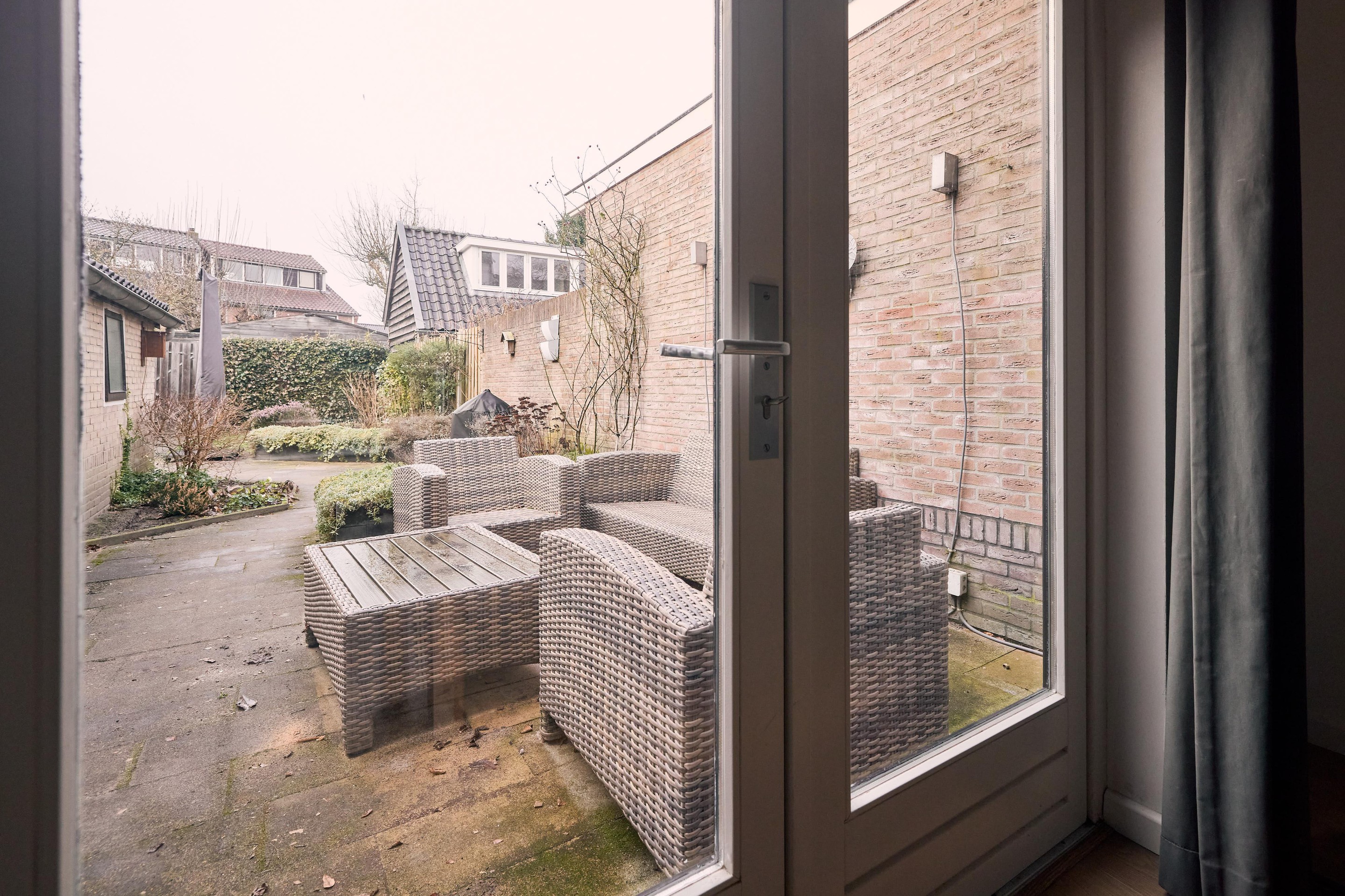 De achtertuin ligt op het noordwesten en biedt een mooie balans tussen zon en schaduw gedurende de dag. Direct aan de woning bevindt zich een ruim terras waar je gezellig kunt zitten en via de openslaande deuren de woonkamer bij je buitenleven betrekt. Verderop is ruimte voor groen en speelgelegenheid, terwijl de achterom zorgt voor extra gemak. De grote, aangebouwde berging biedt volop plaats voor fietsen, tuinspullen en opslag. Een praktische en onderhoudsvriendelijke tuin waar je onbezorgd kunt genieten van het buitenleven.