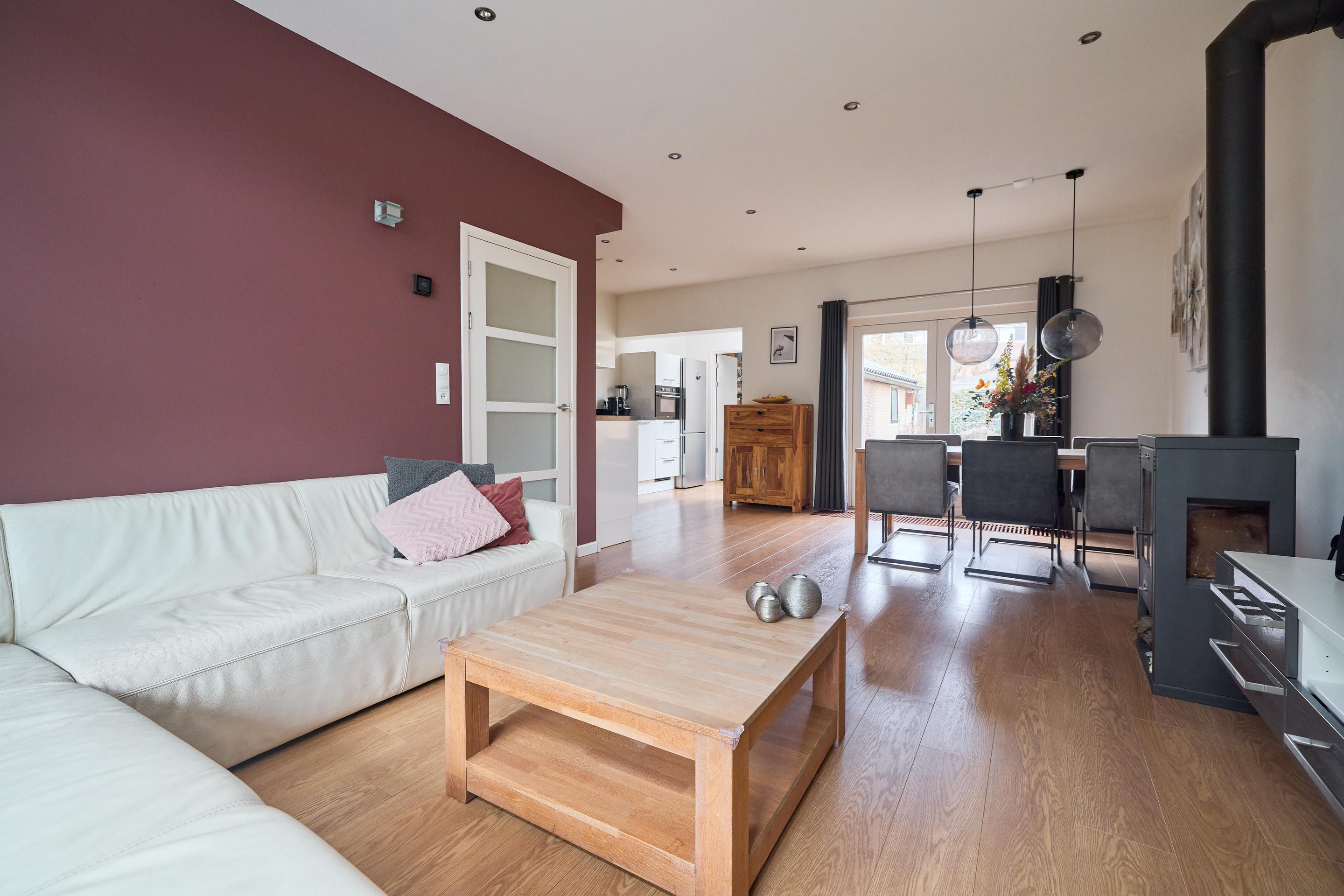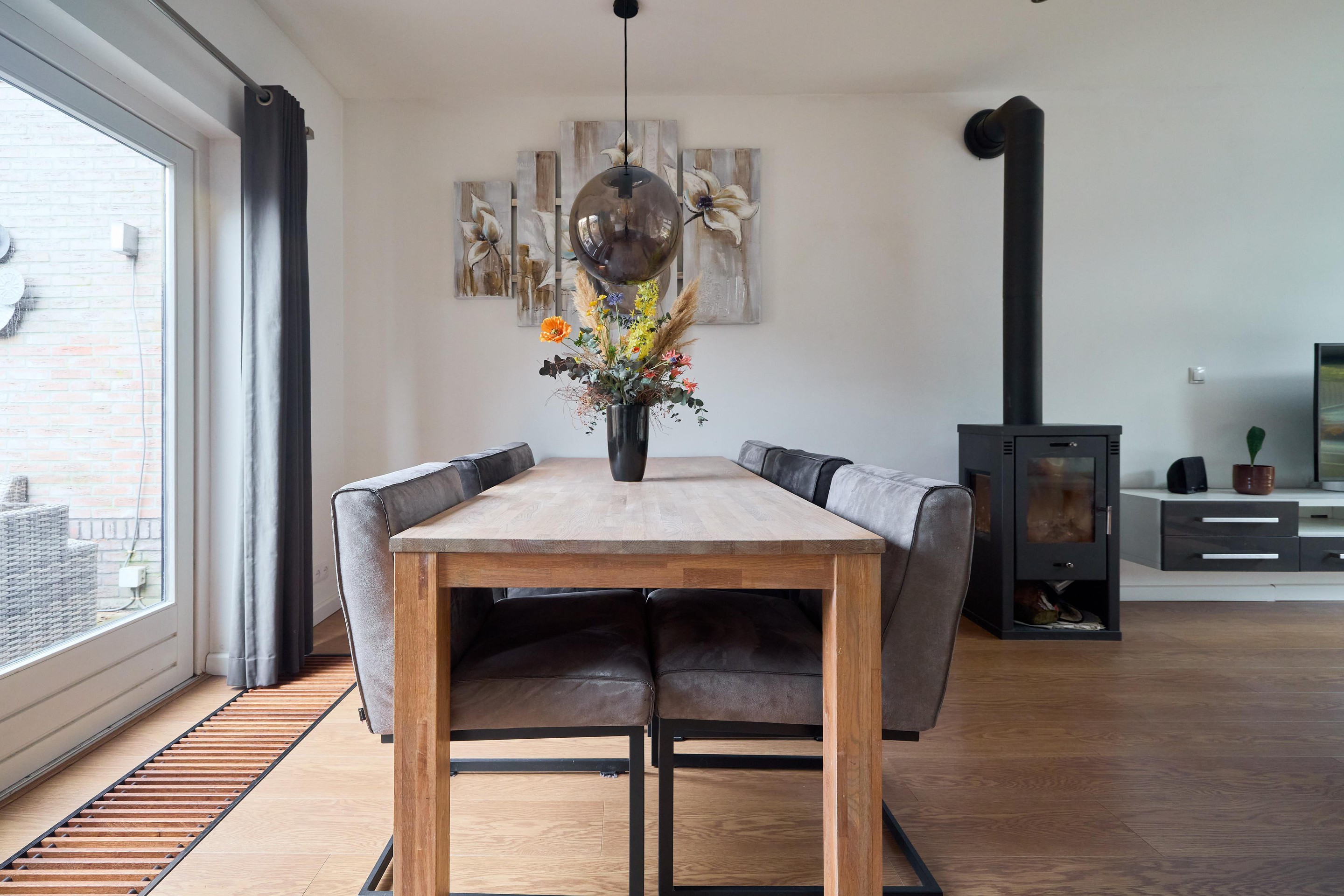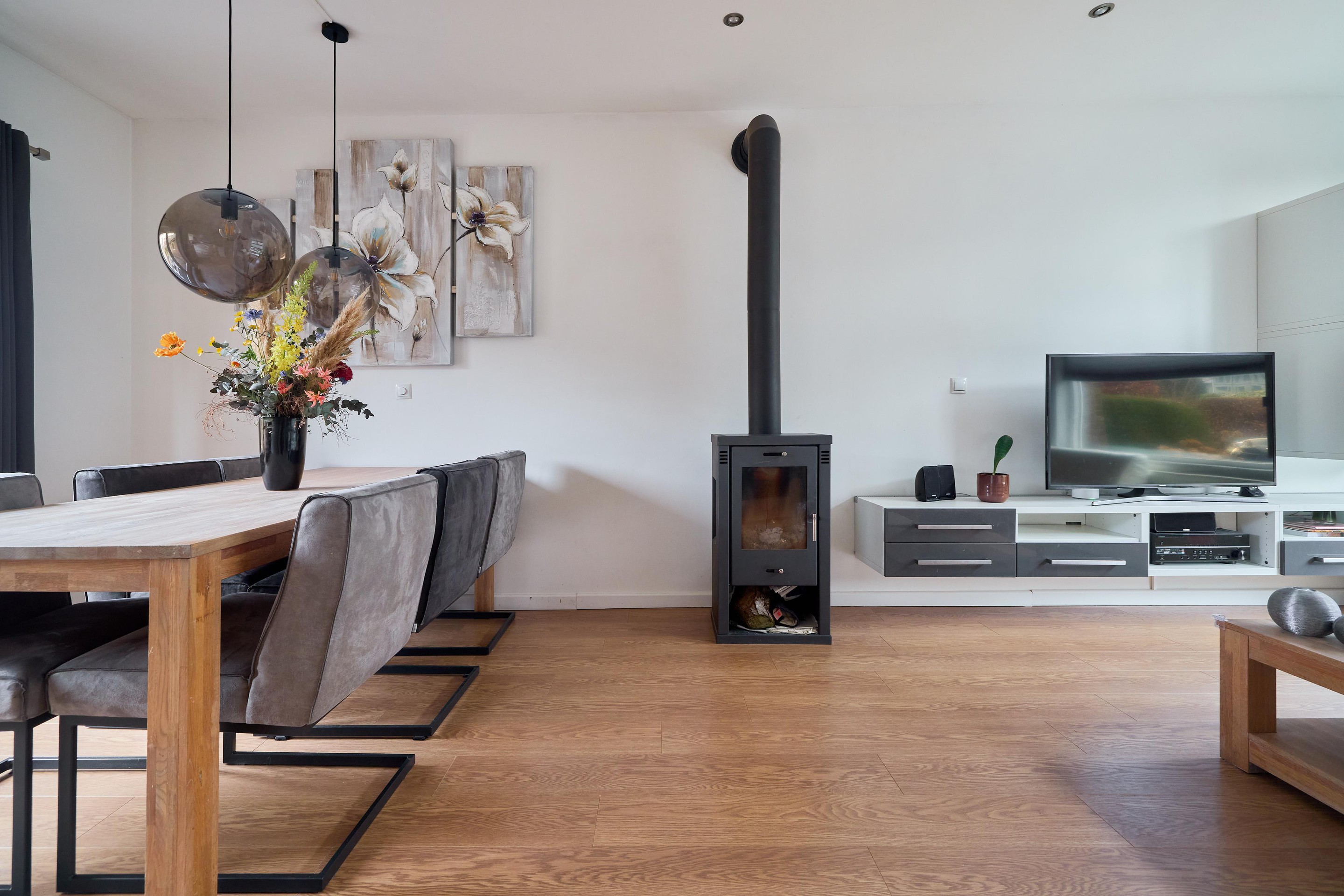 Begane grond Via de voortuin kom je binnen in de hal. Hier vind je de meterkast, het moderne toilet met fonteintje, de trapopgang naar de eerste verdieping én een praktische trapkast. Ideaal voor voorraad, schoenen of huishoudelijke spullen. Vanuit de hal stap je de royale woonkamer binnen. De grote raampartij aan de voorzijde zorgt voor prettig daglicht en een open gevoel. De houtkachel vormt een sfeervolle blikvanger en maakt de zithoek extra warm en gezellig in de wintermaanden. Er is volop ruimte voor een comfortabele zithoek én een royale eettafel. Een echte leefruimte waar alles samenkomt.
