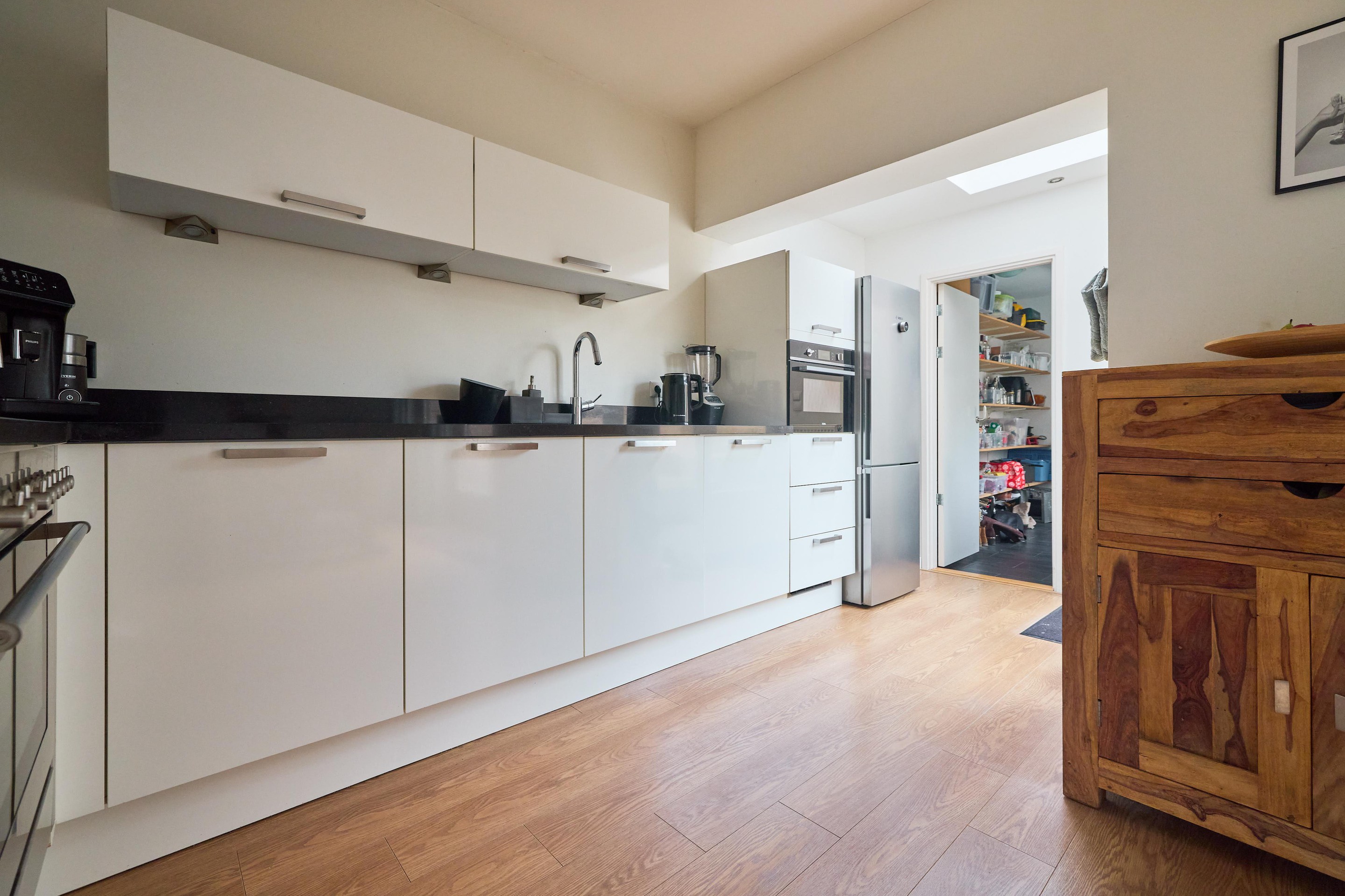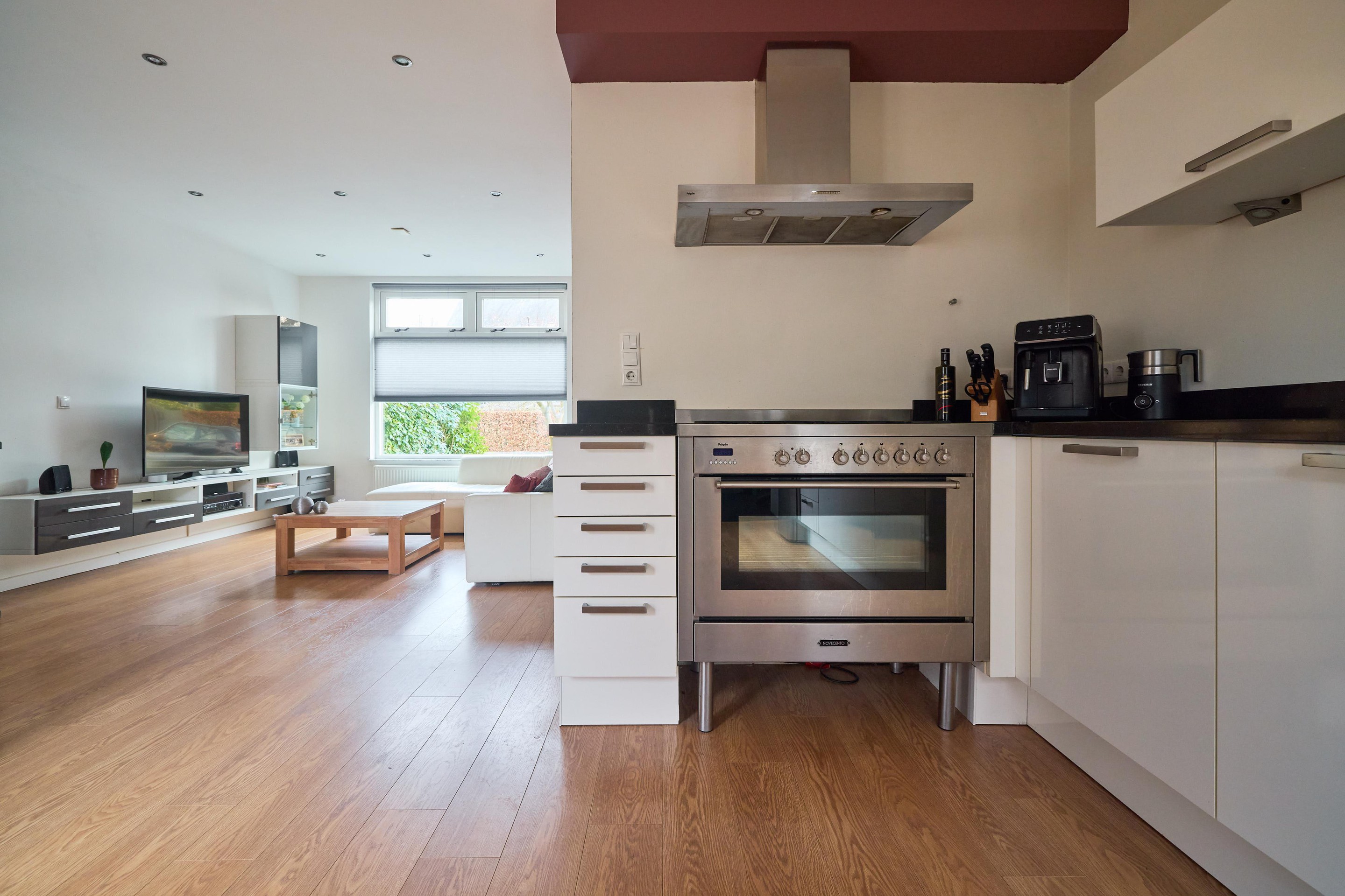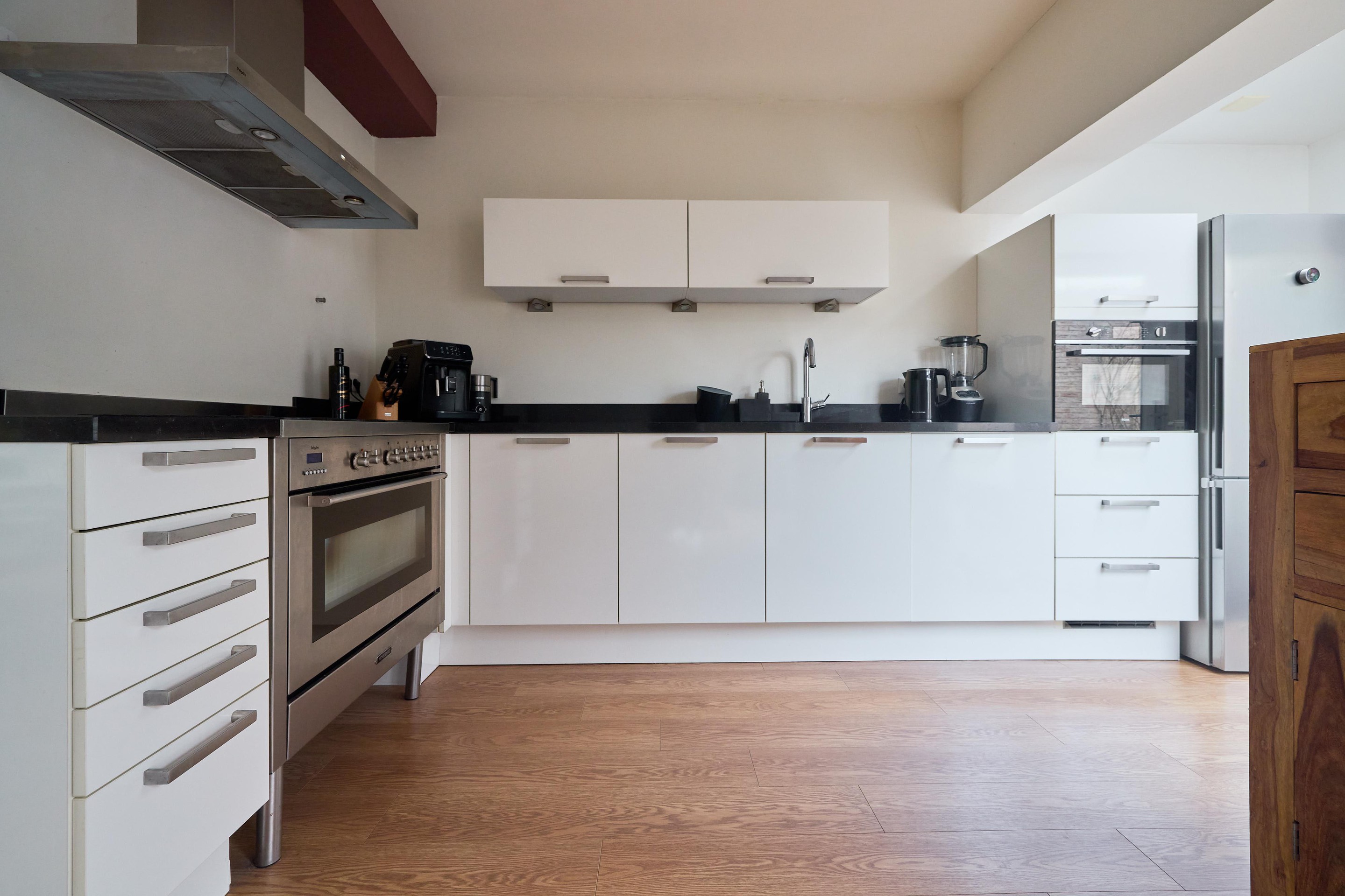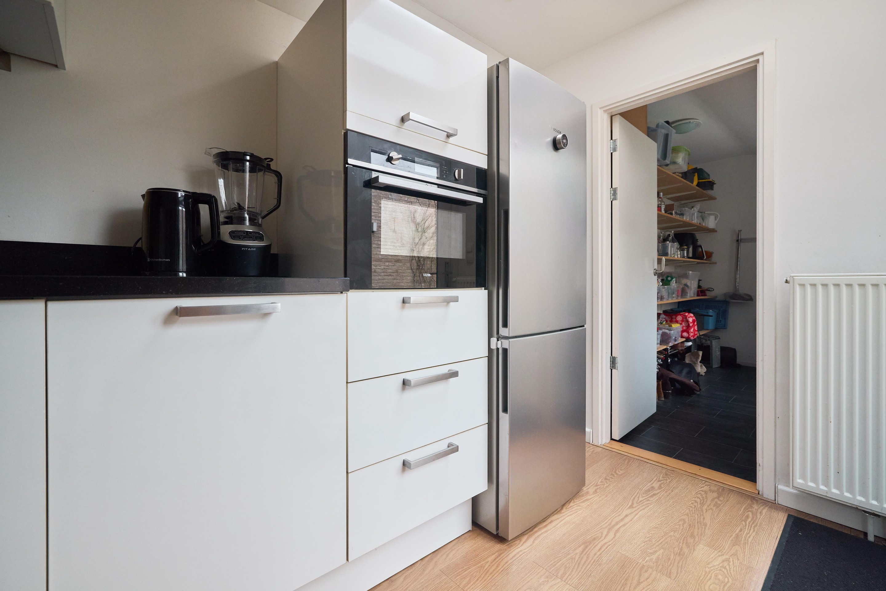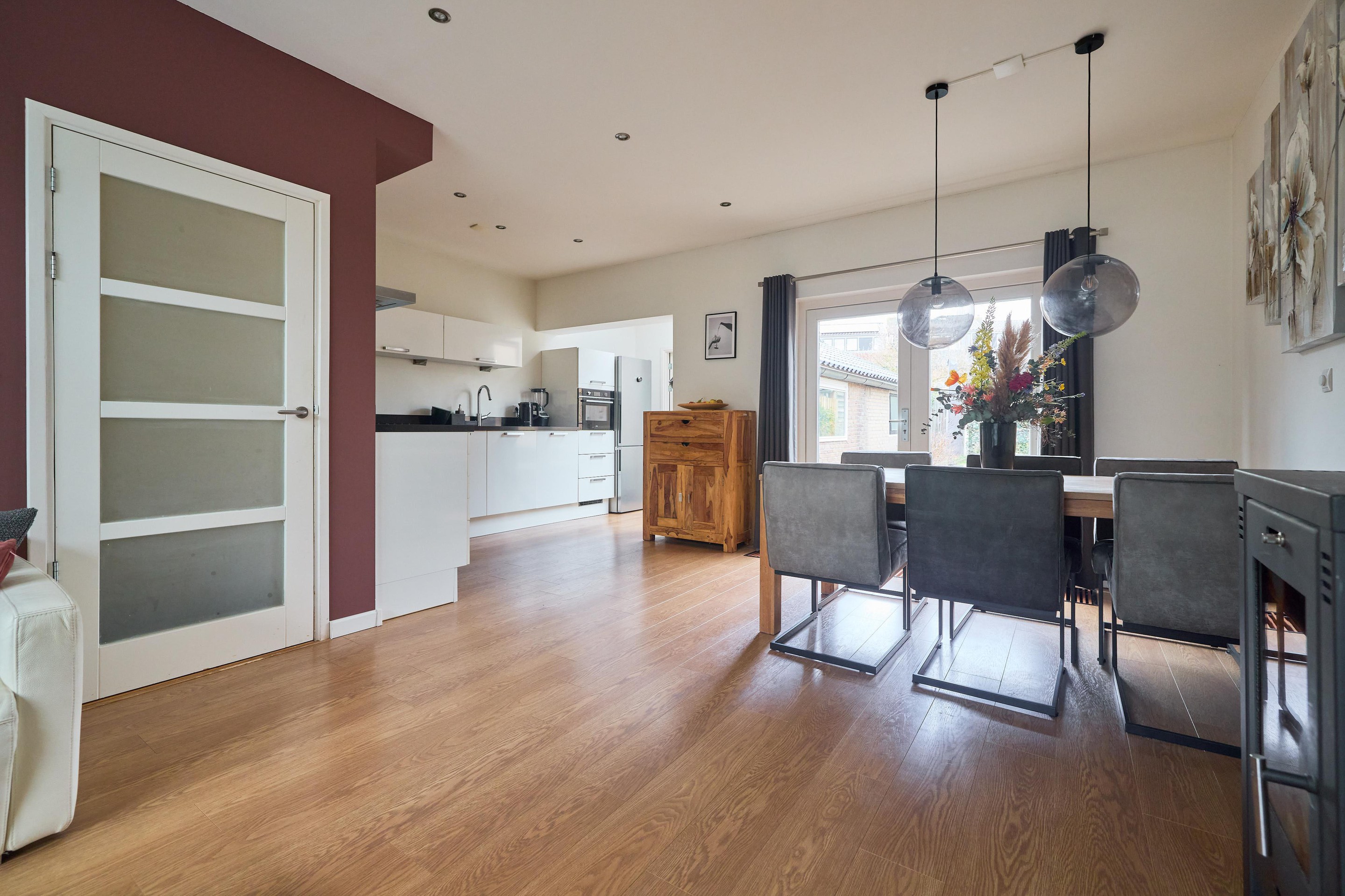 Aan de achterzijde zorgen de openslaande deuren voor een prachtige verbinding met de tuin. Op zonnige dagen zet je ze open en loopt binnen moeiteloos over in buiten. De open keuken is uitgevoerd in een praktische L-opstelling en biedt veel werkblad en kastruimte. Dankzij de lichtkoepel valt hier extra daglicht naar binnen, wat de ruimte nog lichter en ruimtelijker maakt. De keuken is voorzien van een fornuis met oven, combimagnetron, afzuigkap, vaatwasser en een losse koelkast en vriezer. Vanuit de keuken heb je eveneens toegang tot de achtertuin. Aansluitend aan de keuken ligt de multifunctionele ruimte. Momenteel ingericht als wasruimte, maar ook perfect te gebruiken als speelkamer, thuiswerkplek of hobbyruimte. Hier bevindt zich tevens de opstelling van de cv-ketel (Intergas Kombi Kompakt HR 36/30 uit 2012) en de aansluitingen voor wasmachine en droger. De aangebouwde berging is bereikbaar via de achtertuin.