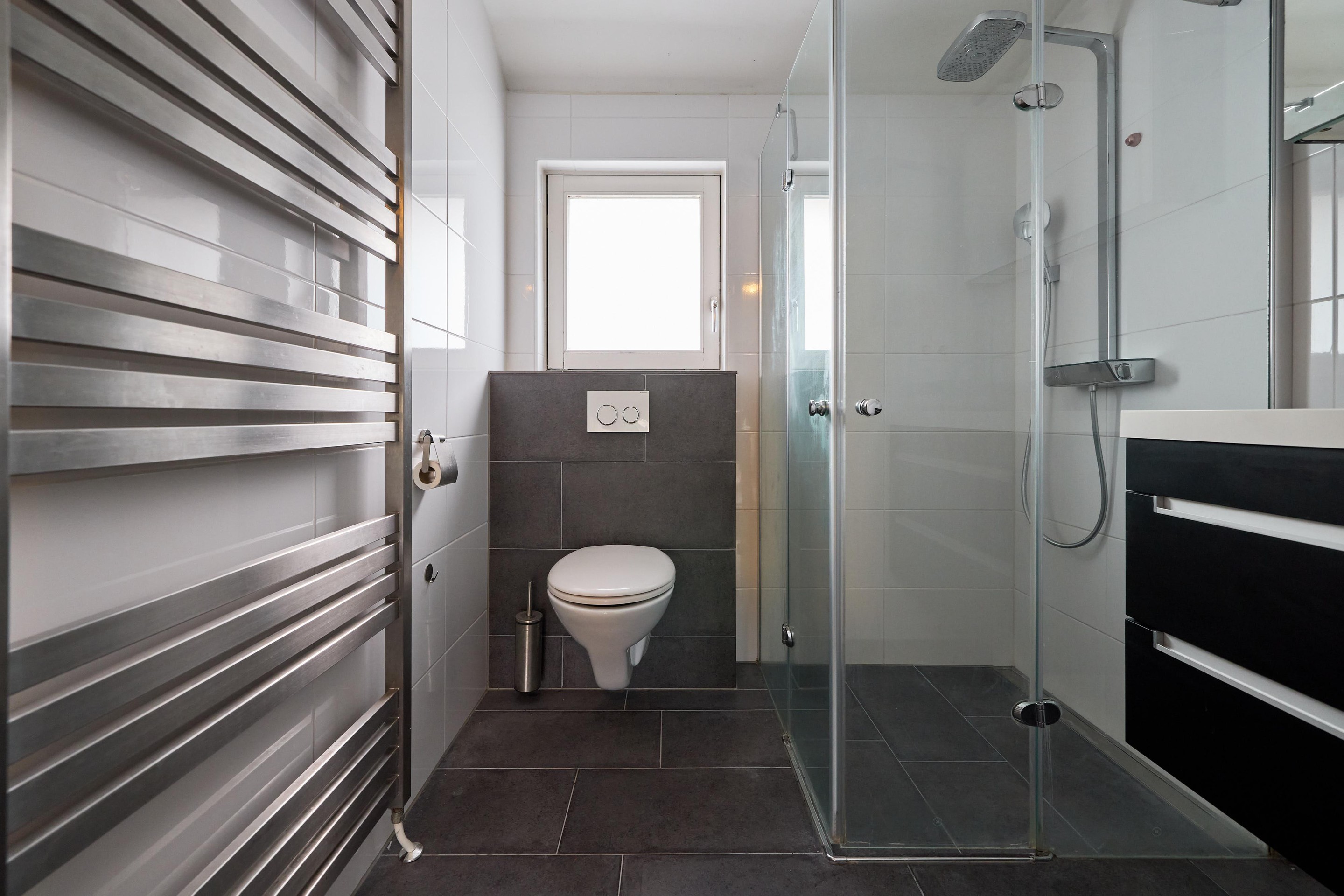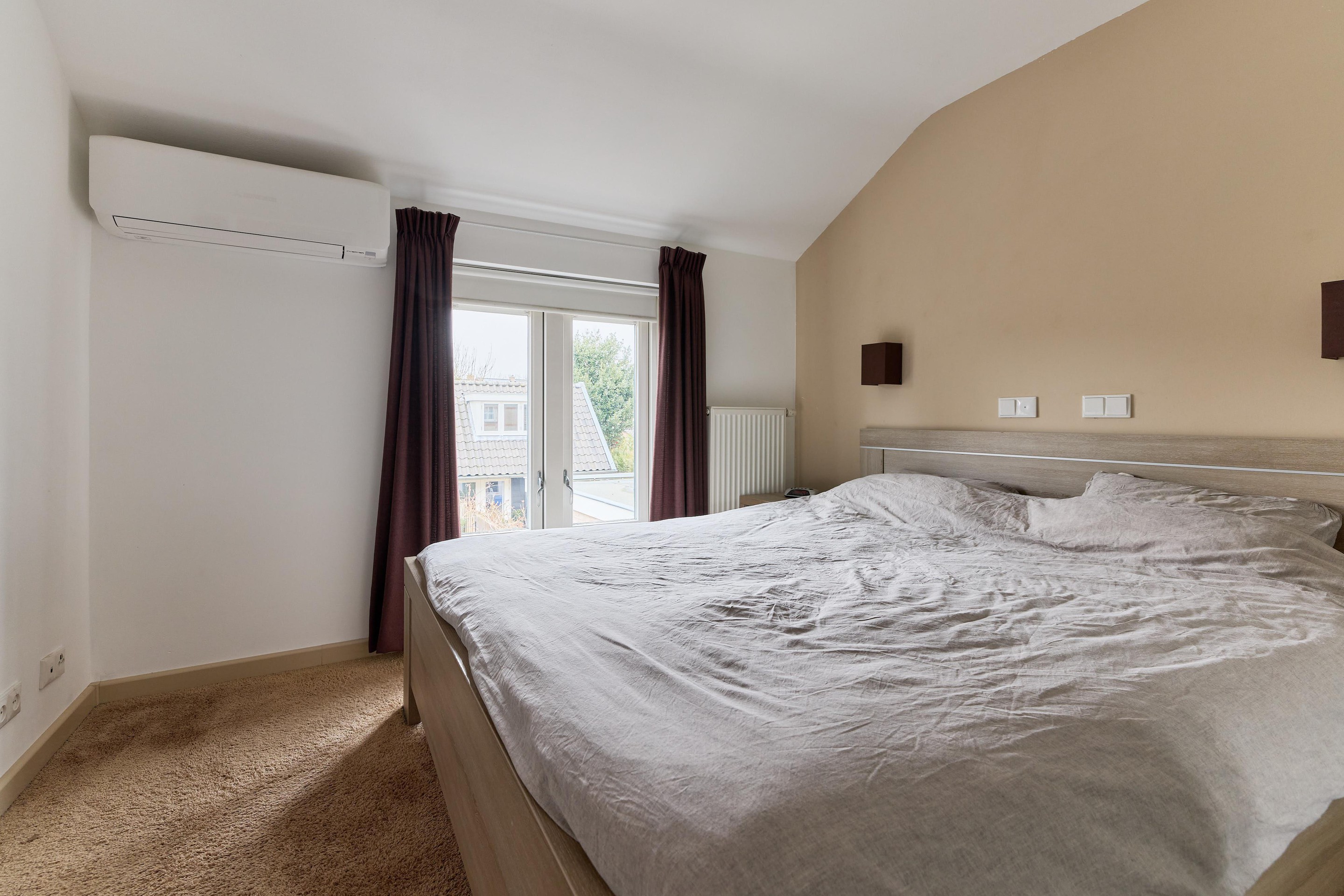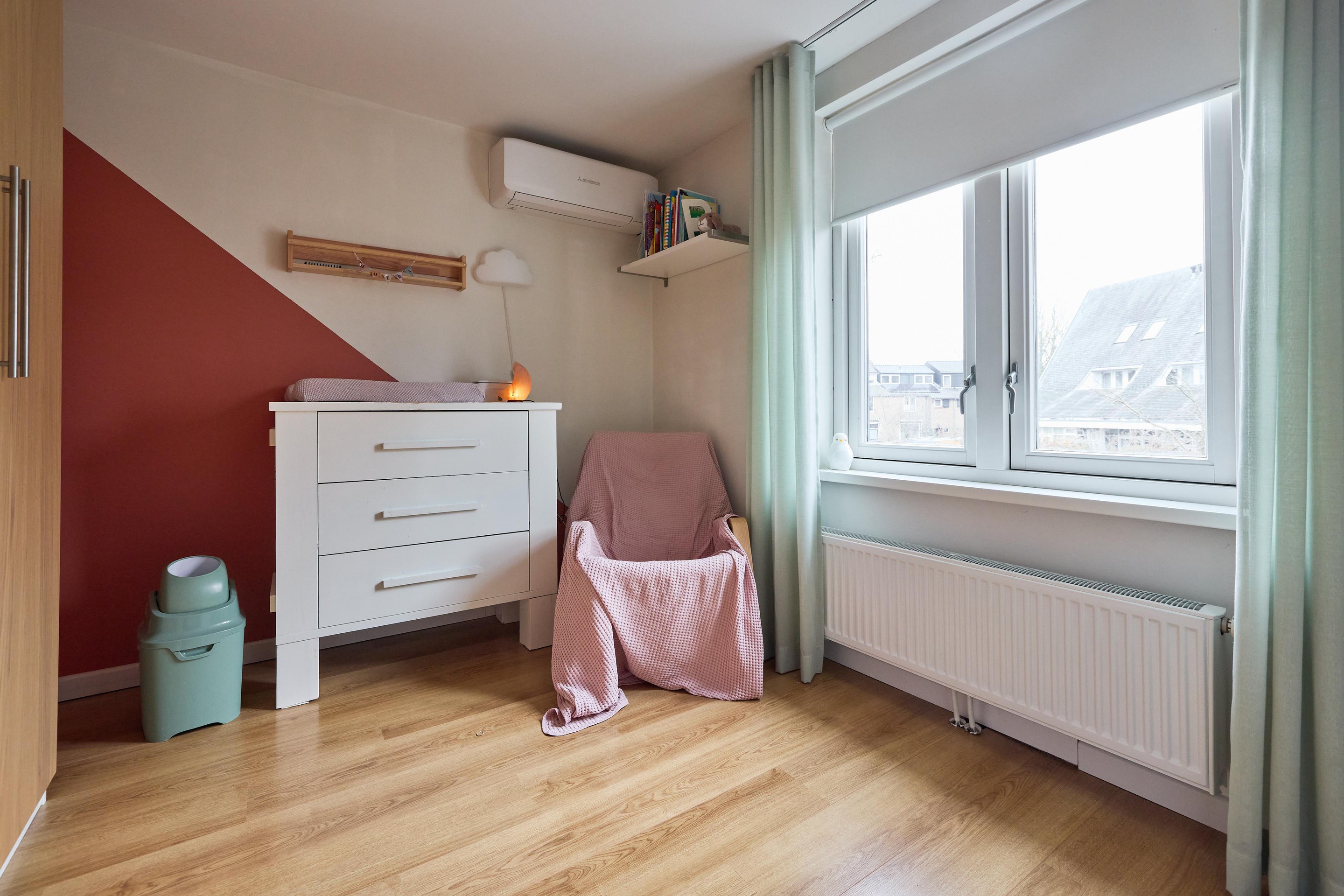 Eerste verdieping Via de vaste trap bereik je de overloop op de eerste verdieping. Vanaf hier heb je toegang tot drie slaapkamers en de badkamer. Aan de achterzijde bevinden zich twee slaapkamers. Beide kamers zijn prettig licht dankzij de grote raampartijen en hebben een fijne maatvoering. Perfect als kinderkamer, werkkamer of logeerkamer. De derde slaapkamer ligt aan de voorzijde en is de ruimste van de drie. Hier is volop plek voor een tweepersoonsbed en een garderobekast. In de hoofdslaapkamer[MV1.1] ligt tapijt, wat zorgt voor extra comfort. Ook op beide trappen en de overloop van de eerste verdieping ligt tapijt. Meerdere slaapkamers zijn voorzien van airconditioning, wat zorgt voor een aangenaam binnenklimaat, het hele jaar door. De badkamer is modern uitgevoerd in een stijlvolle combinatie van lichte wandtegels en een donkere vloertegel. Je beschikt hier over een inloopdouche met glazen wand, een hangend toilet, een wastafelmeubel en een designradiator. Het raam zorgt voor natuurlijke ventilatie en daglicht.