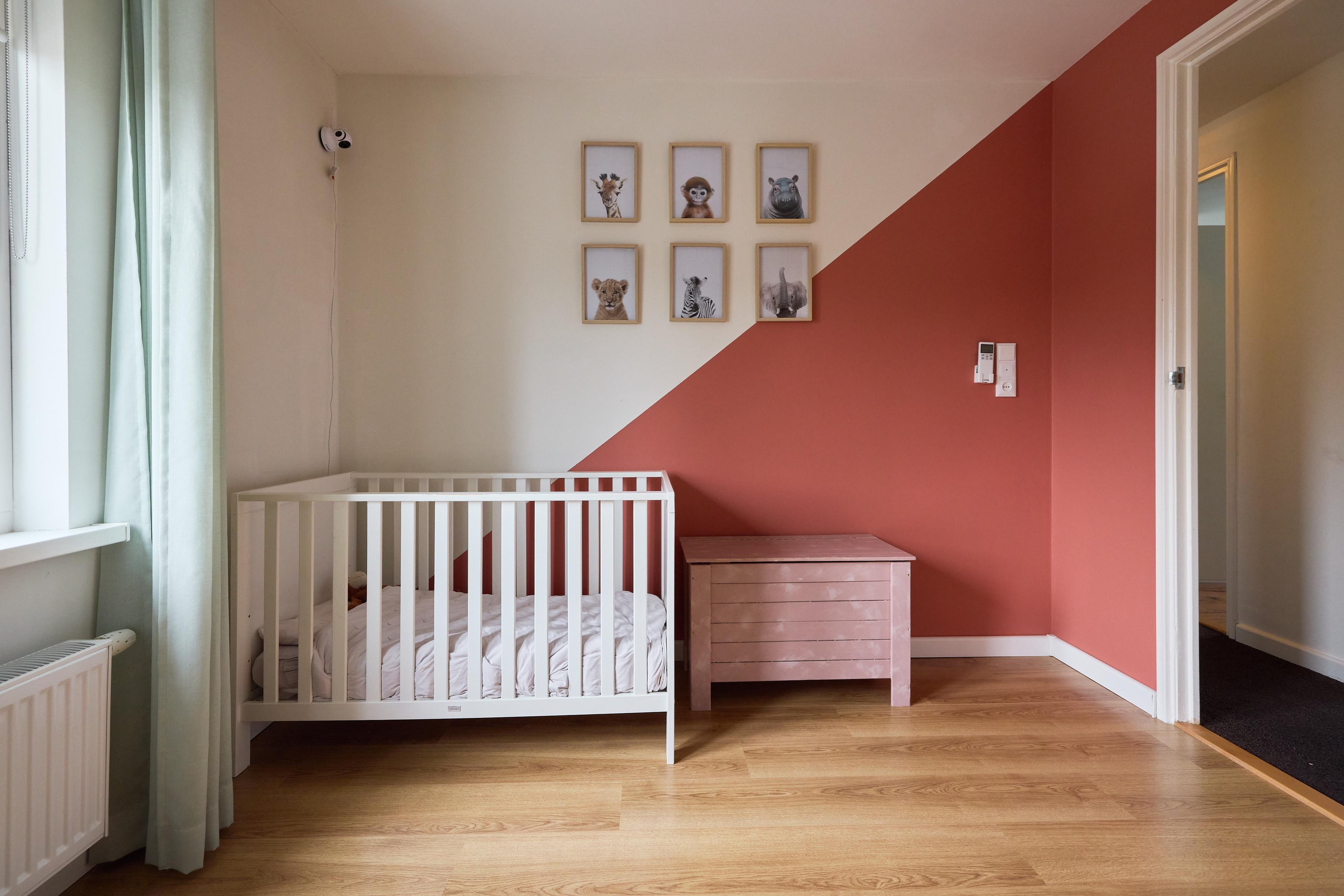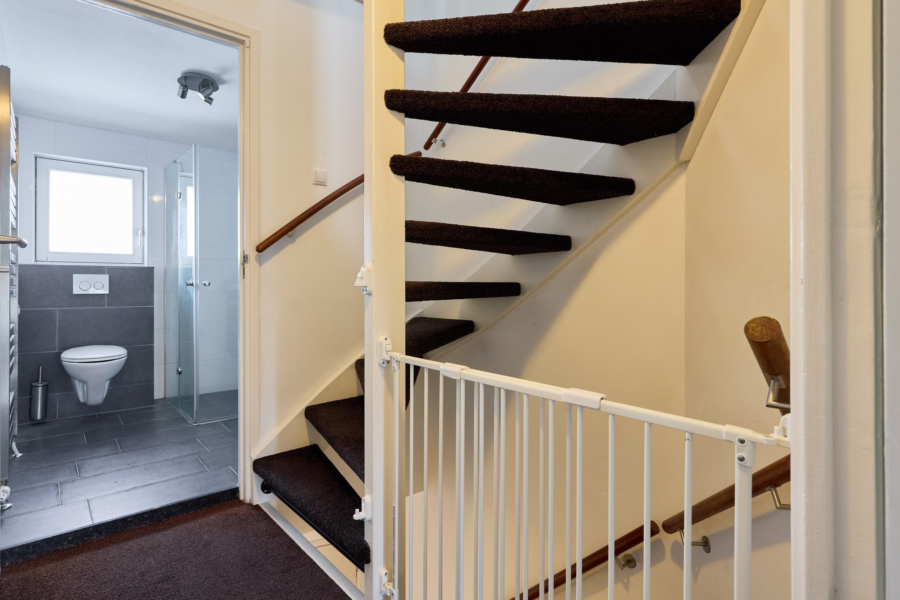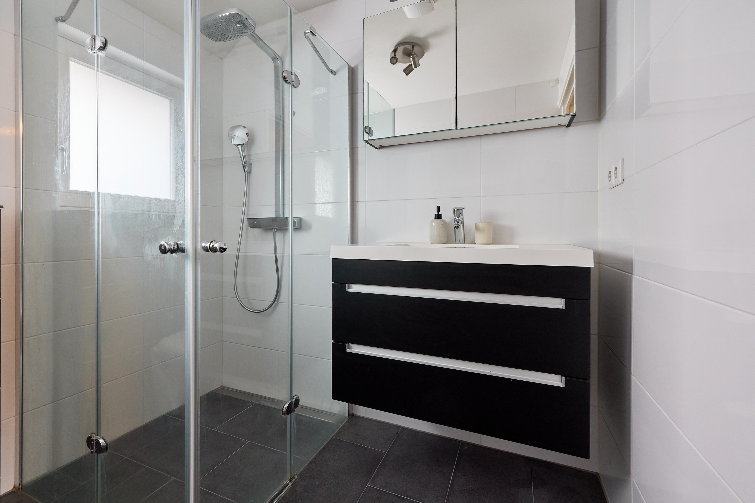 Eerste verdieping Via de vaste trap bereik je de overloop op de eerste verdieping. Vanaf hier heb je toegang tot drie slaapkamers en de badkamer. Aan de achterzijde bevinden zich twee slaapkamers. Beide kamers zijn prettig licht dankzij de grote raampartijen en hebben een fijne maatvoering. Perfect als kinderkamer, werkkamer of logeerkamer. De derde slaapkamer ligt aan de voorzijde en is de ruimste van de drie. Hier is volop plek voor een tweepersoonsbed en een garderobekast. In de hoofdslaapkamer[MV1.1] ligt tapijt, wat zorgt voor extra comfort. Ook op beide trappen en de overloop van de eerste verdieping ligt tapijt. Meerdere slaapkamers zijn voorzien van airconditioning, wat zorgt voor een aangenaam binnenklimaat, het hele jaar door. De badkamer is modern uitgevoerd in een stijlvolle combinatie van lichte wandtegels en een donkere vloertegel. Je beschikt hier over een inloopdouche met glazen wand, een hangend toilet, een wastafelmeubel en een designradiator. Het raam zorgt voor natuurlijke ventilatie en daglicht.