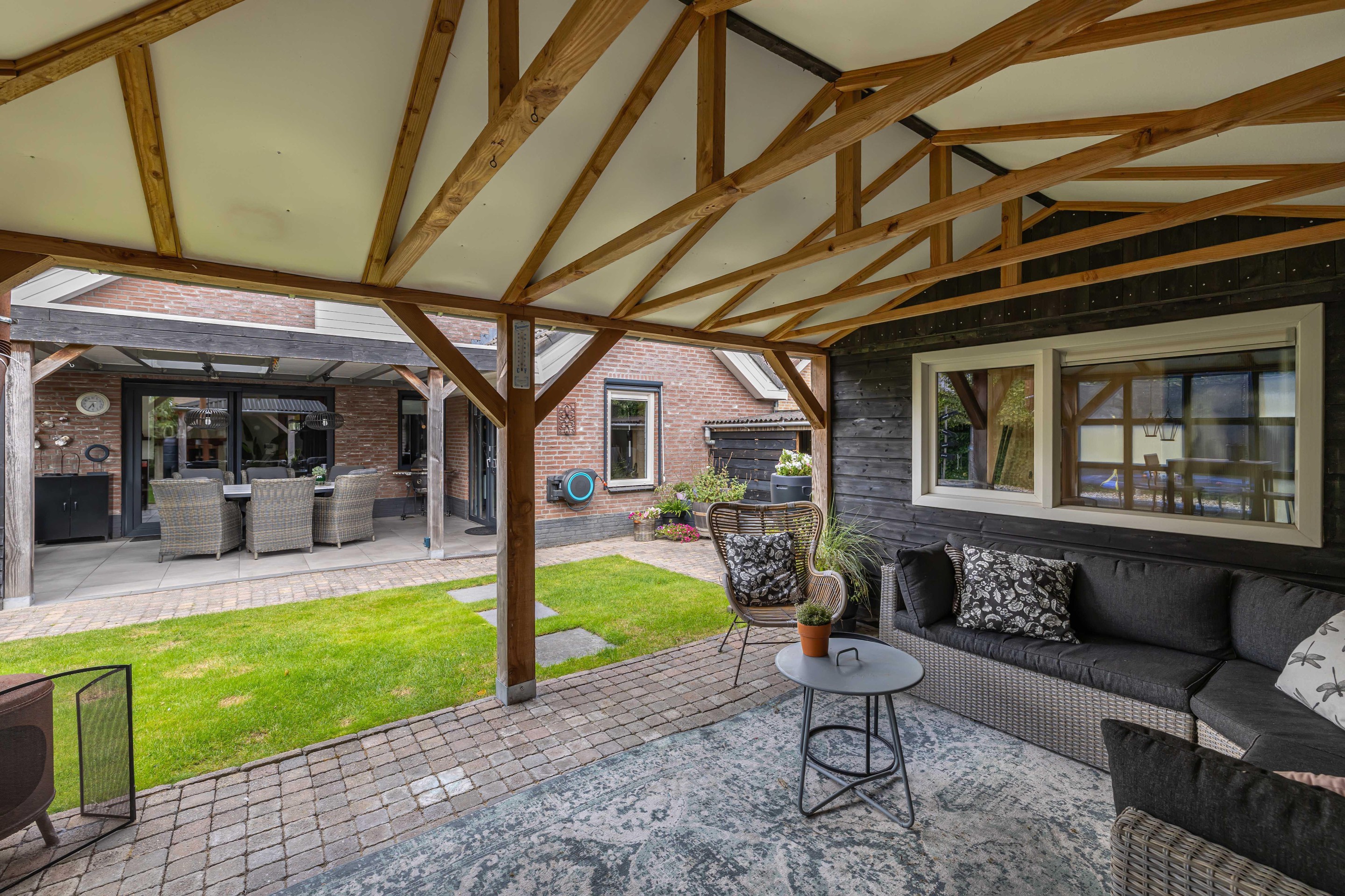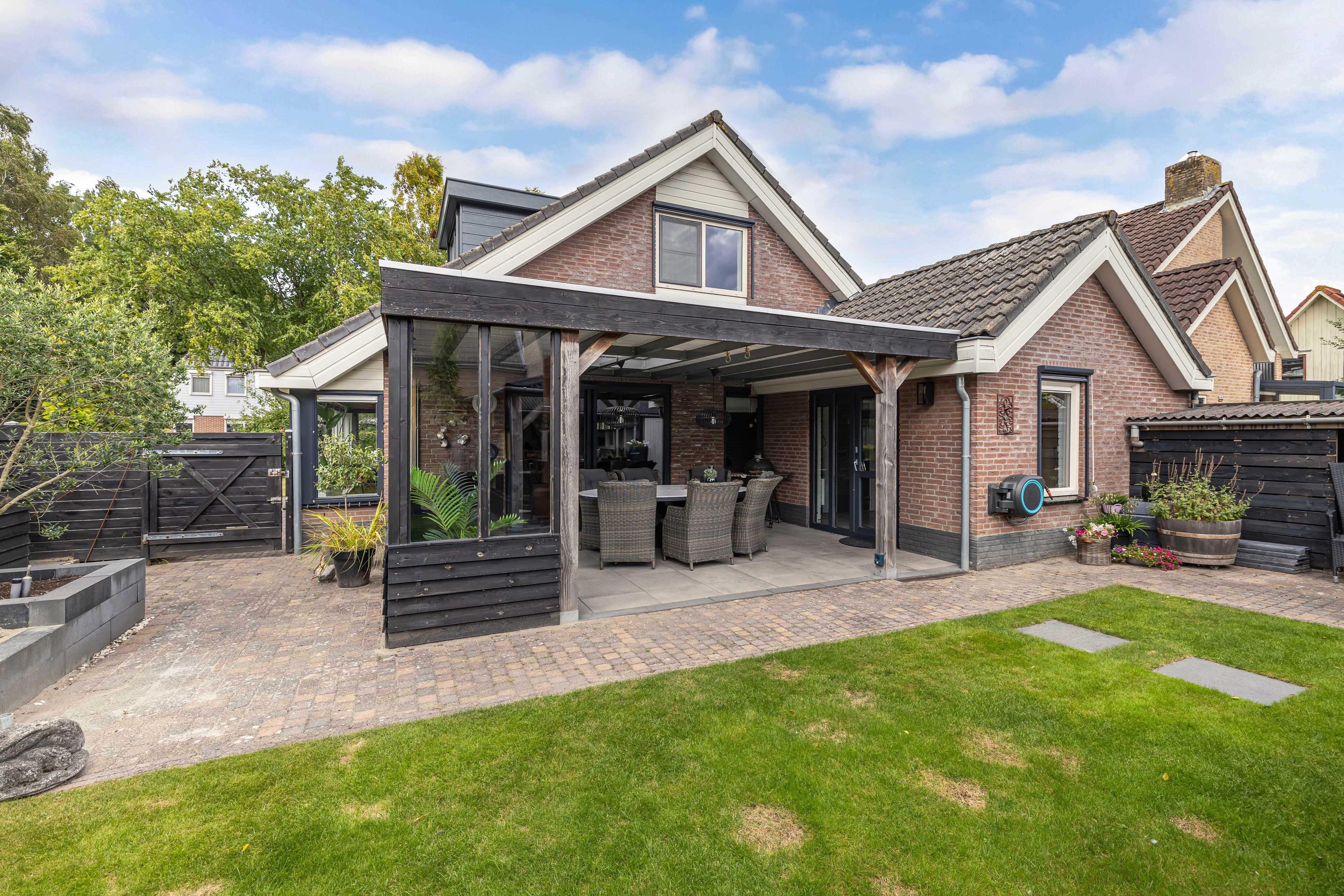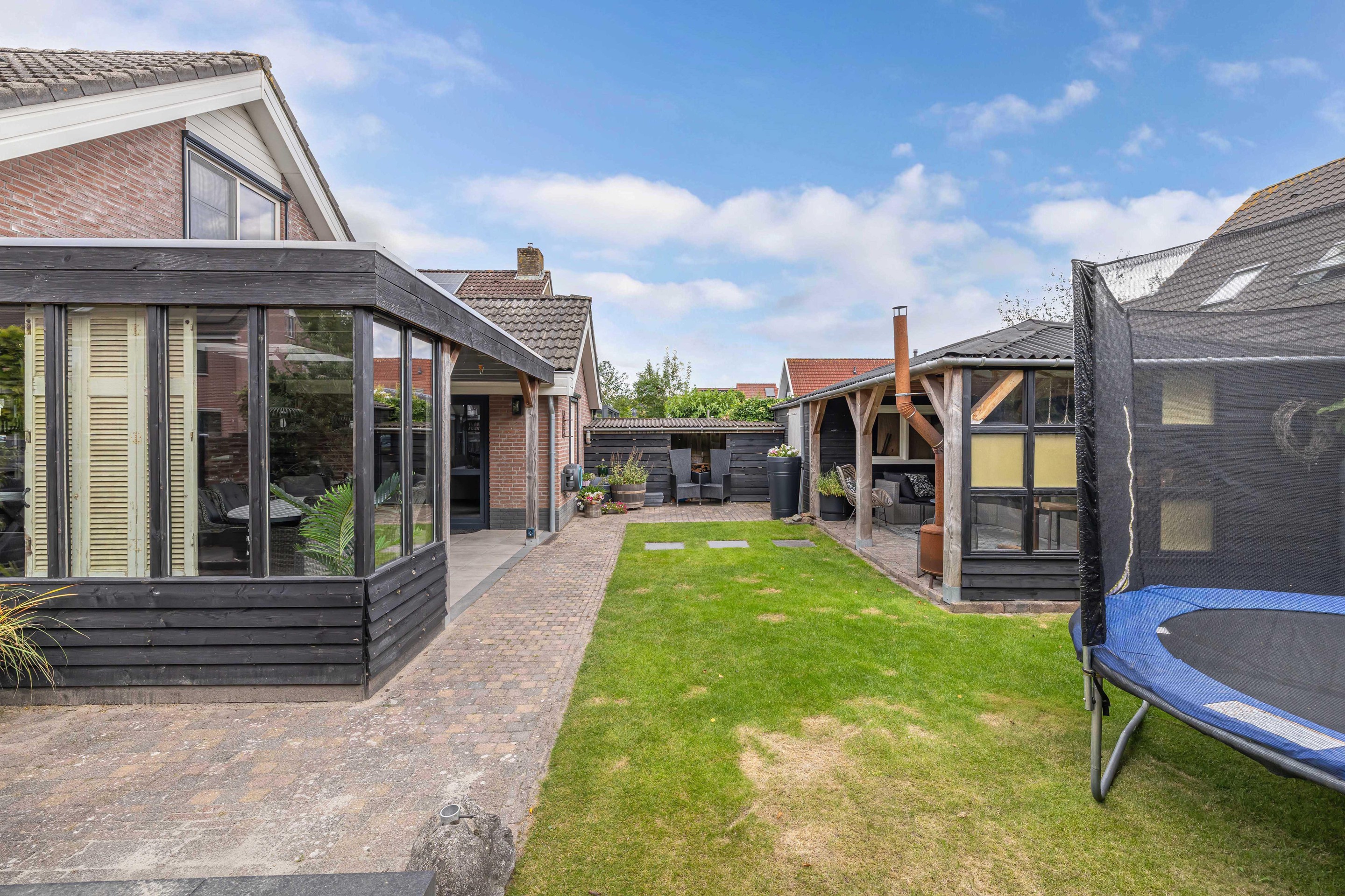 De achtertuin op het zuiden is fraai aangelegd en uitstekend onderhouden. Hier zit je al vroeg in het voorjaar beschut in de zon en geniet je in alle privacy van het buitenleven dankzij de aangebouwde overkapping/tuinkamer. Achter in de tuin bevindt zich een houten berging met aangebouwde overkapping, ideaal voor hobby’s of een extra zitplek. Het grasveld en de borderbakken geven de tuin een verzorgde en groene uitstraling.