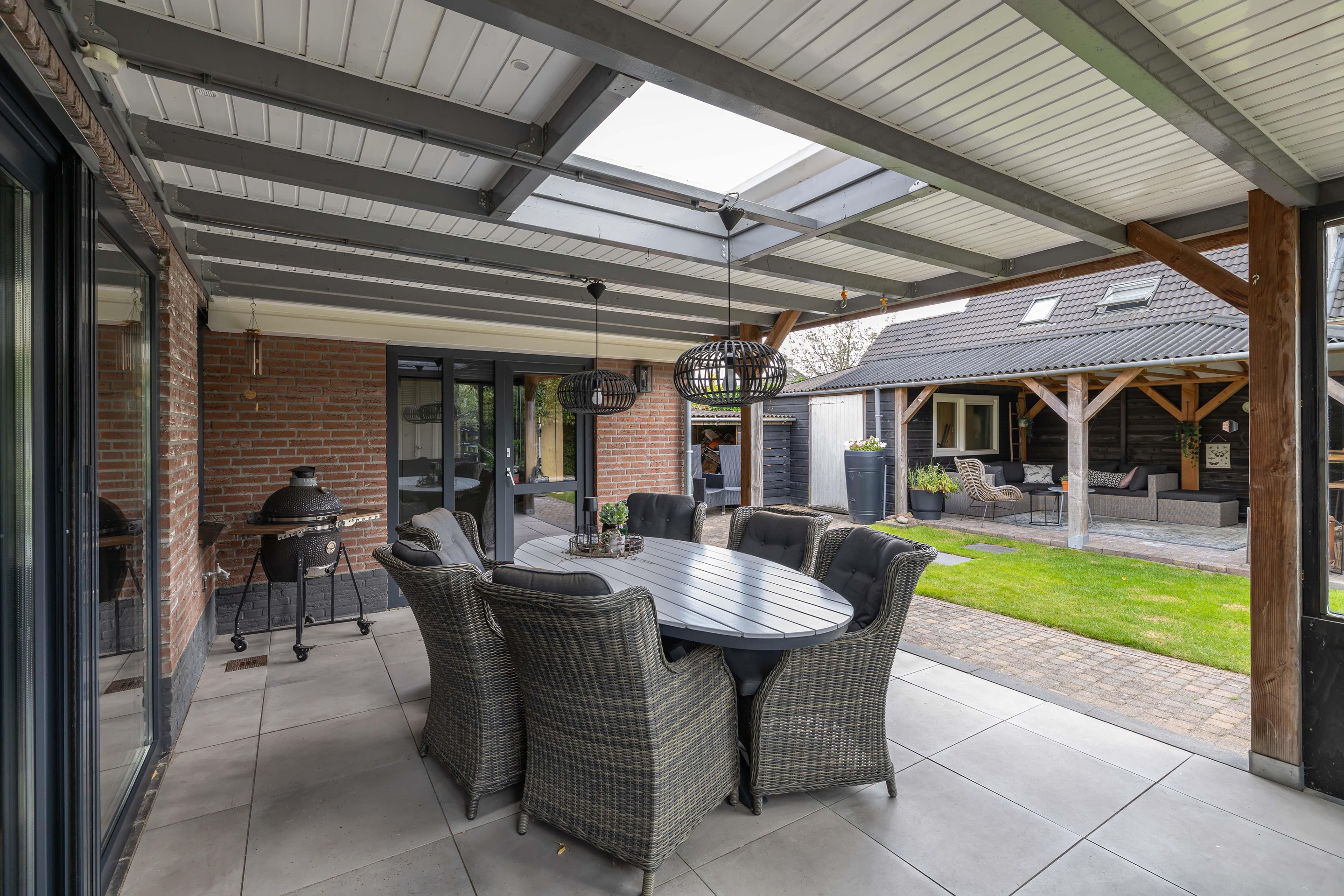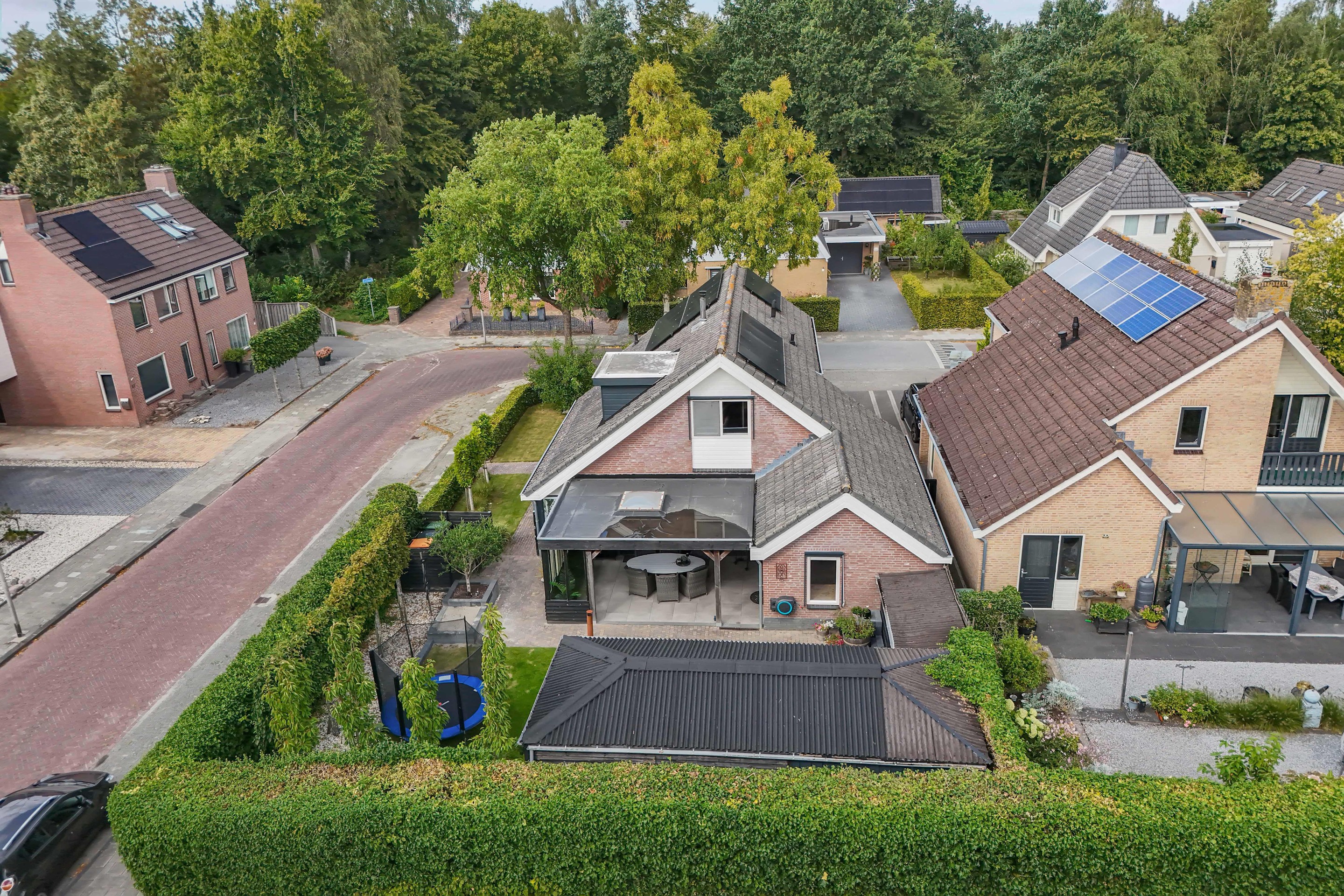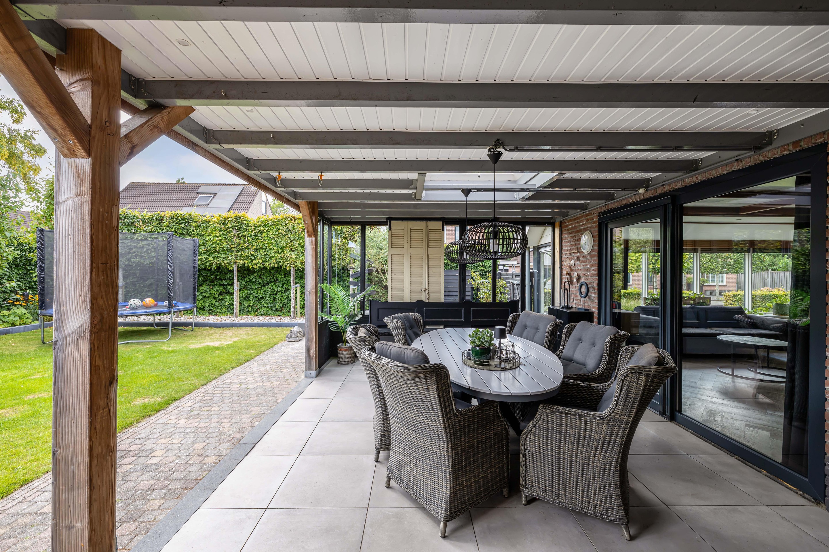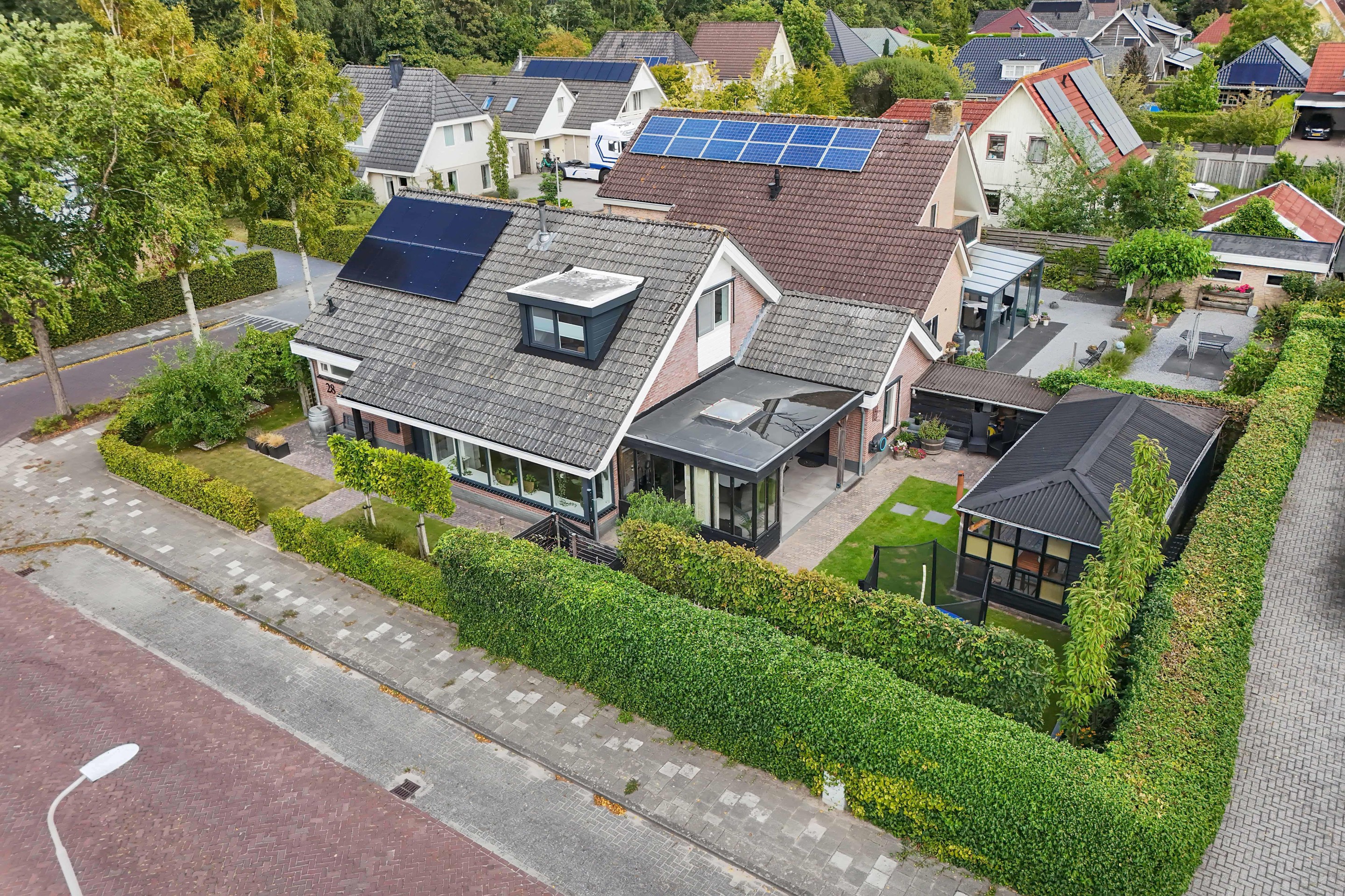 De achtertuin op het zuiden is fraai aangelegd en uitstekend onderhouden. Hier zit je al vroeg in het voorjaar beschut in de zon en geniet je in alle privacy van het buitenleven dankzij de aangebouwde overkapping/tuinkamer. Achter in de tuin bevindt zich een houten berging met aangebouwde overkapping, ideaal voor hobby’s of een extra zitplek. Het grasveld en de borderbakken geven de tuin een verzorgde en groene uitstraling.