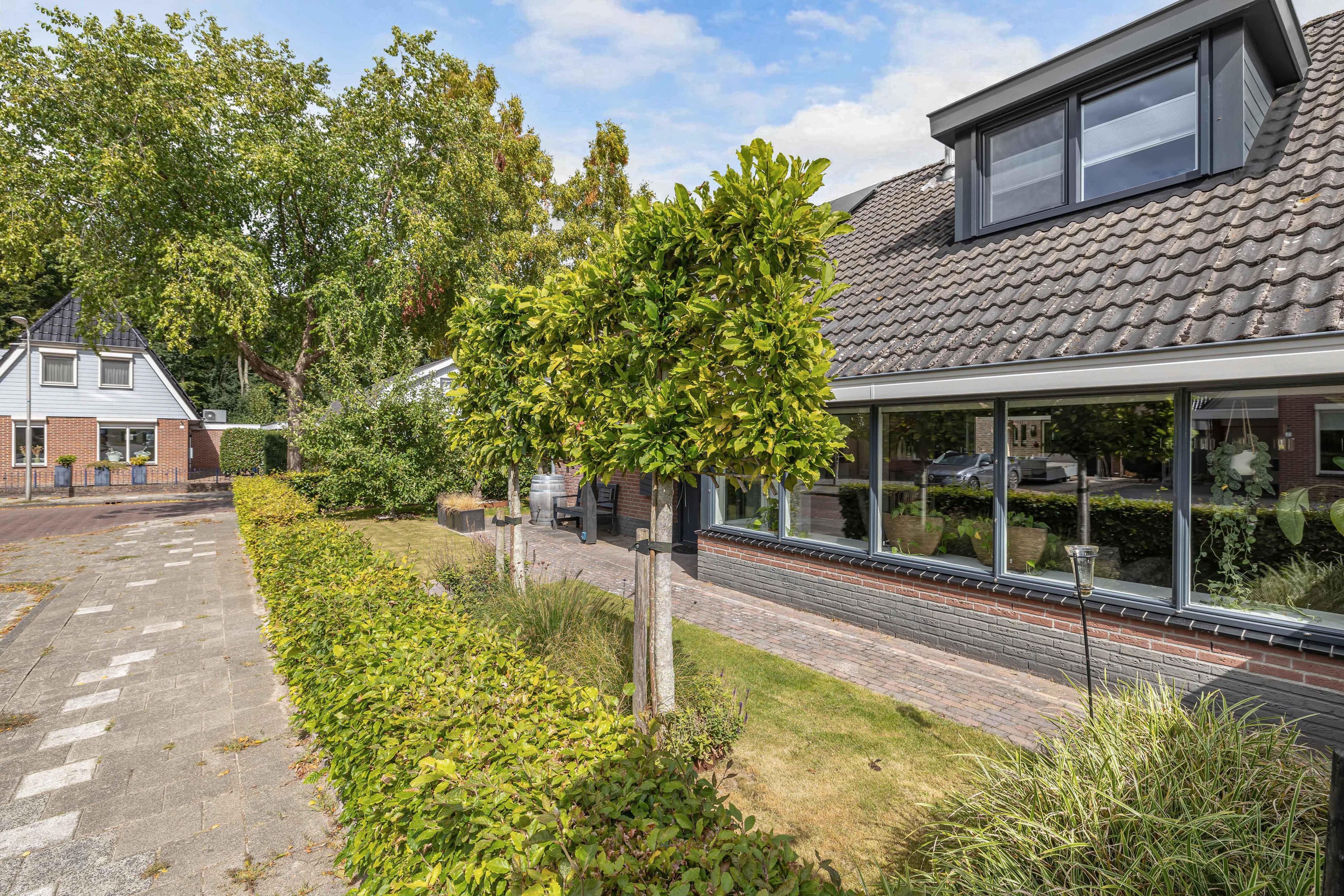 De voortuin op het westen is eveneens netjes aangelegd. Aan de noordzijde van de woning ligt de oprit met parkeergelegenheid voor circa twee auto’s op eigen terrein.