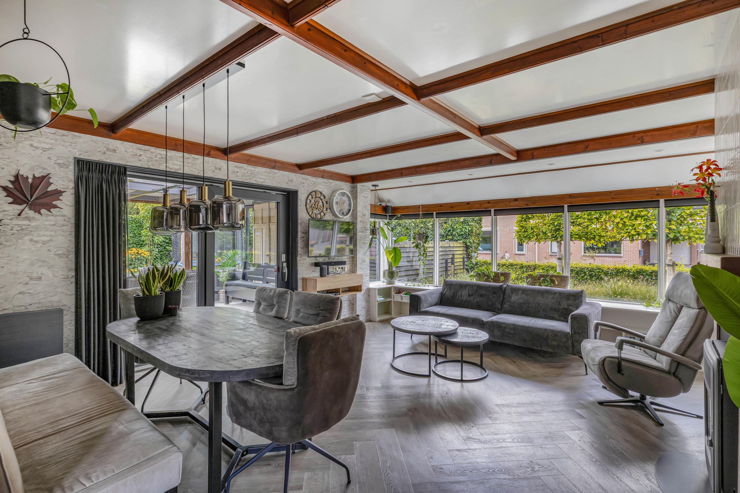 Via de entree kom je binnen in een nette hal met trapopgang, provisiekast en toilet. De woonkamer verwelkomt je met grote raampartijen die het daglicht rijkelijk binnen laten stromen en een ruimtelijk gevoel geven. De pelletkachel vormt een sfeervol middelpunt en via de schuifpui loop je zo de overkapping/tuinkamer in, waardoor binnen en buiten naadloos in elkaar overlopen.