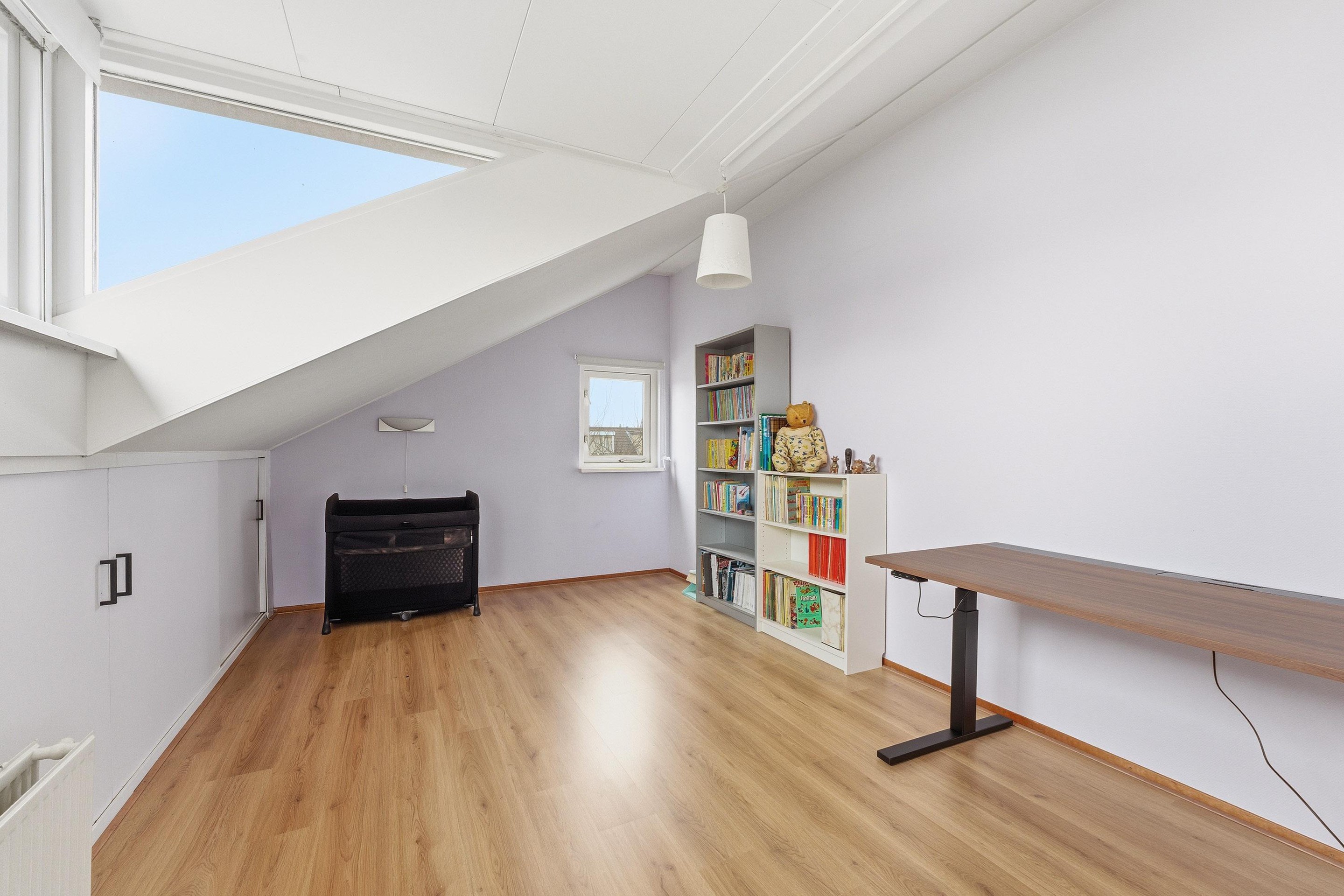 Hier bevindt zich nog een slaapkamer met extra bergruimte achter de knieschotten én een ruime overloop met plaats voor wasmachine/droger. Hier is ook de opstelplaats voor de CV-ketel. Dankzij de dakkapel is hier veel daglicht en ruimte.