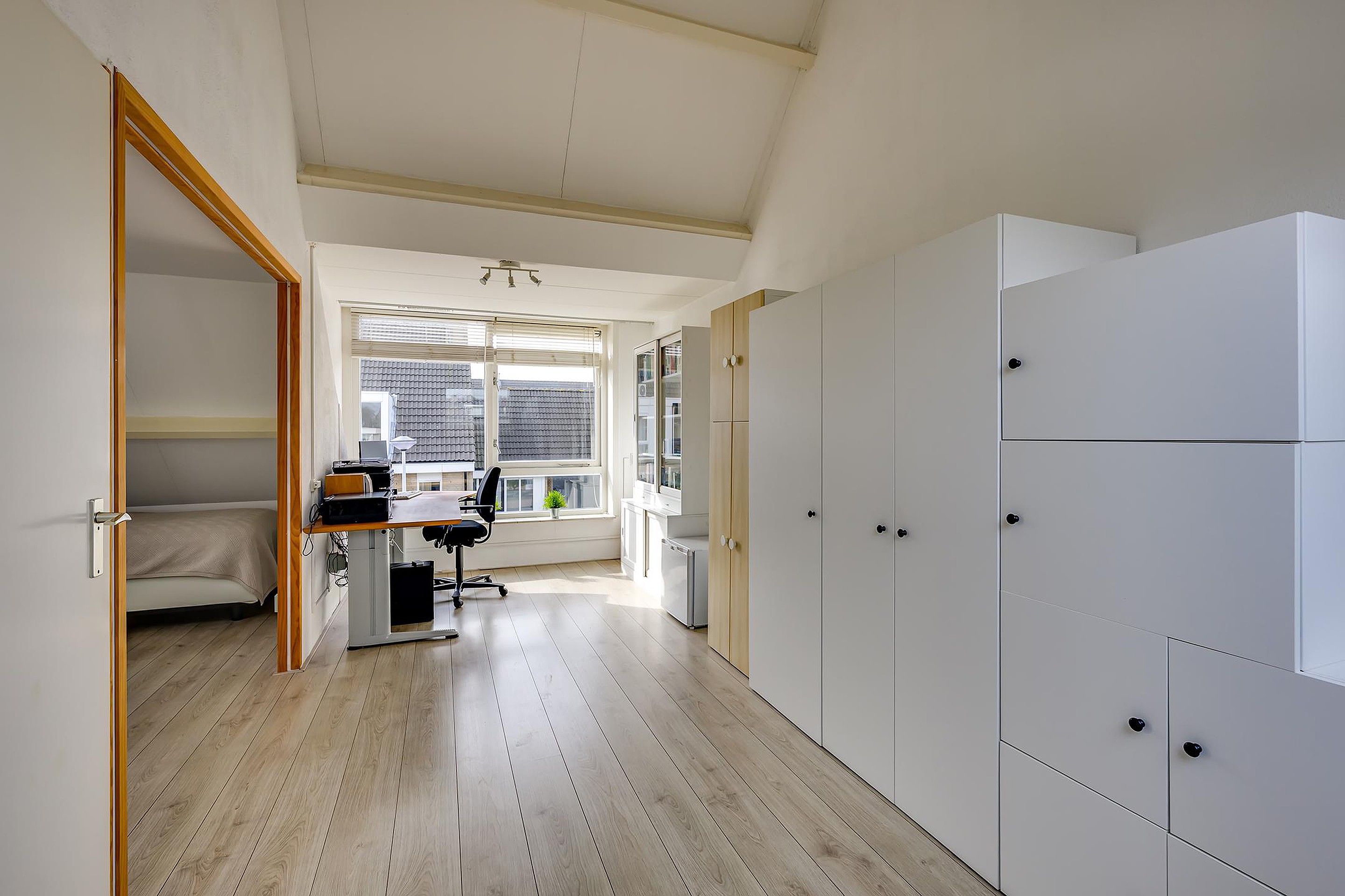 Op de eerste verdieping kom je op de overloop met hier de opstelplaats voor de CV-ketel en bergruimte. Er zijn oorspronkelijk twee slaapkamers, waar nu één hele grote slaapkamer van is gemaakt. Door de schuine kap en dakkapel heeft deze verdieping een speelse indeling en volop mogelijkheden.