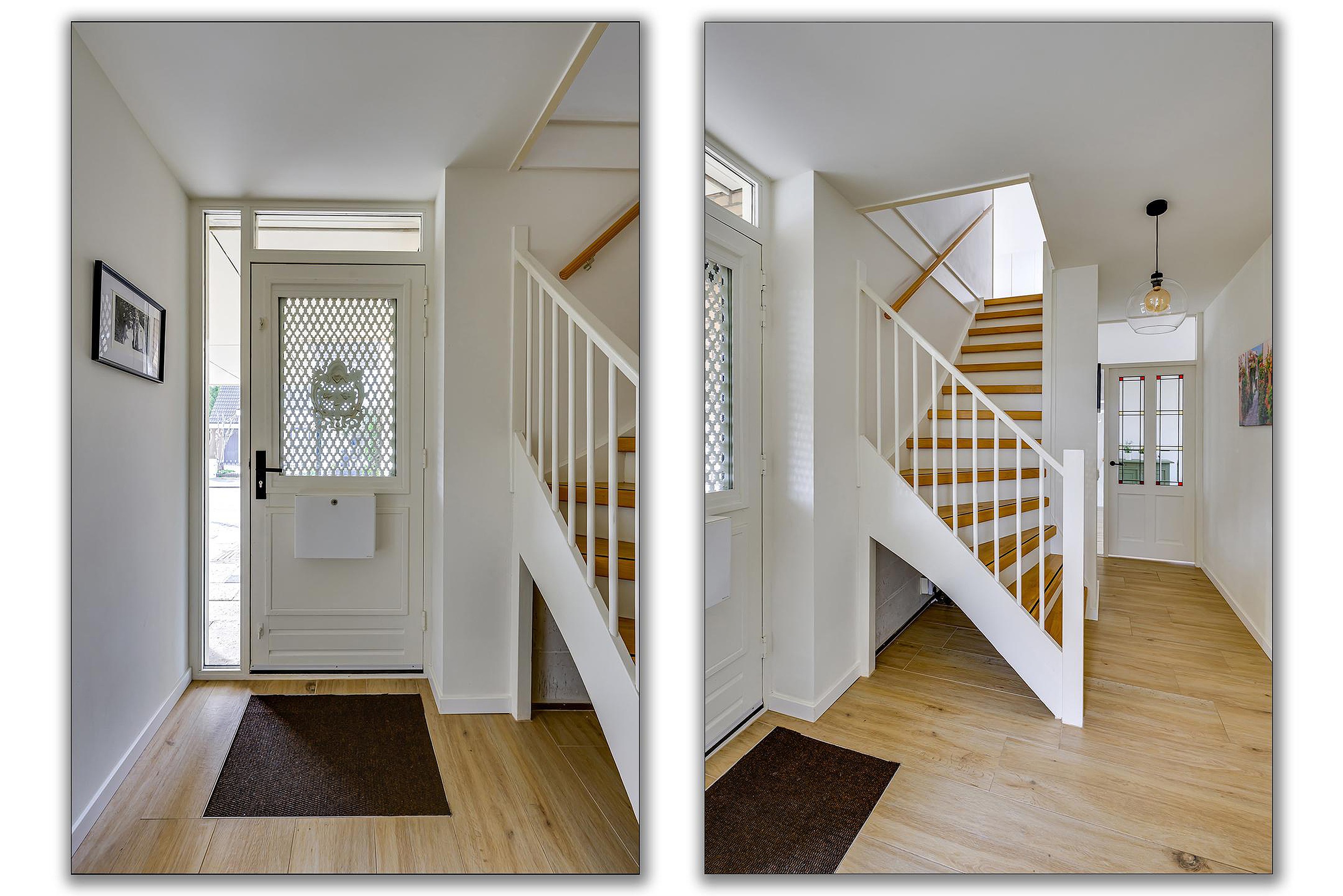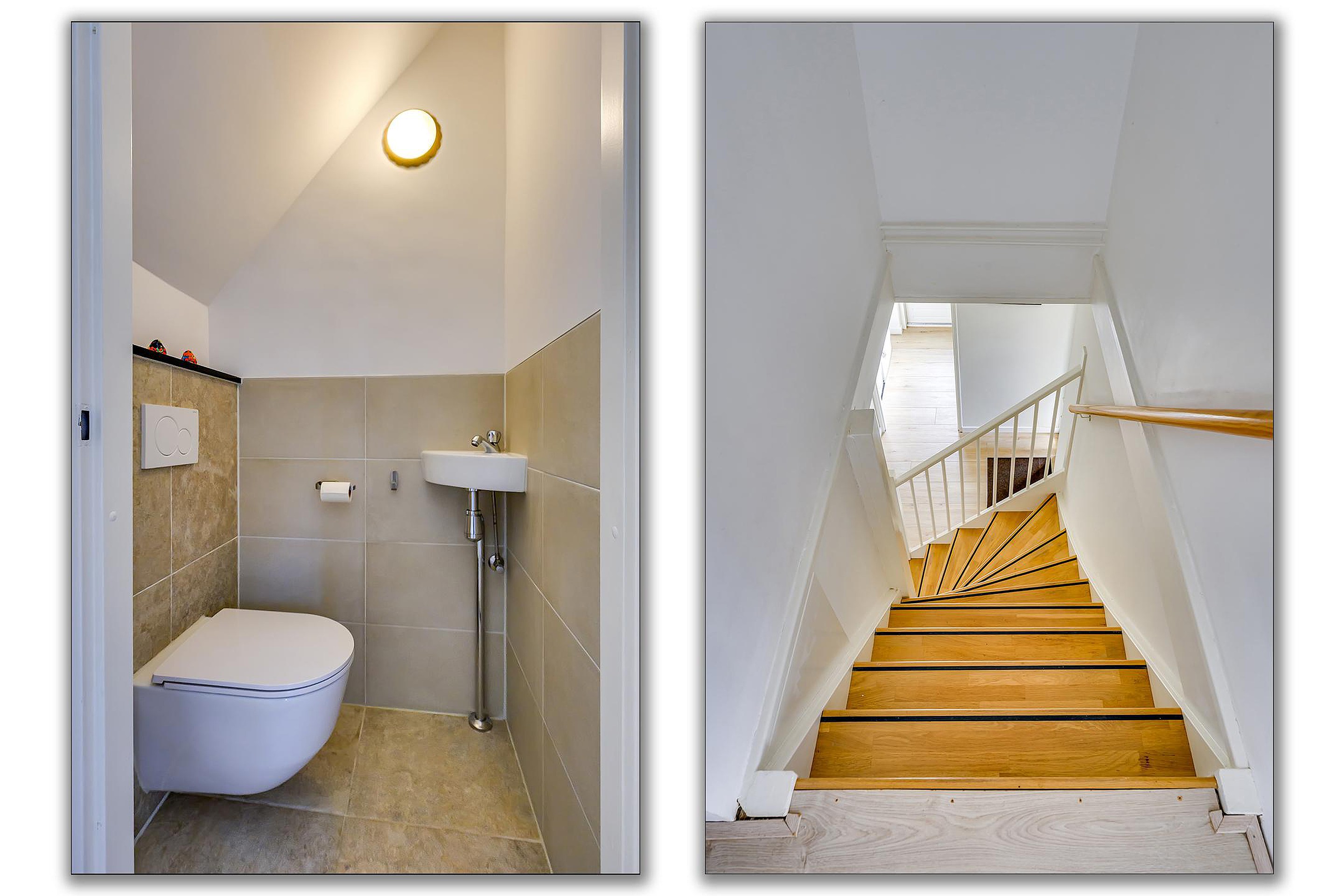 Je komt de woning binnen via de hal met meterkast, toilet, trapopgang, de bijkeuken en toegang tot de woonkamer. Het toilet is recent gerenoveerd en modern afgewerkt met een hangend closet en fonteintje. De bijkeuken biedt ruimte voor wasmachine en extra opslag en geeft toegang tot de voortuin.