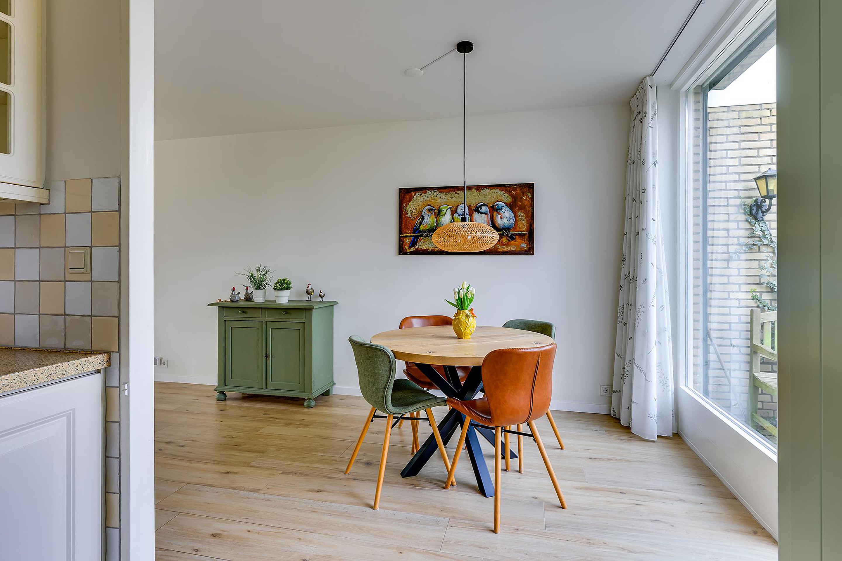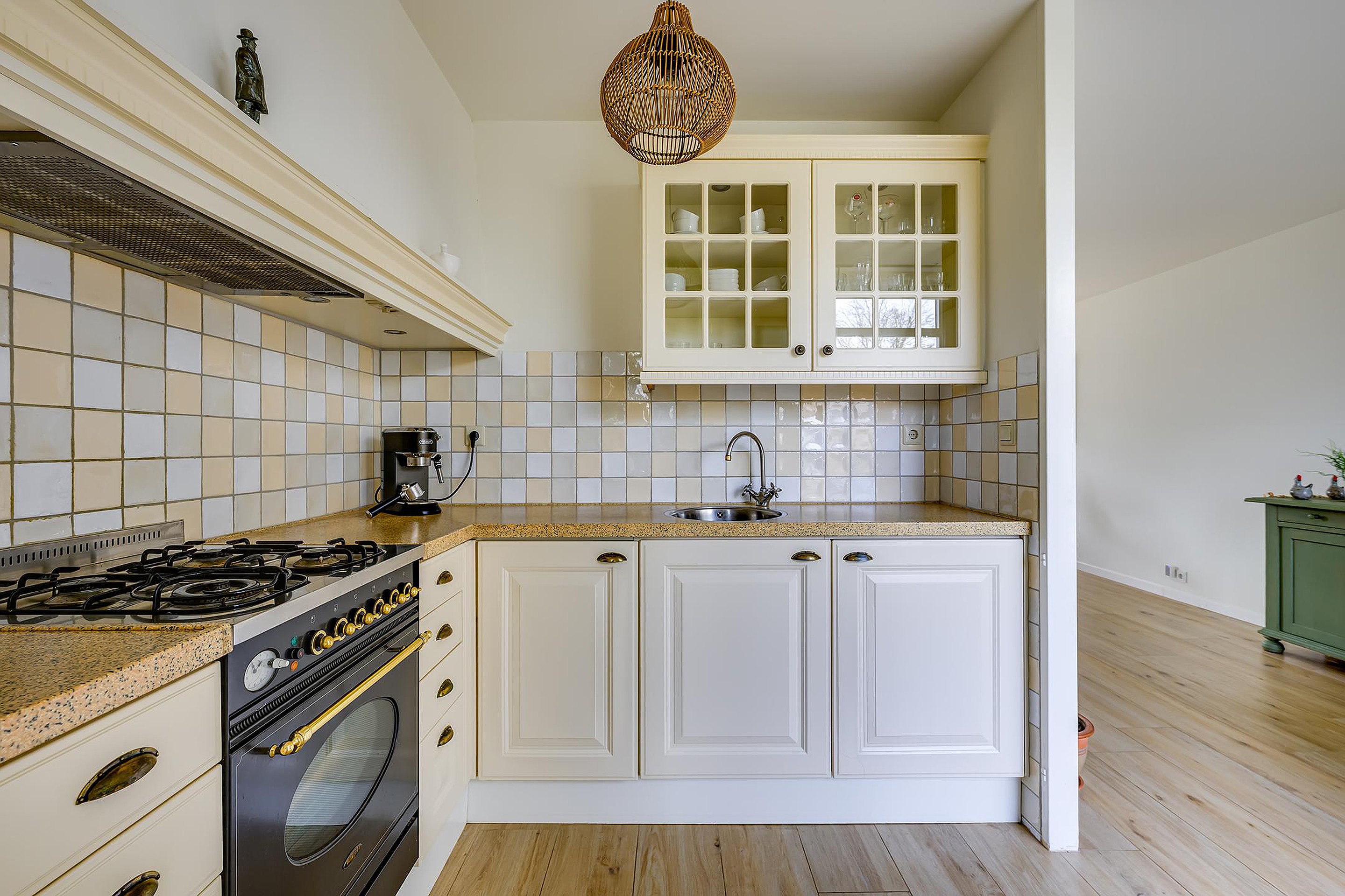 De doorzon woonkamer is heerlijk licht dankzij de grote raampartijen en heeft een warme, sfeervolle uitstraling met de speksteenkachel als echte eyecatcher. Aansluitend vind je de eetkamer en de keuken, die praktisch is ingericht en voorzien van voldoende werk- en kastruimte. Vanuit hier heb je ook toegang tot de achtertuin.